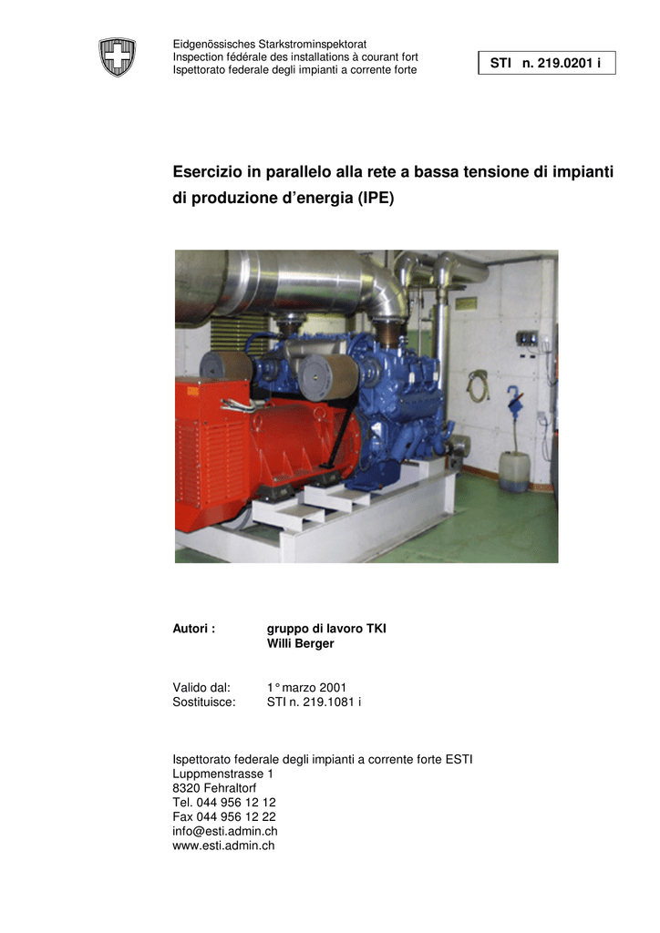 Eidgenössisches Starkstrominspektorat Inspection fédérale des installations à courant fort Ispettorato federale degli impianti a corrente forte STI n. 219.0201 i Esercizio in parallelo alla rete a bassa tensione di impianti di produzione d’energia (IPE) Autori : gruppo di lavoro TKI Willi Berger Valido dal: Sostituisce: 1° marzo 2001 STI n. 219.1081 i Ispettorato federale degli impianti a corrente forte ESTI Luppmenstrasse 1 8320 Fehraltorf Tel. 044 956 12 12 Fax 044 956 12 22 [email protected] www.esti.admin.ch Esercizio in parallelo alla rete a bassa tensione di impianti di produzione d’energia (IPE) STI n. 219.0201 i Indice pagina 1. Campo di validità 3 2. Generalità 4 3. Obbligo di presentare il progetto 5 4. Allacciamento alla rete 6 5. Dispositivi di misura e regolazione 7 6. Dispositivi di manovra 8 7. Dispositivi di protezione 9 8. Compensazione della potenza reattiva 10 9. Condizioni per la reinserzione 11 10. Ripercussioni sulla rete 12 11. Ripercussioni sugli impianti di telecomando centralizzato 14 12. Messa in servizio 15 13. Funzionamento 16 14. Esempi di esecuzione 17 Esempio 1 Esercizio in parallelo di impiantidi produzione d’energia senza funzionamento in isola 17 Generatore sincrono 17 Esempio 2 Esercizio in parallelo di impianti di produzione d’energia senza funzionamento in isola 18 Generatore asincrono 18 Esempio 3 Esercizio in parallelo di impianti di produzione d’energia con funzionamento in isola 19 Generatore sincrono 19 Esempio 4 Esercizio in parallelo di impianti di produzione d’energia dotati di ondulatori 20 Immissione trifase Schiarimenti in merito alla domanda di allacciamento per impianti di produzione d’energia Domanda di allacciamento per impianti di produzione d’energia (IPE) che funzionano in parallelo alla rete di distribuzione dell’ energia elettrica 20 22 24 __________________________________________________________________________________________ Ispettorato federale degli impianti a corrente forte pagina 2 di 24 Esercizio in parallelo alla rete a bassa tensione di impianti di produzione d’energia (IPE) STI n. 219.0201 i 1. Campo di validità La presente direttiva si applica alla pianificazione, costruzione, modernizzazione e all’esercizio di impianti di produzione d’energia (IPE) allacciati alla rete a bassa tensione del gestore di rete. Gli impianti di produzione d’energia sono ad es: - i generatori diesel d’emergenza - gli impianti ad energia idraulica - le centrali termo-elettriche a blocco (CTEB), gli impianti ad accoppiamento termico (IAT) - gli impianti ad energia eolica - gli impianti fotovoltaici L’immissione di energia elettrica può avvenire mediante generatori sincroni od asincroni con collegamento diretto o mediante ondulatore. Per l’allacciamento alla rete a media tensione vigono requisiti tecnici addizionali. __________________________________________________________________________________________ Ispettorato federale degli impianti a corrente forte pagina 3 di 24 Esercizio in parallelo alla rete a bassa tensione di impianti di produzione d’energia (IPE) STI n. 219.0201 i 2. Generalità Gli impianti di produzione d’energia vanno costruiti nel rispetto delle vigenti disposizioni e prescrizioni del gestore di rete, in modo tale da essere idonei all’esercizio in parallelo alla rete ed escludere ripercussioni perturbatrici sulla rete o altri impianti. Per la costruzione e l’esercizio degli impianti di produzione d’energia vanno osservate le seguenti leggi, prescrizioni e norme: - legge federale sugli impianti elettrici a corrente forte e a corrente debole (LIE) RS 734.0 - ordinanza sugli impianti a corrente forte (Ordinanza sulla corrente forte) (OCF) RS 734.2 - ordinanza sulla procedura d’approvazione dei piani d’impianti a corrente forte (OPCF) RS 734.25 - ordinanza concernente gli impianti elettrici a bassa tensione (OIBT) RS 734.27 - ordinanza sui prodotti elettrici a bassa tensione (OPBT) RS 734.26 - ordinanza sulla compatibilità elettromagnetica (OCEM) RS 734.5 - EN 50160 Caratteristiche della tensione nelle reti pubbliche d’energia elettrica - raccomandazione per la valutazione di ripercussioni sulla rete (ASE 2.72i) - telecomando centralizzato ad audiofrequenze (ASE 2.66i) - prescrizioni aziendali del gestore di rete Il gestore di rete può esigere che vengano apportati mutamenti e complementi ad un impianto esistente o da costruire, nella misura in cui essi sono necessari per motivi inerenti all’approvvigionamento sicuro e senza guasti, in particolare anche con riferimento alle esigenze della rete di distribuzione. __________________________________________________________________________________________ Ispettorato federale degli impianti a corrente forte pagina 4 di 24 Esercizio in parallelo alla rete a bassa tensione di impianti di produzione d’energia (IPE) STI n. 219.0201 i 3. Obbligo di presentare il progetto Per gli IPE con una potenza complessiva superiore ai 3 kVA monofase o ai 10 kVA polifase, che possono essere fatti funzionare in parallelo alla rete di distribuzione della corrente a bassa tensione, vige l’obbligo di presentazione del progetto. Prima della costruzione dell’impianto, il committente della costruzione o il proprietario dell’IPE rispettivamente il suo rappresentante deve presentare all’Ispettorato federale degli impianti a corrente forte (ESTI) un progetto conformemente all’art. 2 della OPCF e al gestore di rete una domanda di allacciamento. Si può iniziare a costruire, quando l’approvazione dei piani è passata in giudicato. L’ESTI deve essere informato per iscritto della fine della costruzione dell’impianto. Alla comunicazione va allegato un verbale di collaudo, da cui risulta che l’impianto soddisfa le esigenze poste dalla legislazione e rispetta le regole tecniche riconosciute. Per gli impianti da costruire ex novo i seguenti documenti devono essere presentati in duplice copia: - proprietario, ubicazione, genere e configur