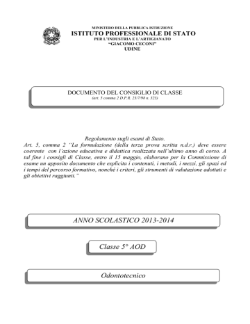 MINISTERO DELLA PUBBLICA ISTRUZIONE ISTITUTO PROFESSIONALE DI STATO PER L’INDUSTRIA E L’ARTIGIANATO “GIACOMO CECONI” UDINE DOCUMENTO DEL CONSIGLIO DI CLASSE (art. 5 comma 2 D.P.R. 23/7/98 n. 323) Regolamento sugli esami di Stato. Art. 5, comma 2 “La formulazione (della terza prova scritta n.d.r.) deve essere coerente con l’azione educativa e didattica realizzata nell’ultimo anno di corso. A tal fine i consigli di Classe, entro il 15 maggio, elaborano per la Commissione di esame un apposito documento che esplicita i contenuti, i metodi, i mezzi, gli spazi ed i tempi del percorso formativo, nonché i criteri, gli strumenti di valutazione adottati e gli obiettivi raggiunti.” ANNO SCOLASTICO 2013-2014 Classe 5° AOD Odontotecnico Pag. 2 INDICE Profilo professionale pag. 3 Quadro orario e docenti componenti il Consiglio della Classe V AOD pag. 3 Elenco candidati pag. 4 Elenco libri di testo pag. 5 Presentazione della classe pag. 6 Continuità didattica pag. 8 Programmazione educativa e didattica pag. 9 Comportamenti nei confronti della classe da parte degli insegnanti pag. 10 Finalità educative e obiettivi trasversali pag. 12 Obiettivi di apprendimento didattici e disciplinari pag. 14 Strategie messe in atto per il conseguimento degli obiettivi pag. 16 Fattori che concorrono alla valutazione periodica e finale pag. 17 Definizione dei criteri comuni per la corrispondenza pag. 18 Attività didattiche comuni programmate pag. 19 Esperienze formative realizzate e risultati ottenuti pag. 19 Obiettivi conseguiti mediamente dalla classe pag. 22 Considerazioni finali del Consiglio di Classe - Relazione pag. 23 Allegati pag. 25 Programmi svolti dai singoli Docenti Relazione finale di ciascun docente Simulazioni di prima e terza prova somministrate in corso d’anno Documento del Consiglio di classe 5a A Odontotecnico Pag. 3 PROFILO PROFESSIONALE Al termine del corso l’alunno è in grado di realizzare in ogni fase di lavorazione elementi di protesi fissa, sia singoli che a ponte, e protesi totali mobili. Inoltre ha acquisito ampia conoscenza delle protesi dentali in ceramica, della scheletrica con attacchi, dell’ortodonzia. L’odontotecnico costruisce, su modelli tratti dalle impronte fornite dagli odontoiatri, con le indicazioni del tipo di protesi da eseguire, apparecchi di protesi dentaria di qualsiasi tipo, impegnando i materiali usati nell’arte odontotecnica. QUADRO ORARIO E DOCENTI Disciplina area comune Docente Ore settimanali ITALIANO Sbrizzai Elena 4 STORIA Sbrizzai Elena 2 Altran Elena 3 Martinolli Elena 3 MATEMATICA LINGUA STRANIERA EDUCAZIONE FISICA RELIGIONE (per coloro che se ne avvalgono) Vesca Dino Amato Giuseppe Totale ore area comune 2 1 15 Disciplina area di indirizzo CHIMICA E LABORATORIO SCIENZA DEI MATERIALI DENTALI GNATOLOGIA DIRITTO COMMERCIALE, LEGISLAZIONE SOCIALE E PRATICA COMMERCIALE ESERCITAZIONI DI LABORATORIO ODONTOTECNICO Mazzeo Clementina Feruglio Grazia 6 Monte Rossella 4 Voncini Lucia 2 Malaman Andrea 9 Totale ore area di indirizzo Documento del Consiglio di classe 3 24 5a A Odontotecnico Pag. 4 CANDIDATI INTERNI 1 Candidato Cognome Nome Candusso Nicola 2 Cautero Peter 3 Cecconi Stefano 4 Chittaro Tecla 5 Comisso Desirè 6 Dal Magro Greta 7 Dimitrioski Aleksandar 8 Gjini Aleksandra 9 Gjini Emanuel 10 Harfoush Narmin Mamdouh Mahfouz Abdou 11 Kosevic Milyana 12 Kravchyshyn Ulyana 13 Krcic Zeljana 14 Moresco Elisa 15 Oshchypok Pavlo 16 Spendelhofer Ruben N. Documento del Consiglio di classe 5a A Odontotecnico Pag. 5 LIBRI DI TESTO Disciplina Testo LA LETTERATURA DEL TERZO ANNO Italiano letteratura Cioffi, Cristofori, Gavazzi Edizioni Scolastiche Bruno Mondadori IL SENSO DEL TEMPO -MANUALE DI STORIA: DAL Storia 1870 A OGGI – vol. 3 Banti Alberto Mario – Editori Laterza DENTAL TOPICS ENGLISH FOR DENTISTRY AND Inglese DENTAL TECHNOLOGY Radini Claudia Radini Valeria – Hoepli GRAMMAR AND VOCABULARY TRAINER Gallagher Angela Galuzzi Fausto – Pearson Longman ELEMENTI DI MATEMATICA A COLORI Matematica ELEMENTI DI ANALISI Sasso Leonardo – Ed. Petrini RELIGIONE E RELIGIONI TRIENNIO Religione Bocchini Sergio – EDB Ediz. Dehoniane BO (CED) BASI DELLA CHIMICA (LE) Chimica Pistarà Paolo - Atlas DIRITTO COMMERCIALE, LEGISLAZIONE SOCIALE E Diritto PRATICA COMMERCIALE 3ED (LM) Saulle R. Nouvion C. – Lucisano Editore INTRODUZIONE ALLA SCIENZA DEI MATERIALI Scienza dei Materiali DENTALI Dentali Simionato – Piccin Nuova Libraria GNATOLOGIA 1 3ED. BIOMECCANICA APPARATO Esercitazioni di STOMATOGNATICO, PROTESI, ORTOGNATODONZIA Odontotecnica Nanni C. Fini A. – Lucisano Editore GNATOLOGIA 2 FISIOPATOLOGIA, IMPLANTOPROTESI Gnatologia Nanni C. Fini A. – Lucisano Editore GNATOLOGIA 1 (vedi Esercitazioni di Odontotecnica, in uso comune) Documento del Consiglio di classe Vol. 3 3 1 2 5a A Odontotecnico Pag. 6 PRESENTAZIONE DELLA CLASSE La classe 5a A OD si compone di 16 allievi: 9 femmine e 7 maschi. Tutti gli alunni provengono dalla classe 4a A OD dell’anno precedente. Come si evidenzia dalla tabella riassuntiva seguente (storia della classe), sette allievi hanno dovuto sostenere nel precedente anno scolastico gli esami a fine agosto per colmare i debiti formativi, tutti sono stati ammessi: in dettaglio i debiti sono stati 1 (uno) in matematica, 5 (cinque) in Chimica, 1 (uno) in italiano, 7 (sette) in Scienza dei Materiali Dentali. Un allievo ha svolto un esame integrativo nel presente anno scolastico, in quanto nel corso del 2° quadrimestre dello scorso anno fino al termine dell’anno scolastico ha seguito un progetto di scambi culturali all’estero. Degli allievi che frequentano la classe quinta, nove sono in regola con il corso di studi; i restanti si dividono in due gruppi: cinque alunni, con un anno di ritardo accumulato nella loro vita scolastica, mentre due alunni presentano due anni di ritardo accumulati. Nel diagramma della pagina seguente viene schematizzato il percorso che la classe ha seguito per arrivare al termine del ciclo della scuola 