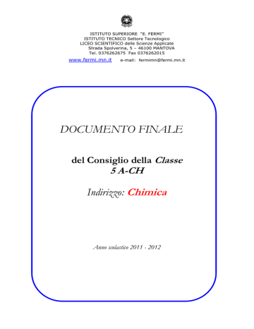 ISTITUTO SUPERIORE “E. FERMI” ISTITUTO TECNICO Settore Tecnologico LICEO SCIENTIFICO delle Scienze Applicate Strada Spolverina, 5 – 46100 MANTOVA Tel. 0376262675 Fax 0376262015 www.fermi.mn.it e-mail: [email protected] DOCUMENTO FINALE del Consiglio della Classe 5 A-CH Indirizzo: Chimica Anno scolastico 2011 - 2012 SOMMARIO 1.Prospetto delle discipline con le corrispondenti unità orarie relative a tutto il triennio ........... 3 2. Prospetto del Consiglio di classe con : docente , materia, numero di ore e continuità o meno dalla classe quarta.......................................................................................................................... 4 3. Finalità generali e profilo professionale del Perito chimico ..................................................... 5 4. Finalità ed obiettivi generali del Consiglio di Classe ................................................................ 6 5. Situazione della classe : composizione e percorso formativo ................................................... 6 6. Argomenti interdisciplinari o pluridisciplinari.......................................................................... 7 7. Attività integrative ..................................................................................................................... 7 8. Criteri di selezione dei contenuti disciplinari, metodi e strumenti, sintesi individuali dei docenti ........................................................................................................................................... 9 9. Criteri di misurazione e valutazione ......................................................................................... 10 10.Simulazioni prove scritte Esame di Stato .............................................................................. 12 11. Metodi e strumenti per il recupero ed il potenziamento ....................................................... 14 12. Esperienze di ricerca e di progetto ......................................................................................... 15 Allegato 1. Elenco Docenti/Materia e Programmi e sintesi dei criteri di scelta dei contenuti disciplinari .................................................................................................................................... 17 Allegato 2. Testi delle simulazioni della terza prova scritta Esame di Stato ........................... 35 Allegato 3. Criteri per l’assegnazione dei crediti scolastico e formativo .................................... 47 ITI- Liceo “E.Fermi” Mn Documento finale del C.d.C. VA-CH - A. s. 2010-20101 pag. 2 di 47 1. Prospetto delle discipline con le corrispondenti unità orarie relativo a tutto il triennio. Si ricorda che dalla classe quarta è stata messa in atto una riduzione dell’orario da 36 a 32 ore settimanali. Discipline del piano di studi Ore Discipline del piano Ore settimanali settimanali per di studi per anno di corso anno di corso 3^ 4^ 5^ Lingua e Lettere italiane 3 3 3 Storia Lingua straniera 2 3 2 3 2 2 Diritto / 2 2 Matematica 4 3 3 Tecnologie Chimiche indust.e lab. 3(2) 4(2) 6(2) Analisi Chimica elaborazione dati e lab. Chimica Fisica e lab. 8(6) 5(2) 5(4) 2 6(6) 2 Chimica delle Fermentazioni e lab. Chimica Organica e lab. 3(2) 5(3) 5(3) Educazione Fisica 2 2 2 Religione/Attività alternative 1 1 1 36 32 32 Area di progetto * Totale ore settimanali Dove prevista, all'area di progetto, che rappresenta un indispensabile momento di sintesi da realizzarsi con una attività progettuale interdisciplinare, deve essere destinato un numero di ore non superiore al 10% del monte ore annuo delle discipline coinvolte in questa attività. N.B. Tra parentesi sono indicate le ore di lezione laboratoriale con compresenza ITI- Liceo “E.Fermi” Mn Documento finale del C.d.C. VA-CH - A. s. 2011-2012 pag. 3 di 47 2. Prospetto del Consiglio di classe con : docente , materia, numero di ore e continuità o meno dalla classe quarta DOCENTE DISCIPLINA CONTINUITÀ CLASSE 4^ Sì/No Carli Stefano Lingua e Lettere italiane (3) Carli Stefano Storia (2) sì Portioli Luisa Lingua straniera (2) sì Milani Antonella Matematica (3) sì Grandi Mauro Tecnologie Chimiche Industriali (6) sì Toschi Giacomo Lab. Tecnologie Chimiche Industriali (2) sì Sai Carlo Chimica delle Fermentazioni (3) sì Morandini Daniele Lab. Chimica delle Fermentationi (2) si Salardi Luciano Morandini Daniele sì Analisi chimiche ed elaborazione statistica dati (6) Lab. Analisi chimiche ed elaborazione statistica dati (6) no si Valli Monica Chimica Fisica (2) no Gola Giampiero Diritto ed economia industriale (2) sì Miorali Carlo Educazione fisica (2) no Facconi Nicoletta I.R.C./Attività alternative (1) sì COMMISSARI INTERNI Grandi Mauro Portioli Luisa Sai Carlo DISCIPLINA Tecnologie Inglese Chimica Organica e fermentazioni ITI- Liceo “E.Fermi” Mn Documento finale del C.d.C. VA-CH - A. s. 2011-2012 pag. 4 di 47 3. Finalità generali e profilo professionale del Perito chimico industriale Obiettivo del curricolo è di definire una figura professionale capace di inserirsi in realtà produttive differenziate e caratterizzate da rapida evoluzione, sia dal punto di vista tecnologico, sia da quello dell'organizzazione del lavoro. Le caratteristiche generali di tale figura sono: Versatilità e propensione culturale al continuo aggiornamento; Ampio ventaglio di competenze, nonché capacità di orientamento di fronte a problemi nuovi e di adattamento alla evoluzione della professione; Capacità di cogliere la dimensione economica dei problemi. Nel settore chimico, l'obiettivo si specifica nella formazione di una accentuata attitudine ad affrontare i problemi in termini sistemici, basata su essenziali ed aggiornate conoscenze delle discipline di indirizzo, integrate da una adeguata preparazione scientifica nell'ambito tecnologico e da capacità valutative delle strutture economiche della società attuale, con particolare riferimento alle realtà aziendali. Per 
