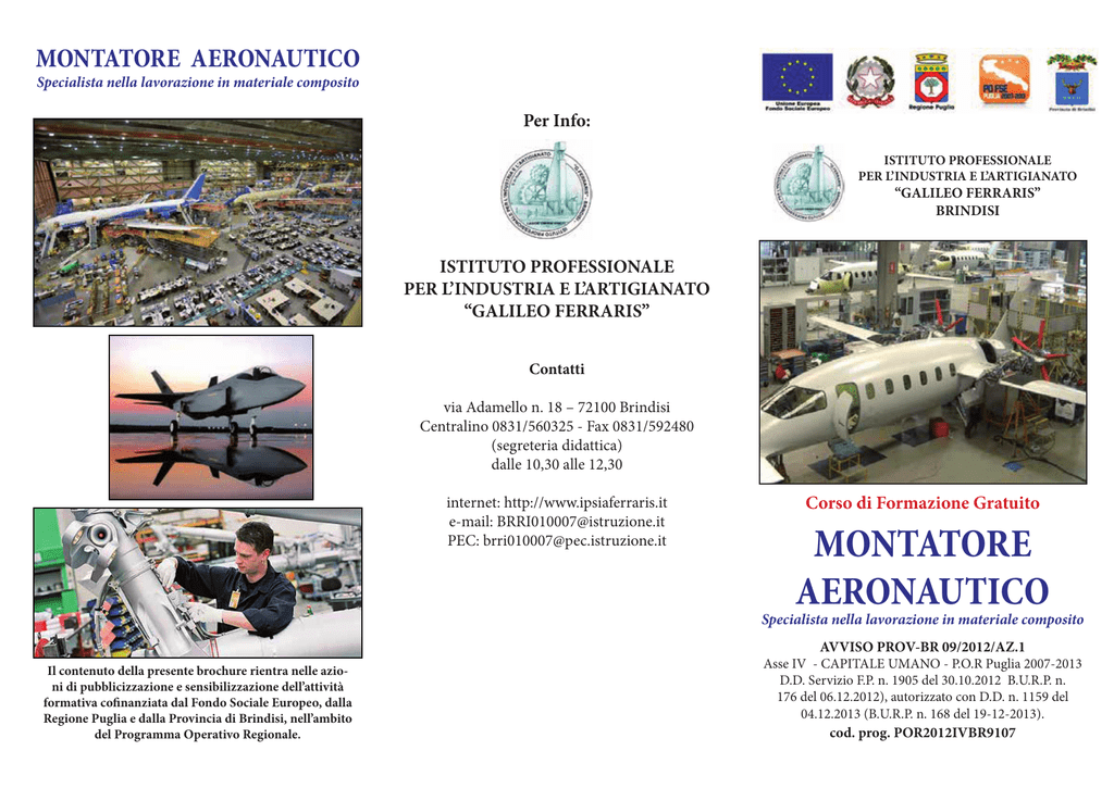 MONTATORE AERONAUTICO Specialista nella lavorazione in materiale composito Per Info: ISTITUTO PROFESSIONALE PER L’INDUSTRIA E L’ARTIGIANATO “GALILEO FERRARIS” BRINDISI ISTITUTO PROFESSIONALE PER L’INDUSTRIA E L’ARTIGIANATO “GALILEO FERRARIS” Contatti via Adamello n. 18 – 72100 Brindisi Centralino 0831/560325 - Fax 0831/592480 (segreteria didattica) dalle 10,30 alle 12,30 internet: http://www.ipsiaferraris.it e-mail: [email protected] PEC: [email protected] Corso di Formazione Gratuito MONTATORE AERONAUTICO Specialista nella lavorazione in materiale composito Il contenuto della presente brochure rientra nelle azioni di pubblicizzazione e sensibilizzazione dell’attività formativa cofinanziata dal Fondo Sociale Europeo, dalla Regione Puglia e dalla Provincia di Brindisi, nell’ambito del Programma Operativo Regionale. AVVISO PROV-BR 09/2012/AZ.1 Asse IV - CAPITALE UMANO - P.O.R Puglia 2007-2013 D.D. Servizio F.P. n. 1905 del 30.10.2012 B.U.R.P. n. 176 del 06.12.2012), autorizzato con D.D. n. 1159 del 04.12.2013 (B.U.R.P. n. 168 del 19-12-2013). cod. prog. POR2012IVBR9107 OBIETTIVI DEL PERCORSO L’IPSIA “G.Ferraris” di Brindisi con D.D. n. 1159 del 4 dicembre 2013 (B.U.R.P. n. 168 del 19-12-2013), è stato autorizzato dall’Amministrazione di Brindisi-Servizio Politiche attive del lavoro/formazione professionale alla realizzazione di un percorso formativo per MONTATORE AERONAUTICO “Specialista nella lavorazione di Componenti in materiale composito“ di cui all’ AVVISO PROV-BR 09/2012/AZ.1. Asse IV - CAPITALE UMANO - P.O.R Puglia 2007-2013 . Nelle linee programmatiche dell’ Avviso 9/2012 – Az.1 la Provincia di Brindisi intende attuare una intensa azione volta ad elevare il livello e la qualità delle competenze del capitale umano attraverso un congruo numero di progetti approvati nell’ambito del completamento della formazione di base in maniera innovativa rispetto alle precedenti programmazione.L’intervento formativo nelle sue linee programmatiche intende rendere disponibile alle aziende del territorio operanti nel settore metalmeccanico, ma ancor più in quello aeronautico, un serbatoio di risorse qualificate . Il MONTATORE AERONAUTICO “Specialista nella lavorazione di Componenti in materiale composito“ è un lavoratore qualificato che esegue, sulla base di indicazioni, disegni o schemi equivalenti, lavori di elevata precisione e di natura complessa, finalizzati alla costruzione e/o al montaggio, su banco o su macchine operatrici, di attrezzature o macchinario o loro parti. Il percorso formativo ideato, progettato e predisposto dall’IPSIA G.Ferraris” di Brindisi per MONTATORE AERONAUTICO “Specialista nella lavorazione di Componenti in materiale composito“ vuole essere una risposta efficace alla sfida dell’innovazione che coinvolge sempre di più il mondo del lavoro brindisino e, anzi, vuole utilizzare questa innovazione per incrementare conoscenze e capacità, dal momento che il contesto aziendale costituisce un ambiente di formazione efficace e non riproducibile. Di converso, le aziende, anche le piccole e medie, operanti nel settore metalmeccanico e aeronautico brindisino, potranno avere persone preparate a espletare i compiti e le mansioni aziendali per ampliare e consolidare la propria offerta generale in un settore che si caratterizza per il gap esistente tra domanda e offerta di personale qualificato. L’azione formativa è riservata a 18 allievi/e che hanno assolto l’obbligo scolastico, così come previsto dalla Legge n. 296/06 e s.m.i., residenti nella Provincia di Brindisi e con una età massima di 25 anni, iscritti nelle anagrafiche dei Centri per l’Impiego della Provincia di Brindisi. ATTIVITA’ FORMATIVA DOCUMENTAZIONE DA PRODURRE L’azione formativa è riservata a 18 allievi/e che hanno assolto l’obbligo scolastico, così come previsto dalla Legge n. 296/06 e s.m.i., residenti nella Provincia di Brindisi e con una età massima di 25 anni, iscritti nelle anagrafiche dei Centri per l’Impiego della Provincia di Brindisi. La frequenza alle attività formative è obbligatoria e non potranno ricevere l’attestazione finale i corsisti che abbiano superato il tetto massimo di assenze consentito pari al 30% delle ore totali del corso, documentato con rilevazione dal registro presenza. Le attività di formazione vera e propria della durata complessiva di 600 ore si articolerà in tre fasi: Formazione in aula/laboratorio, (270 ore) mirata a far acquisire competenze di base e trasversali, tecnico-culturali e professionalizzanti e realizzata alternando lezioni teoriche e pratiche al fine di consentire il massimo coinvolgimento da parte degli allievi e prevede i seguenti moduli; Alla domanda, prodotta su apposito modulo (pena l’esclusione) devono essere allegati i seguenti documenti: 1. Accoglienza e bilanciamento delle competenze (30 h); 2. Inglese di base e Inglese tecnico (30 h); 3. Il sistema azienda (10 h); 4. Diritto del Lavoro (10 h); 5. Prevenzione e Sicurezza sul lavoro (10 h); 6. Ambiente e sviluppo sostenibile (10 h); 7. Informatica di base (20 h) 8. Aerodinamica: struttura ed impianti del velivolo (30 h); 9. Caratteristiche dei materiali aeronautici (30 h); 10. Procedure aeronautiche e normativa (30 h); 11. Pratiche di montaggi in laboratorio attrezzato (60 h); - Nota Informativa e modalità organizzative del corso e delle eventuali attività di selezione, firmata per acettazione. Formazione in azienda (stage), (300 ore) destinata ad attivare, affinare e rendere operative competenze e abilità acquisite operando nella realtà aziendale (in aziende del settore metalmeccanico e aeronautiche); Attività di accompagnamento al lavoro, (project work) (30 ore) per porre gli allievi nelle condizioni di gestire e di programmare il proprio inserimento lavorativo. La partecipazione alle attività formative è completamente gratuita e per favorire la partecipazione, per ogni ora di presenza regolarmente rilevata, sul registr