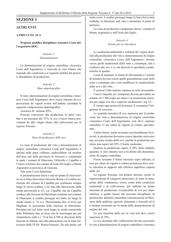 Supplemento al Bollettino Ufficiale della Regione Toscana n. 17 del 28.4.2010 SEZIONE I ALTRI ENTI A.PRO.VI.TO. SCA Proposta modifica disciplinare Ansonica Costa del l’argentario DOC. Articolo 1. Denominazione La denominazione di origine controllata «Ansonica Costa dell’Argentario» è riservata al vino bianco che risponde alle condizioni e ai requisiti stabiliti dal presente disciplinare di produzione. Articolo 2. Base ampelografica Il vino a denominazione di origine controllata «Ansonica Costa dell’Argentario» deve essere ottenuto da uve provenienti da vigneti aventi nell’ambito aziendale la seguente composizione ampelografica: Ansonica B.: minimo 85%. Possono concorrere alla produzione di detto vino, fino a un massimo del 15%, le uve a bacca bianca provenienti da altri vitigni idonei alla coltivazione per la regione Toscana. Articolo 3. Zona di produzione delle uve La zona di produzione del vino a denominazione di origine controllata «Ansonica Costa dell’Argentario» è ubicata nella parte collinare, pedecollinare ed insulare dell’area sud della provincia di Grosseto e comprende in parte i comuni di Manciano, Orbetello e Capalbio e l’intero territorio dei comuni di Isola del Giglio e Monte Argentario in provincia di Grosseto. Tale zona è così delimitata: la perimetrazione inizia a sud nel punto di intersezione tra la linea ferroviaria Grosseto-Roma e il confine territoriale del comune di Capalbio per continuare sempre lungo lo stesso confine, a est sino alla intersezione della strada provinciale n. 63, s.p. Capalbio che da Capalbio conduce alla frazione di Marsiliana ricadente nel comune di Manciano; il confine prosegue nel tratto est lungo la strada statale n. 74 (s.s. Maremmana) fino al bivio per Magliano in prossimità della frazione di Marsiliana. Prosegue poi nel tratto nord lungo la strada consorziale delle Pulledraie fino al fosso che la interrompe per poi reimmettersi sulla s.s. 74 al km 8,700 in direzione della frazione di Albinia sino alla intersezione con la linea ferroviaria delle FF.SS. Roma-Grosseto. Da tale punto, nel 3 tratto ovest, il confine prosegue lungo la linea ferroviaria suddetta, in direzione sud, sino a incontrare il punto di partenza. La zona di produzione comprende altresì i comuni di Monte Argentario e dell’Isola del Giglio. Articolo 4. Norme per la viticoltura Le condizioni ambientali e colturali dei vigneti destinati alla produzione del vino a denominazione di origine controllata «Ansonica Costa dell’Argentario» devono essere quelle tradizionali della zona e, comunque, atte a conferire alle uve e ai vini derivati le specifiche caratteristiche di qualità. I sesti di impianto, le forme di allevamento e i sistemi di potatura devono essere quelli generalmente usati nella zona o comunque atti a non modificare le caratteristiche delle uve e del vino. È escluso l’allevamento espanso su tetto orizzontale. I nuovi impianti ed i reimpianti devono prevedere un minimo di 3.300 ceppi per ettaro e la produzione massima per ceppo non deve superare mediamente i kg 3,5. È vietata ogni pratica di forzatura. È consentita l’irrigazione di soccorso. La quantità massima di uva ammessa per la produzione del vino a denominazione di origine controllata «Ansonica Costa dell’Argentario» non deve superare tonnellate 11 per ettaro di vigneto in coltura specializzata. A detto limite, anche in annate eccezionalmente favorevoli, le produzioni dovranno essere riportate attraverso una accurata cernita delle uve, purchè la produzione per ettaro non superi del 20% il limite medesimo. Qualora la produzione superi il 20% delle suddette quantità, il vino ottenuto non avrà diritto alla denominazione di origine controllata. Fermo restando il limite massimo sopra indicato, la resa per ettaro di vigneto a coltura promiscua deve essere calcolata in rapporto alla effettiva superficie coperta dalle viti. La regione Toscana, con proprio decreto, sentite le organizzazioni di categoria interessate, di anno in anno, prima della vendemmia, tenuto conto delle condizioni ambientali e di coltivazione, pur stabilire un limite massimo di produzione rivendicabile di uva per ettaro inferiore a quello fissato dal presente disciplinare di produzione, dandone immediata comunicazione al Ministero delle politiche agricole alimentari e forestali ed al Comitato nazionale per la tutela delle denominazioni di origine dei vini. La resa massima delle uve in vino non deve essere superiore al 70%. Le uve destinate alla vinificazione devono assicurare al vino a denominazione di origine controllata «Ansonica 4 Supplemento al Bollettino Ufficiale della Regione Toscana n. 17 del 28.4.2010 Costa dell’Argentario» un titolo alcolometrico volumico naturale minimo di 10,50%. Articolo 5. Norme per la vinificazione Nella vinificazione sono ammesse soltanto le pratiche enologiche locali, leali e costanti atte a conferire al vino a denominazione di origine controllata «Ansonica Costa dell’Argentario» le sue peculiari caratteristiche. La vinificazione delle uve per la produzione del vino a denominazione di origine «Ansonica Costa dell’Argentario» deve essere effettuata nell’ambito dell’intero territorio dei comuni di cui al precedente art. 3. Tuttavia, tenuto conto delle situazioni tradizionali di produzione il Ministero delle politiche agricole alimentari e forestali, sentito il parere del Comitato nazionale per la tutela e la valorizzazione delle denominazioni di origine e delle indicazioni geografiche tipiche dei vini, pur consentire su apposita domanda delle ditte interessate che le suddette operazioni di vinificazione siano effettuate nell’ambito della provincia di Grosseto, a condizione che le ditte interessate dimostrino di aver tradizionalmente vinificato le uve prodotte nella zona nelle cantine per le quali si chiede l’autorizzazione. È consentito l’arricchimento, nei limiti e condizioni stabilite dalle norme comunitarie e nazionali, con mosti concentrati ottenuti