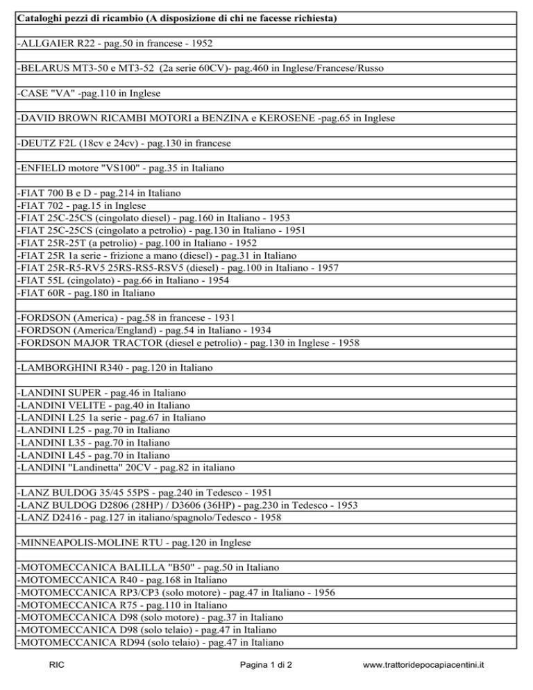 Cataloghi pezzi di ricambio (A disposizione di chi ne facesse richiesta) -ALLGAIER R22 - pag.50 in francese - 1952 -BELARUS MT3-50 e MT3-52 (2a serie 60CV)- pag.460 in Inglese/Francese/Russo -CASE "VA" -pag.110 in Inglese -DAVID BROWN RICAMBI MOTORI a BENZINA e KEROSENE -pag.65 in Inglese -DEUTZ F2L (18cv e 24cv) - pag.130 in francese -ENFIELD motore "VS100" - pag.35 in Italiano -FIAT 700 B e D - pag.214 in Italiano -FIAT 702 - pag.15 in Inglese -FIAT 25C-25CS (cingolato diesel) - pag.160 in Italiano - 1953 -FIAT 25C-25CS (cingolato a petrolio) - pag.130 in Italiano - 1951 -FIAT 25R-25T (a petrolio) - pag.100 in Italiano - 1952 -FIAT 25R 1a serie - frizione a mano (diesel) - pag.31 in Italiano -FIAT 25R-R5-RV5 25RS-RS5-RSV5 (diesel) - pag.100 in Italiano - 1957 -FIAT 55L (cingolato) - pag.66 in Italiano - 1954 -FIAT 60R - pag.180 in Italiano -FORDSON (America) - pag.58 in francese - 1931 -FORDSON (America/England) - pag.54 in Italiano - 1934 -FORDSON MAJOR TRACTOR (diesel e petrolio) - pag.130 in Inglese - 1958 -LAMBORGHINI R340 - pag.120 in Italiano -LANDINI SUPER - pag.46 in Italiano -LANDINI VELITE - pag.40 in Italiano -LANDINI L25 1a serie - pag.67 in Italiano -LANDINI L25 - pag.70 in Italiano -LANDINI L35 - pag.70 in Italiano -LANDINI L45 - pag.70 in Italiano -LANDINI "Landinetta" 20CV - pag.82 in italiano -LANZ BULDOG 35/45 55PS - pag.240 in Tedesco - 1951 -LANZ BULDOG D2806 (28HP) / D3606 (36HP) - pag.230 in Tedesco - 1953 -LANZ D2416 - pag.127 in italiano/spagnolo/Tedesco - 1958 -MINNEAPOLIS-MOLINE RTU - pag.120 in Inglese -MOTOMECCANICA BALILLA "B50" - pag.50 in Italiano -MOTOMECCANICA R40 - pag.168 in Italiano -MOTOMECCANICA RP3/CP3 (solo motore) - pag.47 in Italiano - 1956 -MOTOMECCANICA R75 - pag.110 in Italiano -MOTOMECCANICA D98 (solo motore) - pag.37 in Italiano -MOTOMECCANICA D98 (solo telaio) - pag.47 in Italiano -MOTOMECCANICA RD94 (solo telaio) - pag.47 in Italiano RIC Pagina 1 di 2 www.trattoridepocapiacentini.it Cataloghi pezzi di ricambio (A disposizione di chi ne facesse richiesta) -MOTOMECCANICA R108 - pag.108 in Italiano -OM mod.513R - pag.270 in Italiano - 1961 -OM mod.512R - pag.140 in Italiano - 1959 -OM mod.35/40R - pag.70 in Italiano - 1953 -OM mod.45R - pag.80 in Italiano - 1957 -OM mod.50R - pag.150 in Italiano -OM 615 - pag.350 in Italiano/Inglese/Tedesco/Francese/Spagnolo -ORSI ARTIGLIO - pag.44 in Italiano -ORSI SUPERORSI - pag.55 in Italiano -PAVESI P4 100 -modelli PC26-PC30-PC30A (militare) - pag.143 in Italiano - 1937 -PERKINS Motore serie 4/270 - pag.40 in Francese -PERKINS Motore P6(TA) diesel per Fordson Major - pag.56 in Inglese -SCHLUTER AS30 - pag.100 in Tedesco -SAME DA25 e DA25 DT - pag.50 in Italiano -SAME 360 (62HP) - pag.130 in Italiano - 1959 -SAMETTO 120 - 22HP - pag.110 in Italiano -SAMETTO 120 - 21HP - pag.58 in Italiano - 1960 -SAMETTO 18HP - pag.100 in Italiano - 1957 -STEYR 180 (30HP) - pag.100 in Tedesco -STEYR 80u, 80a (15HP) - pag.96 in Tedesco - 1956 RIC Pagina 2 di 2 www.trattoridepocapiacentini.it