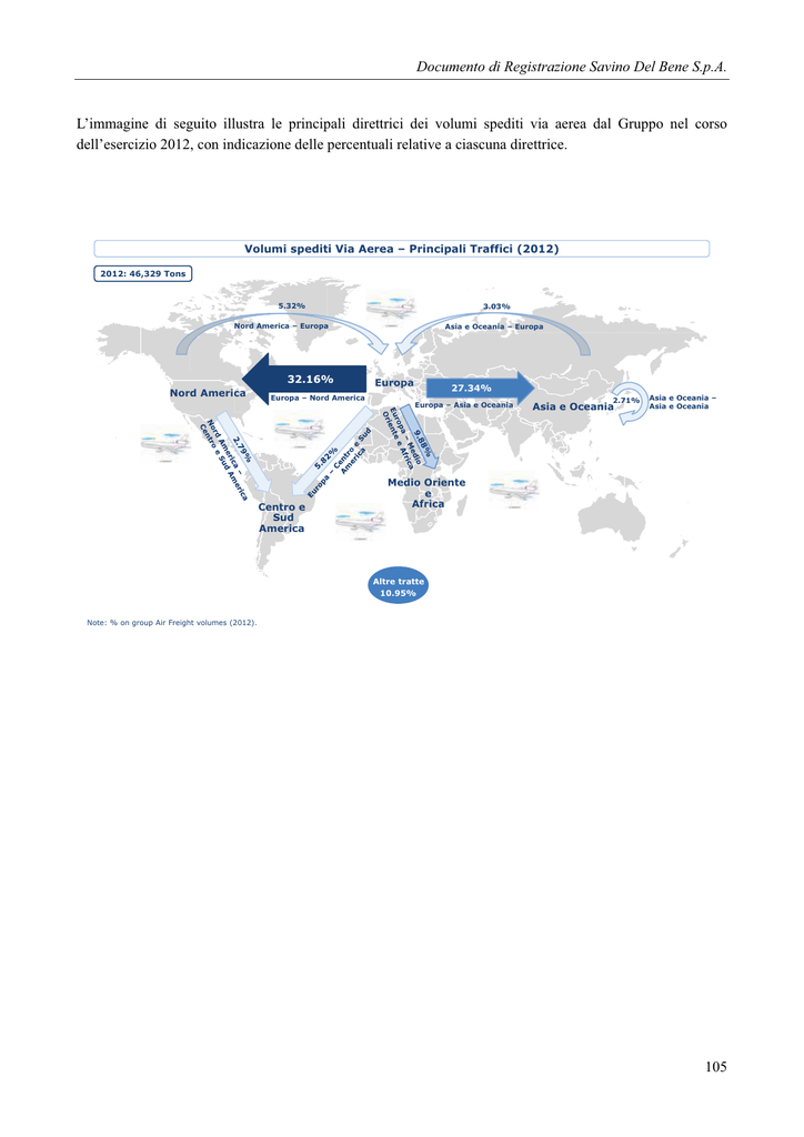 Documento di Registrazione Savino Del Bene S.p.A. L’immagine di seguito illustra le principali direttrici dei volumi spediti via aerea dal Gruppo nel corso dell’esercizio 2012, con indicazione delle percentuali relative a ciascuna direttrice. Volumi spediti Via Aerea – Principali Traffici (2012) 2012: 46,329 Tons 5.32% 3.03% Nord America – Europa 32.16% Nord America Europa – Nord America Centro e Sud America Asia e Oceania – Europa Europa 27.34% Europa – Asia e Oceania 2.71% Asia e Oceania Asia e Oceania – Asia e Oceania Medio Oriente e Africa Altre tratte 10.95% Note: % on group Air Freight volumes (2012). 105 Documento di Registrazione Savino Del Bene S.p.A. Le tabelle che seguono riportano i flussi dei volumi spediti via mare e via aerea tra le diverse aree geografiche al 31 dicembre 2012, al 31 dicembre 2011, al 31 dicembre 2010, nonché al 30 giugno 2013 e al 30 giugno 2012. SPEDIZIONI VIA-MARE TEU % sul al 30 totale giugno 2013 62.049 35,80% 10.679 6,16% 18.272 10,54% 18.172 10,48% 3.601 2,08% 2.296 1,32% 3.694 2,13% 11.052 6,38% 1.046 0,60% 221 0,13% 271 0,16% Europa – Nord America Europa – Centro e Sud America Europa – Asia e Oceania Europa – Medio Oriente e Africa Nord America – Europa Nord America – Centro e Sud America Nord America – Asia e Oceania Centro e Sud America – Nord America Centro e Sud America – Europa Centro e Sud America – Asia e Oceania Centro e Sud America – Medio Oriente e Africa Asia e Oceania – Europa 11.039 Asia e Oceania – Nord America 9.846 Asia e Oceania – Centro e Sud America 4.864 Asia e Oceania – Medio Oriente e Africa 4.109 Medio Oriente e Africa – Europa 285 Altre tratte 475 Tratte Intra – area 11.355 Totale 173.326 TEU al 30 giugno 2012 59.847 11.374 16.920 16.931 2.289 2.519 3.412 7.833 1.277 172 373 % sul totale 35,60% 6,77% 10,06% 10,07% 1,36% 1,50% 2,03% 4,66% 0,76% 0,10% 0,22% 6,37% 12.110 7,20% 5,68% 8.155 4,85% 2,81% 6.574 3,91% 2,37% 4.815 2,86% 0,16% 129 0,08% 0,27% 533 0,32% 6,56% 12.851 7,65% 100% 168.114 100,00% TEU al 31 dicembre 2012 119.775 23.750 37.120 35.191 7.386 5.641 7.063 19.819 2.381 528 806 % sul totale 34,55% 6,85% 10,71% 10,15% 2,13% 1,63% 2,04% 5,72% 0,69% 0,15% 0,23% 20.573 5,93% 21.295 6,14% 12.317 3,55% 7.674 2,21% 281 0,08% 1.273 0,37% 23.817 6,87% 346.690 100,00% TEU al 31 dicembre 2011 112.230 22.635 32.645 31.119 5.389 6.434 7.518 15.147 3.087 523 1.940 % sul totale 35,19% 7,10% 10,23% 9,76% 1,69% 2,02% 2,36% 4,75% 0,97% 0,16% 0,61% 20.298 6,36% 15.963 5,00% 13.208 4,14% 6.876 2,16% 306 0,10% 1.671 0,52% 21.941 6,88% 318.930 100,00% TEU al 31 dicembre 2010 104.450 19.442 32.350 27.195 4.077 6.197 5.419 17.287 3.220 1.183 1.277 % sul totale 35,32% 6,57% 10,94% 9,20% 1,38% 2,10% 1,83% 5,85% 1,09% 0,40% 0,43% 18.220 6,16% 15.485 5,24% 11.102 3,75% 4.197 1,42% 1.127 0,38% 886 0,30% 22.602 7,64% 295.716 100,00% % sul % sul KG/000 % sul KG/000 % sul KG/000 KG/000 % sul KG/000 totale totale al 31 totale al 31 totale al 31 al 30 al 30 totale dicembre dicembre dicembre giugno giugno 2010 2011 2012 2012 2013 Europa – Nord America 7.120 31,04% 7.173 32,14% 14.900 32,16% 14.517 32,41% 14.480 30,57% Europa – Centro e Sud America 1.098 4,79% 1.060 4,75% 2.698 5,82% 2.145 4,79% 2.464 5,20% Europa – Asia e Oceania 6.360 27,73% 5.996 26,87% 12.666 27,34% 11.806 26,36% 11.134 23,51% Europa – Medio Oriente e Africa 2.302 10,04% 2.112 9,46% 4.579 9,88% 4.328 9,66% 3.544 7,48% Nord America – Europa 2.114 9,21% 1.409 6,31% 2.466 5,32% 2.482 5,54% 4.030 8,51% Nord America – Centro e Sud America 446 1,94% 629 2,82% 1.293 2,79% 1.578 3,52% 1.393 2,94% Nord America – Asia e Oceania 342 1,49% 284 1,27% 1.155 2,49% 491 1,10% 422 0,89% Centro e Sud America – Nord America 175 0,76% 238 1,07% 322 0,70% 379 0,85% 266 0,56% Centro e Sud America – Europa 38 0,17% 44 0,20% 84 0,18% 179 0,40% 117 0,25% Centro e Sud America – Asia e Oceania 46 0,20% 48 0,22% 100 0,22% 134 0,30% 238 0,50% Centro e Sud America – Medio Oriente e 47 0,20% 12 0,05% 21 0,04% 28 0,06% 13 0,03% Africa Asia e Oceania – Europa 735 3,21% 731 3,28% 1.404 3,03% 1.534 3,42% 2.046 4,32% Asia e Oceania – Nord America 595 2,60% 496 2,22% 972 2,10% 775 1,73% 951 2,01% Asia e Oceania – Centro e Sud America 67 0,29% 129 0,58% 318 0,69% 608 1,36% 628 1,33% Asia e Oceania – Medio Oriente e Africa 251 1,09% 384 1,72% 639 1,38% 510 1,14% 762 1,61% Medio Oriente e Africa – Europa 30 0,13% 38 0,17% 73 0,16% 31 0,07% 167 0,35% Altre tratte 93 0,40% 97 0,43% 263 0,57% 500 1,12% 339 0,72% Tratte Intra – area 1.080 4,71% 1.436 6,44% 2.376 5,13% 2.761 6,17% 4.366 9,22% Totale 22.940 100% 22.316 100,00% 46.329 100,00% 44.786 100,00% 47.360 100,00% SPEDIZIONI VIA-AEREA 106 Documento di Registrazione Savino Del Bene S.p.A. Nella tabella seguente si riporta la ripartizione complessiva dei ricavi delle vendite e delle prestazioni del Gruppo per ciascuna linea di servizio nei periodi di riferimento. (Euro migliaia) Spedizioni via mare Spedizioni via aerea Spedizioni via terra Altri servizi Ricavi(*) % su 31 30 % su 30 % su 31 % su 31 ricavi dicembre giugno ricavi giugno ricavi dicembre ricavi dicembre 2011 2010 2013 2012 2012 348.088 72,40% 330.126 70,65% 712.215 72,64% 593.689 69,06% 533.548 95.389 19,84% 94.314 20,18% 189.179 19,29% 185.646 21,59% 139.256 12.481 2,60% 11.429 2,45% 23.746 2,42% 23.314 2,71% 22.536 24.802 5,16% 31.429 6,73% 55.325 5,64% 57.050 6,64% 105.122 480.760 100,00% 467.298 100,00% 980.465 100,00% 859.699 100,00% 800.462 % su ricavi 66,66% 17,40% 2,82% 13,13% 100,00% (*) Si rileva che tale ripartizione è da intendersi già al netto delle elisioni di consolidamento operate su ricavi intra-Gruppo, in sede di elaborazione del Bilancio Consolidato, a seguito dell’aggregazione dei Bilanci civilistici delle singole società rientranti nel perimetro di consolidamento. La seguente tabella sintetizza i principali dati di traffico a livello globale, in termini di volumi di merce spedita via mare e via aere