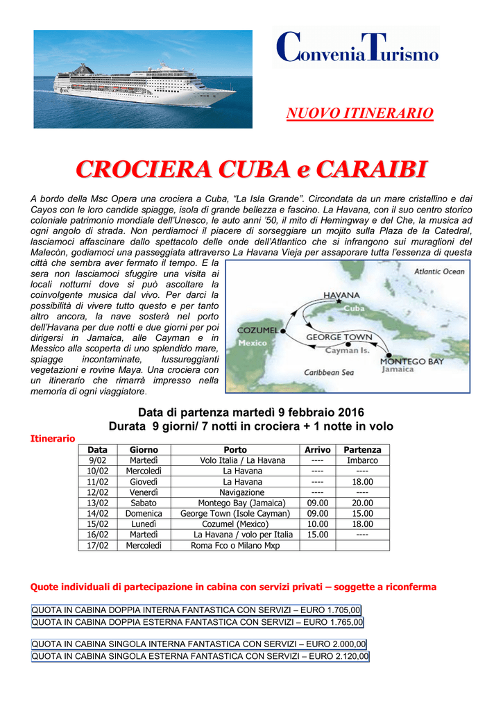 NUOVO ITINERARIO CROCIERA CUBA e CARAIBI A bordo della Msc Opera una crociera a Cuba, “La Isla Grande”. Circondata da un mare cristallino e dai Cayos con le loro candide spiagge, isola di grande bellezza e fascino. La Havana, con il suo centro storico coloniale patrimonio mondiale dell’Unesco, le auto anni ’50, il mito di Hemingway e del Che, la musica ad ogni angolo di strada. Non perdiamoci il piacere di sorseggiare un mojito sulla Plaza de la Catedral, lasciamoci affascinare dallo spettacolo delle onde dell’Atlantico che si infrangono sui muraglioni del Malecòn, godiamoci una passeggiata attraverso La Havana Vieja per assaporare tutta l’essenza di questa città che sembra aver fermato il tempo. E la sera non lasciamoci sfuggire una visita ai locali notturni dove si può ascoltare la coinvolgente musica dal vivo. Per darci la possibilità di vivere tutto questo e per tanto altro ancora, la nave sosterà nel porto dell’Havana per due notti e due giorni per poi dirigersi in Jamaica, alle Cayman e in Messico alla scoperta di uno splendido mare, spiagge incontaminate, lussureggianti vegetazioni e rovine Maya. Una crociera con un itinerario che rimarrà impresso nella memoria di ogni viaggiatore. Data di partenza martedì 9 febbraio 2016 Durata 9 giorni/ 7 notti in crociera + 1 notte in volo Itinerario Data 9/02 10/02 11/02 12/02 13/02 14/02 15/02 16/02 17/02 Giorno Martedì Mercoledì Giovedì Venerdì Sabato Domenica Lunedì Martedì Mercoledì Porto Volo Italia / La Havana La Havana La Havana Navigazione Montego Bay (Jamaica) George Town (Isole Cayman) Cozumel (Mexico) La Havana / volo per Italia Roma Fco o Milano Mxp Arrivo ------------09.00 09.00 10.00 15.00 Partenza Imbarco ---18.00 ---20.00 15.00 18.00 ---- Quote individuali di partecipazione in cabina con servizi privati – soggette a riconferma QUOTA IN CABINA DOPPIA INTERNA FANTASTICA CON SERVIZI – EURO 1.705,00 QUOTA IN CABINA DOPPIA ESTERNA FANTASTICA CON SERVIZI – EURO 1.765,00 QUOTA IN CABINA SINGOLA INTERNA FANTASTICA CON SERVIZI – EURO 2.000,00 QUOTA IN CABINA SINGOLA ESTERNA FANTASTICA CON SERVIZI – EURO 2.120,00 La quota comprende: - Volo Air Europa Roma Fiumicino/La Havana a/r - Trasferimenti aeroporto/porto/aeroporto - Sistemazione in cabina secondo la categoria prescelta - Pensione completa a bordo: prima colazione, pranzo, cena, buffet vari - Cocktail di Benvenuto riservato al gruppo - Intrattenimenti e spettacoli - Quote d’iscrizione - Assicurazione medico-bagaglio-annullamento - Facchinaggi nei porti di imbarco e sbarco - Accompagnatrice per tutta la durata del viaggio La quota non comprende: - Adeguamento carburante (se richiesto) - Escursioni facoltative - Spese personali - Bevande (a bordo disponibili pacchetti scontati e diversificati) - Quota di Servizio (facoltativa da pagare a bordo) € 8.5 a notte ad adulto, € 4.25 a notte dai 3 ai 14 anni, non dovuta sotto i 3 anni - Visto Turistico per doppio ingresso a Cuba (€ 50,00/60,00 circa da liquidare al saldo crociera) - Tutto quanto non specificato nella voce “la quota comprende” Possibilità di prenotare le escursioni prima della partenza effettuando un prepagato DOCUMENTO: PASSAPORTO con validità residua di almeno sei mesi dalla fine della crociera. Operativo voli soggetti a riconferma: Roma Fiumicino Air Europa via Madrid Orari espressi in local time 09/02/2016 09/02/2016 16/02/2016 17/02/2016 ROMA FCO – MADRID MADRID - LA HAVANA LA HAVANA – MADRID MADRID – ROMA FCO 10.30/13.10 15.15/20.00 21.50/13.00 (+1) (arrivo giorno successivo) 15.00/17.25 *Milano Malpensa Charter Meridiana - Orari espressi in local time Il volo da Milano ha una riduzione di € 99 rispetto alla quota da Roma 09/02/2016 IG 3506 MILANO MXP – LA HAVANA 16/02/2016 IG 3507 LA HAVANA – MILANO MXP 14,00/19,40 21,10/13,00 (+1) (arrivo giorno successivo) RINUNCE E PENALI: Quote iscrizione e assicurazione dal giorno della prenotazione del viaggio fino a 61 giorni lavorativi dalla data di partenza 35% prezzo crociera + iscrizione e assicurazione da 60 a 45 giorni lavorativi dalla data di partenza 50% prezzo crociera + quota iscrizione e assicurazione da 44 a 30 giorni lavorativi dalla data di partenza 75% prezzo crociera + quota iscrizione e assicurazione da 29 a 10 giorni lavorativi dalla data di partenza 100% prezzo crociera + quota iscrizione e assicurazione da 9 giorni lavorativi al giorno di partenza N.B.: A prescindere dalle penali sopra riportate, in caso di annullamento potrebbe essere richiesta dalla compagnia aerea un’ulteriore penale relativa al solo volo. Organizzazione tecnica: Convenia Turismo – tel 06 86 39 95 69 – 348 33 61 877 [email protected] Modalità di pagamento: acconto pari al 70% della quota di partecipazione all’atto dell’adesione, saldo entro il 30/12/2015 con bonifico bancario intestato a: Convenia Turismo di Maria Laura De Angelis IBAN IT 77 E 01030 03256 000000017094 - MONTE DEI PASCHI DI SIENA AG. 56