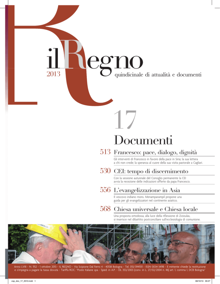 Anno LVIII - N. 1152 - 1 ottobre 2013 - IL REGNO - Via Scipione Dal Ferro 4 - 40138 Bologna - Tel. 051/3941511 - ISSN 0034-3498 - Il mittente chiede la restituzione