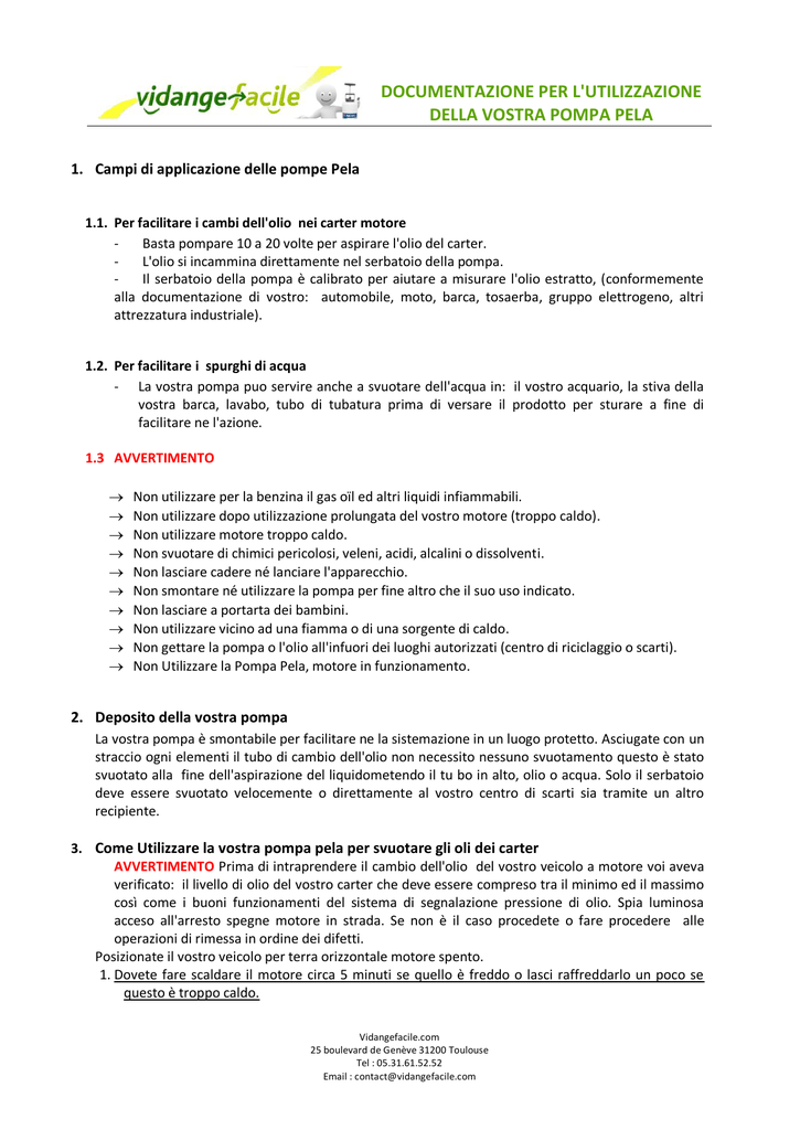 DOCUMENTAZIONE PER L'UTILIZZAZIONE DELLA VOSTRA POMPA PELA 1. Campi di applicazione delle pompe Pela 1.1. Per facilitare i cambi dell'olio nei carter motore Basta pompare 10 a 20 volte per aspirare l'olio del carter. L'olio si incammina direttamente nel serbatoio della pompa. Il serbatoio della pompa è calibrato per aiutare a misurare l'olio estratto, (conformemente alla documentazione di vostro: automobile, moto, barca, tosaerba, gruppo elettrogeno, altri attrezzatura industriale). 1.2. Per facilitare i spurghi di acqua - La vostra pompa puo servire anche a svuotare dell'acqua in: il vostro acquario, la stiva della vostra barca, lavabo, tubo di tubatura prima di versare il prodotto per sturare a fine di facilitare ne l'azione. 1.3 AVVERTIMENTO Non utilizzare per la benzina il gas oïl ed altri liquidi infiammabili. Non utilizzare dopo utilizzazione prolungata del vostro motore (troppo caldo). Non utilizzare motore troppo caldo. Non svuotare di chimici pericolosi, veleni, acidi, alcalini o dissolventi. Non lasciare cadere né lanciare l'apparecchio. Non smontare né utilizzare la pompa per fine altro che il suo uso indicato. Non lasciare a portarta dei bambini. Non utilizzare vicino ad una fiamma o di una sorgente di caldo. Non gettare la pompa o l'olio all'infuori dei luoghi autorizzati (centro di riciclaggio o scarti). Non Utilizzare la Pompa Pela, motore in funzionamento. 2. Deposito della vostra pompa La vostra pompa è smontabile per facilitare ne la sistemazione in un luogo protetto. Asciugate con un straccio ogni elementi il tubo di cambio dell'olio non necessito nessuno svuotamento questo è stato svuotato alla fine dell'aspirazione del liquidometendo il tu bo in alto, olio o acqua. Solo il serbatoio deve essere svuotato velocemente o direttamente al vostro centro di scarti sia tramite un altro recipiente. 3. Come Utilizzare la vostra pompa pela per svuotare gli oli dei carter AVVERTIMENTO Prima di intraprendere il cambio dell'olio del vostro veicolo a motore voi aveva verificato: il livello di olio del vostro carter che deve essere compreso tra il minimo ed il massimo così come i buoni funzionamenti del sistema di segnalazione pressione di olio. Spia luminosa acceso all'arresto spegne motore in strada. Se non è il caso procedete o fare procedere alle operazioni di rimessa in ordine dei difetti. Posizionate il vostro veicolo per terra orizzontale motore spento. 1. Dovete fare scaldare il motore circa 5 minuti se quello è freddo o lasci raffreddarlo un poco se questo è troppo caldo. Vidangefacile.com 25 boulevard de Genève 31200 Toulouse Tel : 05.31.61.52.52 Email : [email protected] 2. Dopo avere raccolto la vostra pompa, inserite delicatamente il tubo della pompa fino a puntellare sul fondo del carter in luogo e poni della sonda ad olio. Tutto questo conformemente alla documentazione descritta sul suo cartone di imballaggio e di deposito. Nota la misura ad olio è posizionata spesso vicino al sistema di scappamento siate prudente al momento delle manipolazioni se questo sistema è ancora troppo caldo. 3. Azionate una decina di volta la pompo facendo fare un movimento verticale dell'alto verso il basso della Pompa Pela. L' Olio è aspirato in alcuni minuti. 4. Verificate la quantità di olio prelevato dalla Pompa Pela (quella è graduata in litro). Il valore misurato deve essere più o meno quella scritta nella documentazione del vostro motore sotto il rubrica "Rinnovo dell'olio motore" senza filtro. Se no ricominciate le operazioni 3 e 4 assicurandovi che il tubo plastico non sia piantato troppo né troppo poco nel carter. 5. Facoltativo (La capacità della vostra pompa è inferiore alla quantità di olio a svuotare). Quando il serbatoio della pompa Pela è pieno, svitate il tappo della pompa, travasate delicatamente l'olio in un bidone ermetico e richiudete il tappo della vostra pompa come indicato sul cartone di imballaggio della Pompa Pela che utilizzate. Ricominciate in 3. 6. Cambiare il filtro ha olio (facoltativo), riportatevi al libretto di utilizzazione del vostro motore. 7. Il cambio dell'olio è finito. Dovete riempire il carter del vostro motore con un nuovo olio. Per sapere quale olio conviene al vostro motore vi riportate al libretto di utilizzazione di vostro motore. 8. Con l'aiuto di un imbuto riempite il carter, come indicato nel libretto di utilizzazione del vostro motore. Rispettate la quantità del olio nuovo consigliato dal costruttore. Aspettate due a tre minuti che l'olio giunga fino al carter. 9. Verificate con la sonda ad olio del veicolo, il livello deve essere tra il mini ed i maxi se no dattate il valore per aggiunta o soppressione della quantità necessaria. Non dimenticate di pulire la sonda tra ogni misure. 10. Ricollocate la vostra sonda di olio, avviare il motore , verificate il buono funzionamento. 4. Come utilizzare la vostra pompa pela per svuotare l'acqua Raccogliete la vostra pompa conformemente alla documentazione descritta sul suo cartone di imballaggio e di deposito. 1. Assicuratevi che l'acqua a svuotare non sia calda, se è il caso lasciare raffreddarla. 2. Inserite delicatamente il tubo della Pompa Pelò nel contenente di acqua a svuotare (acquario, lavabo, bagno) e mantenete il così sempre in contatto con l'acqua. 3. Azionate una decina di volta la pompa facendo fare un movimento verticale dell'alto verso il basso della Pompa Pela. L' acqua è aspirata in alcuni minuti. 4. Durante l'aspirazione verificate il serbatoio della pompa Pela, quando è pieno, togliete il tubo di scarico fuori dall'acqua, svitate il tappo della pompa, svuotate l'acqua e richiudete il tappo come indicato sul cartone di imballaggio della Pompa Pela che utilizzate.. Vidangefacile.com 25 boulevard de Genève 31200 Toulouse Tel : 05.31.61.52.52 Email : [email protected] 5. Ricominciate le operazioni 2 a 5 se è necessario finché tutta l'acqua del vostro contenente sia svuotata. 6. Il scarico è finito. Vidangefacile.com 25 boulevard de Genève 31200 Toulous
