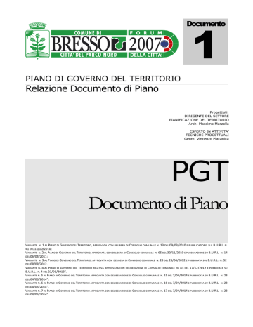 1 Documento PIANO DI GOVERNO DEL TERRITORIO Relazione Documento di Piano Progettisti: DIRIGENTE DEL SETTORE PIANIFICAZIONE DEL TERRITORIO Arch. Massimo Marzolla ESPERTO IN ATTIVITA’ TECNICHE PROGETTUALI Geom. Vincenzo Placanica PGT Documento di Piano VARIANTE N. 1 AL PIANO DI GOVERNO DEL TERRITORIO, APPROVATA CON DELIBERA DI CONSIGLIO COMUNALE N. 13 DEL 09/03/2010 E PUBBLICAZIONE SUL B.U.R.L. N. 41 DEL 13/10/2010; VARIANTE N. 2 AL PIANO DI GOVERNO DEL TERRITORIO, APPROVATA CON DELIBERA DI CONSIGLIO COMUNALE N. 65 DEL 30/11/2010 E PUBBLICAZIONE SU B.U.R.L. N. 14 DEL 06/04/2011; VARIANTE N. 3 AL PIANO DI GOVERNO DEL TERRITORIO, APPROVATA CON DELIBERA DI CONSIGLIO COMUNALE N. 28 DEL 23/04/2012 E PUBBLICATA SUL B.U.R.L. N. 32 DEL 08/08/2012. VARIANTE N. 4 AL PIANO DI GOVERNO DEL TERRITORIO RELATIVA APPROVATA CON DELIBERAZIONE DI CONSIGLIO COMUNALE N. 83 DEL 17/12/2012 E PUBBLICATA SU B.U.R.L. N. 4 DEL 23/01/2013”. VARIANTE N. 5 AL PIANO DI GOVERNO DEL TERRITORIO APPROVATA CON DELIBERAZIONE DI CONSIGLIO COMUNALE N. 15 DEL 7/04/2014 E PUBBLICATA SU B.U.R.L. N. 23 DEL 04/06/2014”. VARIANTE N. 6 AL PIANO DI GOVERNO DEL TERRITORIO APPROVATA CON DELIBERAZIONE DI CONSIGLIO COMUNALE N. 16 DEL 7/04/2014 E PUBBLICATA SU B.U.R.L. N. 23 DEL 04/06/2014”. VARIANTE N. 7 AL PIANO DI GOVERNO DEL TERRITORIO APPROVATA CON DELIBERAZIONE DI CONSIGLIO COMUNALE N. 17 DEL 7/04/2014 E PUBBLICATA SU B.U.R.L. N. 23 DEL 04/06/2014”. Capitolo I Introduzione al PGT Dal Piano Regolatore Generale al Piano di Governo del Territorio. Negli ultimi anni si è assistito di fatto ad un processo di profonda trasformazione della pianificazione territoriale, tuttora in corso, che ha visto sia a livello regionale che a quello nazionale il cambiamento delle regole che sottendono allo sviluppo del territorio. L’ “Urbanistica”, in senso stretto, sta di fatto cedendo il passo, seppur lentamente, al nuovo strumento di programmazione territoriale per il “Governo del Territorio”. In tal senso con l’avvento della Legge Regionale n. 12 del 31 marzo 2005 si è formalmente dato l’avvio concreto al GOVERNO DEL TERRITORIO inteso quale “processo” di programmazione dinamica del territorio, che attraverso un insieme coordinato di azioni è in grado di definire l’assetto dell’intero territorio comunale e di dare risposta alle plurime e diverse esigenze della città. Novità introdotte dalla Legge Regionale n. 12/2005 Al fine di affrontare le problematiche differenziate del territorio il PIANO DI GOVERNO DEL TERRITORIO (P.G.T.) è composto da 3 strumenti diversi, seppure complementari e contestuali: UN PIANO STRATEGICO – IL “DOCUMENTO DI PIANO”, strumento flessibile, che non ha effetti di conformazione della proprietà dei suoli e che mantiene un legame con il mandato amministrativo (almeno dal punto di vista temporale – validità 5 anni); dovrà essere accompagnato da una procedura di VAS (Valutazione Ambientale Strategica) sugli effetti Documento di Piano significativi che le previsioni di piano potranno avere sull’ambiente. UN PIANO DELLA CITTA’ PUBBLICA – IL “PIANO DEI SERVIZI”, piano della rete portante dei servizi a supporto della collettività locale e delle attività insediate; ha carattere prescrittivo e vincolante. UN PIANO DELLA CITTA’ CONSOLIDATA – IL “PIANO DELLE REGOLE”, quale piano della città esistente, finalizzato a facilitare le modalità di intervento in aree che necessitano di poche ma chiare regole cui attenersi per inserirsi correttamente nell’ambito di tessuti edificati già determinati nelle loro caratteristiche sostanziali; ha valore prescrittivo e produce effetti diretti sul regime giuridico dei suoli; ha validità indeterminata. Il Documento di Piano, all’interno dell’articolazione del Piano di Governo del Territorio, assume il contenuto di strumento direttore al fine di esplicitare le strategie e gli obiettivi, nonché indicare le azioni attraverso cui perseguire lo sviluppo socio-economico ed infrastrutturale della città, 4 Piano dei Servizi Piano delle Regole cercando di valorizzare le risorse ambientali, paesaggistiche e culturali proprie dell’identità locale. Il Documento di Piano definisce altresì lo scenario territoriale condiviso dalla comunità locale che, anche attraverso i suoi attori pubblici e privati, interviene nei processi decisionali oltre che nell’attuazione dello stesso. Inoltre il Documento di Piano esplicita le politiche di intervento e verifica la sostenibilità ambientale e la coerenza paesaggistica delle previsioni di sviluppo. Gli aspetti regolamentativi e gli elementi di qualità della città e del territorio sono invece affidati al Piano delle Regole, mentre l’armonizzazione tra insediamenti funzionali ed il sistema dei servizi e delle attrezzature pubbliche e di interesse pubblico o generale sono affidati al Piano dei Servizi. Sia il Piano dei Servizi che il Piano delle Regole, strumenti complementari, sono comunque coerenti con gli obiettivi strategici e quantitativi di sviluppo complessivo contenuti nel presente Documento di Piano. PROCESSO DI COSTRUZIONE DEL PIANO DI GOVERNO DEL TERRITORIO Viene di seguito schematizzato il costruzione del nuovo strumento urbanistico: Base di partenza Fase 1 percorso di Variante Generale Piano Regolatore Generale Avvio Procedimento redazione atti Piano di Governo del Territorio (Scelta ed indirizzo politico di continuità con gli obiettivi della variante generale al PRG) Convegno: Verso un nuovo Piano di Governo del Territorio Partecipazione Proposte Fase 2 mediante Documento di Piano 5 presentazione Istanze Analisi Urbanistica di base Analisi Paesaggistica di base Analisi Socio-economica di base Incarico redazione aggiornamento Studio Geologico e sismico Incarico redazione elaborati Valutazione Ambientale Strategica Fase 3 Forum per la Città Definizione dei contenuti strategici del Documento di Piano e Politiche per la casa Definizione dei contenuti di indirizzo del Documento di Piano F
