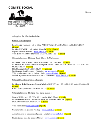 COMITE SOCIAL Nîmes Des Sapeurs-Pompiers du Centre de Secours Principal De NIMES Alloggi tra 5 e 15 minuti dal sito Gites a Montignargues : Location de vacances : Mr et Mme PREVOT : tel : 04.66.81.76.25. ou 06.26.67.27.89. (4 posti) Le Mas RUGGERI : tel : 04.66.81.66.74. (12 a 15 posti) Espace détente : Helene : www.airbnb.fr (3 posti) Villa plein sud : Mme Stéphanie SHAW : ABRITEL : (6 posti) Gites et chambres d’hôtes a Saint Génies de Malgoires : Le Cocon : MR et Mme Lionel Bonhomme : 06.75.86.05.97. (2 posti) La Maison des Autres : Mme Véronique Carriere : tel 04.66.22.62.01 ou 06.13.22.61.91. ou 06.88.26.13.86. (9 posti) Hôtel L’esquielle : 04.66.81.75.05. (11 camere) Studio porte des Cévennes : Nathalie : www.airbnb.fr (3 posti) Villa piscine entre mer et rivière : Julie : www.airbnb.fr (6 posti) Maison agréable entre Nîmes et Ales : Christophe : www.airbnb.fr (4 posti) Gites et Chambres d’hôtes a Sauset : La Maison de Belluguette : Mme Christine DUPUY : tel : 06.18.91.91.09 ou 04.66.03.64.60. (5 posti) Côte Cour : Sylvie : tel : 06.07.40.72.35. (14 posti) Gites et chambres d’hôtes a fons-autre gardon : Mas ALLIER : tel : 07.77.34.30.12. ou 04.66.63.22.04. (6 posti) Le trempadou : Odile : tel : 06.65.66.49.84. ou 06.84.70.08.08. (5 posti) LORAND Rosa : 04.66.59.04.52. (8 posti) Villa Pascaline : www.airbnb.fr (3 posti) Camera/villa con piscina: Audrey : www.airbnb.fr (2 posti) Appartamento in una casa del paese : Michel : www.airbnb.fr (4 posti) Studio in una casa del paese : Michel : www.airbnb.fr (2 posti) Appartemento di 50 M2 : Claudine : www.airbnb.fr (4 posti) Gites et chambre d’hôtes a La Rouviere : Mas de la Rouviere : tel : 06.88.05.47.03. (21 posti) Madeleine PELLEGRINELLI : tel : 04.66.81.05.53. (3 posti) Gites et chambres d’hôtes a Dommessargues : Mas en pierre pré de la garrigue : Sylvie : www.airbnb.fr (8 posti) Bella casa indipendente in pietra : Brigitte : www.airbnb.fr (5 posti) Camera a Domessargues : Eric : www.airbnb.fr (2 posti) Gites et chambres d’hôtes a Mauressargues : Gites Mr Bernard VIDAL-ROUX: tel : 04.66.83.30.53. ou 06.76.28.53.82. (16 posti) Le Coing des Vignes : 04.66.83.47.50. (9 posti) Gites et chambres d-hôtes a Parignargues : Gite Lou Clapas : Mme Valérie REBATTEL: tel : 04.66.81.19.47 ou 06.25.37.41.90. (6 posti) Comme à la Maison : 04.66.63.28.21. (20 posti) Casetta nel cuore del paese : Frédéric : www.airbnb.fr (2 posti) Casa con giardino : Marie : www.airbnb.fr (5 posti) Gites et chambres d-hôtes a Montpezat : Mr J-Philippe et Magali Azais : tel : 04.66.02.02.06 ou 06.13.09.16.62. (6 posti) Gites et chambres d’hôtes à Montagnac : La Boissière et Le Vialat : 06.76.65.74.82. (6 posti) Gites à Montagnac : Éric : www.airbnb.fr : (2 posti) Gites et chambres d’hôtes a Saint Mamert du Gard La Mazade de Saint Mamert : Mme Eliette COUSTON : 04 66 81 17 56. (8 posti) Appartamento indipendente con grande giardino : Alexandrine : www.airbnb.fr (4 posti) Camera in una casa del paese : Eric : www.airbnb.fr (2 posti) Gites et chambres d’hôtes a Le Plagnol- Brignon Les deux Tours : Mr et Mme Vincent COUROYER : tel : 04.66.24.18.96. (5 posti) Les Remparts : Mme et Mr LES MICHAUD : 04.66.25.76.71. ou 09.65.20.58.20 ou 06.74.75.96.96 (8 posti) Gites et chambres d’hôtes a Moussac : Château de Moussac : 06.14.06.11.99. (12 posti) Labricotier : Booking.com (5 posti) Mr Jean-Louis ISSAURAT : tel : 04.66.81.68.14 ou 07.84.00.79.61. (25 posti) La Terrasse : Mme Françoise Charneca : tel : 04.11.83.20.58. ou 06.17.32.75.18. (2 posti) Chez CathEric : Eric Mathieu : 04.66.81.79.79. ou 06.20.68.70.40. (11 posti) Notte e pasto in campagna : Dominique : www.airbnb.fr (2 posti) Gites et chambres d’hôtes a Boucoiran et Noziéres : Au Château : Mme Karine PIALET : 04. 66.61.58.83. ou 06.15.75.78.48. Casa : Solen : www.airbnb.fr (6 posti) Gites et chambres d’hôtes a La Calmette : Le Mas des oliviers : Mme Claudine CHARTIER : 04.66.64.99.47. (5 posti) Accueillante maison de village : Mme Geneviève : www.airbnb.fr (2 posti) Passifloer : Claudine : www.airbnb.fr (4 posti) Gites et chambres d’hôtes a Dions : Le Mas des Vignes : 06.21.77.25.70. (6 posti) Gites et chambres d’hôtes a Saint Chaptes : Maison de Catherine et Thierry : Booking.com (8 posti) Beauregard : 04.90.57.76.77. (8 posti) Charment petit studio : Rubi : www.airbnb.fr (2 posti) Villa au calme : Flaman : www.airbnb.fr (1 posto) Mas provençal : Valérie : www.airbnb.fr (4 posti) Bastîde du Faucon/ atelier muse : Nan : www.airbnb.fr (2 posti) Maison de village & spa : Emma : www.airbnb.fr : (6 posti) Camera zen : Monique : www.airbnb.fr : (5 posti) 2 stanze: Marie-Pia : www.airbnb.fr (4 posti) Grande appartamento con piscina : Patrick : www.airbnb.fr (8 posti) et (4 posti) Gites et chambres d’hôtes a Gajan : Casa di campagna : Cédric : www.airbnb.fr (6 posti) Ancienne magnanerie dans hameau : Cathy : www.airbnb.fr (12 posti) Souvignargues : Camping Le Pré Saint André 3 étoiles : tel : 40.66.80.95.85. 10% di sconot ai vigili del fuoco Comité social Sapeurs-pompiers de Nîmes