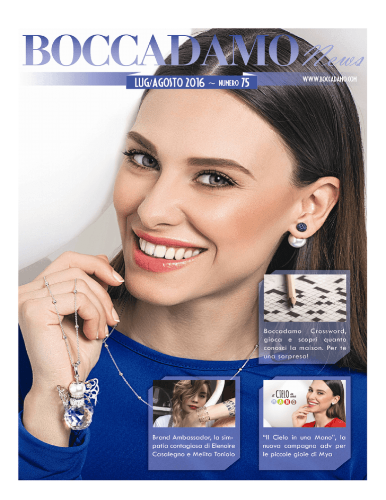 2 Il Cielo in una Mano La nuova campagna adv Mya esalta le piccole gioie quotidiane, gesti o anche accessori e gioielli che ci regalano un sorriso, facendoci sentire pieni di vita! se fosse possibile stringere il cielo in una mano? Se fosse possibile afferrare i nostri sogni e portarli sempre con noi, avere al collo il nostro angelo custode e al polso il nostro portafortuna? Se potessimo indossare ciò che per noi rappresenta la serenità, l’amore e la leggerezza della vita? La nuova campagna pubblicitaria del brand Mya ha voluto interpretare lo spirito “think positive” che da sempre è legato alla volta celeste, con uno shooting fotografico ed un video promozionale che scoppiano di brio e di colore. Un mood fresco e positivo, che passa attraverso le nuove creazioni della linea, tutte accomunate da vivaci sfuma- ture e da un design fantasioso. Frizzante e dal sorriso contagioso è l’interprete femminile della campagna, solare come i gioielli che indossa, felice di avere con sé creazioni che trasmettono gioia al primo sguardo. Il suo ottimismo passa attraverso il gioco che mette in scena con le creazioni Boccadamo. Dalla scelta dell’angelo “Kerubina” che deciderà di indossare durante la giornata, al colore e al modello di orecchini reversibili “Suami”, dalla bambolina “Mya” che le farà da confidente al charm portafortuna del suo bracciale. www.boccadamo.com 3 Un momento di vita semplice, ma che nel suo piccolo regala istanti di gioia alla protagonista della nuova campagna “Mya”. sorrisi sinceri. Anche circondarsi di piccoli monili può essere una carezza per l’anima e non necessariamente queQuesta stessa spensieratezza e legsto gesto va interpretato come gerezza di spirito la ritroviamo anche un vezzo o un eccesso di vanità. nel video che accompagna il serviLe deliziose creazioni Mya, con la zio fotografico. loro palette cromatica che fa eAttraverso lo shooting e lo short QRCODE – Vuoi scopri- mergere con grinta le sfumature movie, Boccadamo invita tutte le re il video della nuova pastello, valorizzano la brillantezbrand lovers, e anche chi conoscerà campagna adv del za dei cristalli Swarovski e l’enerbrand Mya di Boccaper la prima volta il brand, a riappro- damo? Posiziona il tuo gia trasmessa dalle superfici glitpriarsi dei piccoli gesti quotidiani; a smartphone in corri- terate. Ingredienti che ritroviamo spondenza di questo riscoprire le piccole attenzioni che codice ed entrerai nel costanti nelle novità di stagione, dovremmo avere per gli altri, ma an- mondo de “Il Cielo in gioielli che si sposano perfettamente con l’atmosfera estiva, che per noi stessi; ad alzare ogni tan- una mano”! quel gusto fresco e pieno di ottito lo sguardo verso il cielo, distoglienmismo che, da sempre, si associa dolo da smartphone, tablet e Pc. a mare e sole. Godersi un po’ di più la vita, ritagliandosi dei momenti per se stessi. Ecco perché la scelta del gioco, l’espediente che ci fa tornare bambini, che ci fa sentire leggeri e ci ruba Perché a volte basta veramente poco per stringere il cielo in una mano! www.boccadamo.com 4 Un Angelomio sempre con te Boccadamo reinterpreta con originalità e dolcezza il tradizionale chiama angeli, trasformandolo in un accessorio universale, per donne in dolce attesa e non l chiama angeli, ciondolo sonoro famoso per proteggere ed accompagnare le future mamme ed i bimbi durante i mesi di gravidanza, trova oggi una dolce e fantasiosa rivisitazione nella linea “Angelomio” di Boccadamo. Sei collane composte da boules con sonaglio interno, arricchite da una coppetta finemente lavorata, nelle varianti rodiata e placcata oro rosa. Un magico gioco di suoni che accompagna non solo le neomamme ed i loro piccoli, ma tutte le donne che desiderano ogni giorno la compagnia di una dolce melodia, dalle qualità calmanti e rilassanti. www.boccadamo.com 5 Design artigianale per Tricot Il punto Tricot, tradizionale tecnica di lavorazione ad uncinetto, rivive nella collezione Boccadamo, magistralmente realizzata dai maestri orafi della maison ome rendere una lavorazione manuale in un’autentica espressione artistica? Boccadamo ha preso ispirazione da una delle più nobili tecniche di lavorazione artigianale, come il punto tricot usato nell’uncinetto, per realizzare creazioni dall’intreccio unico, fedele riproduzione dell’ordito in tes- suto. Come i filati lavorati a mano, così i designer della maison hanno plasmato la materia: fili di bronzo e di glitter, riproducono il famoso intreccio, in una sequenza di pieni e di vuoti, di diverse dimensioni, che caratterizza le parure “Tricot”, rodiate e placcate oro rosa. www.boccadamo.com 6 ELENOIRE CASALEGNO - La bionda conduttrice non ha saputo resistere alla tentazione di indossare Boccadamo. me che lega da sempre il gentil sesso con i preziosi, Elenoire Casalegno ha accompagnato su Instagram e Twitter la foto che la ritrae in compagnia di un fenicottero rosa di plastica ed un bangle Boccadamo. Una frase di grande impatto, affatto banale o scontata. Proprio come lei, la bionda romagnola, dalla simpatia travolgente e di uno stile pari a nessuno. Una vera e propria veterana della televisione italiana, Elenoire ha saputo reinventarsi negli anni, passando dalla moda alla radio, dalla televisione al cinema, senza mai tradire se stessa e il suo carattere così originale. Tra le tante gioie di Boccadamo, la nostra Brand Ambassador ha indossato il bracciale della linea “Majestic” placcato oro rosa con decoro traforato e gocce di rugiada con cristalli Swarovski crystal. i fa sempre più ricca e lunga la lista delle celebrities che hanno indossato i gioielli Boccadamo, anche solo per un giorno, entrando di diritto nella personale “hall of fame” della maison. Attrici, showgirl, presentatrici, modelle tra le più note e amate dagli italiani hanno mostrato orgogliose i gioielli della fashion factory sui loro canali social, diventando protagoniste della speciale rubrica Brand Ambassador. 