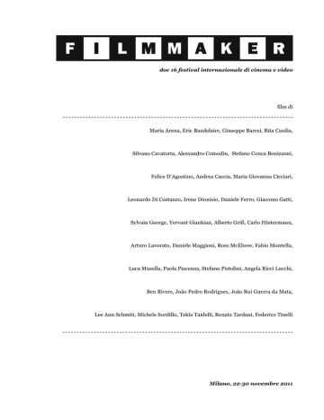 doc 16 festival internazionale di cinema e video film di Maria Arena, Eric Baudelaire, Giuseppe Baresi, Rita Casdia, Silvano Cavatorta, Alessandro Comodin, Stefano Conca Bonizzoni, Felice D’Agostino, Andrea Caccia, Maria Giovanna Cicciari, Leonardo Di Costanzo, Irene Dionisio, Daniele Ferro, Giacomo Gatti, Sylvain George, Yervant Giankian, Alberto Grifi, Carlo Hintermann, Arturo Lavorato, Daniele Maggioni, Ross McElwee, Fabio Montella, Luca Musella, Paola Piacenza, Stefano Pistolini, Angela Ricci Lucchi, Ben Rivers, João Pedro Rodrigues, João Rui Guerra da Mata, Lee Ann Schmitt, Michele Sordillo, Tekla Taidelli, Renata Tardani, Federico Tinelli Milano, 22-30 novembre 2011 Dedicato a Silvano Cavatorta FESTIVAL DOC 16 doc 16 festival internazionale di cinema e video Direzione Luca Mosso organizzato da Associazione Filmmaker via Aosta 2 20155 Milano (Italia) tel +39 023313411 fax +39 02341193 [email protected] www.filmmakerfest.com Selezione Alice Arecco, Luca Mosso, Daniela Persico, Cristina Piccino, Alessandro Stellino Il catalogo è pubblicato in occasione del festival Filmmaker doc16 Milano 22-30 novembre 2011 Cinema Gnomo, via Lanzone 30/a Centre Culturel Français, c.so Magenta 63 Spazio Oberdan, v.le Vittorio Veneto 2 Il Fischio, Fabbrica del vapore, via Procaccini 4 con il contributo e la collaborazione di Mibac Ministero per i Beni e le Attività Culturali Comune di Milano Cultura – Settore spettacolo CGIL SPI CGIL Milano Associazione Archivio del Lavoro Centre Culturel Français Fondazione Cineteca Italiana CISL Lombardia Filmmaker aderisce all’AFIC (Associazione Festival Italiani di Cinema) e al Coordinamento dei Festival della Lombardia Coordinamento programma Alice Arecco, Cristina Caon Segreteria organizzativa Ottavia Fragnito, Andrea Sartori Amministrazione Silvana D'Errico Ufficio stampa Aigor Web Francesco Sparacio (progetto), Carlo Persico (grafica) Sottotitoli Cristina Caon, Paola Piacenza, Cristina Piccino, Stefania Rossi Coordinamento proiezioni Pietro Baj – Altera Cinema Trasporti Mencarani, FedEx CATALOGO Testi e redazione Alice Arecco, Luca Mosso, Cristina Piccino, Alessandro Stellino Documentazione Cristina Caon Ringraziamenti Stefano Boeri – Comune di Milano, Assessore alla Cultura, Expo, Moda, Design Novo Umberto Maerna, Provincia di Milano, Settore Cultura e Beni Culturali Giulia Amato, Lory Dall'Ombra, Anna De Benedetto – Comune di Milano Fabrizio Provera, Marco Piccardi – Provincia di Milano, Settore Cultura e Beni Culturali Anna Milani, Aldo Biffi – SPI/CGIL Milano Gigi Petteni, Matteo Berlanda – CISL Lombardia; Aldo Carera, Guido Costa, Giacinto Andriani – Bibliolavoro; Olga Poivre d'Arvor, Malika Lahmidi, Marie Zago, Cesare Vergati – Centre Culturel Français de Milan; Floriana Chailly – Il Fischio; Mario Gorni e Monica Favara – Careof DOCVA Bruno Oliviero, Emilio Casalini; Gabriella Foglio – Legambiente; Enrico Magrelli e Annamaria Licciardello - Cineteca Nazionale, Gianluca Farinelli Cineteca di Bologna, Gianandrea Sasso, Alessandro Bordina, Simone Venturini Università di Udine - La camera ottica, Antonello Zanda e Giuseppe Pilleri Cineteca Sarda di Cagliari; Maria Bonsanti, Alberto Lastrucci, Carlo Chatrian, Claudia Maci, Lorenzo Dell’Agnello – Festival dei Popoli; Alessandro Riccini Ricci e Andrea Terradura – Microcinema; Davide Oberto, Francesco Giai Via – Torino Film Festival, Matteo Pavesi, Enrico Nosei – Fondazione Cineteca Italiana; Leonardo di Costanzo; Carlo Cresto-Dina, Laura Epasto – Tempesta Film; Alessandro Comodin; Paolo Benzi – Faber Film; Ross McElwee, Marie Emmanuelle Hartness, Andrew Hartness – St Quay Films; Pietro Marcello; Enrico Ghezzi; Stefano Francia; Marianna De Liso - Vertical Film; Sylvain George, Lee Anne Schmitt, Eric Baudelaire, Ben Rivers, Gil Leung – Lux; Charlie Bligh – BFI Southbank; Joao Pedro Rodriguez; Salette Ramalho – Agencia; Ben Rivers; Felice D’Agostino e Arturo Lavorato; Irene Dionisio, Carlo Hintermann; Yervant Gianikian e Angela Ricci Lucchi; Paolo Mereghetti, Barbara Grespi, Alberto Saibene e Antonio Somaini; Laura Asnaghi; Daniele Maggioni; Bruno Chiaravalloti, Antonella Grieco, Lara Casirati, Guido Sommariva; Jean-Pierre Rehm, Ourida Timhadjelt – Fidmarseille; Alessandra Thiele; Sergio Fant. Tutti i registi, le case di produzione, le case di distribuzione, le università, le scuole di cinema e tutti coloro che hanno collaborato all’organizzazione della rassegna. INTRODUZIONE Un'edizione con pochi soldi, molte difficoltà e, soprattutto, un'edizione senza Silvano. Non è stato semplice arrivarci e quella che vedrete è il risultato di un lavoro intenso ma anche di una riflessione sul senso di fare un festival come il nostro. Dopo molti dubbi e qualche ripensamento, alla fine ha prevalso la volontà di continuare il lavoro e anzi di precisarlo ancora meglio, focalizzando l'attenzione da una parte sul panorama internazionale del documentario, con un Concorso di alto livello, e dall'altra sulla realtà locale, ben rappresentata dalla sezione MilanoMetropoli, molto vivace nonostante le carenze del sistema cinema della nostra città. In mezzo, a ideale collegamento, alcuni grandi outsider come Gianikian e Ricci Lucchi, cineasti internazionali che vivono a Milano ma sono più conosciuti a Parigi, New York e Londra, Pietro Marcello con il suo film moscovita che racconta l'incontro con il grande Artavazd Pelešjan e un omaggio a un grande dell'underground italiano, Alberto Grifi, con la proiezione del capolavoro Anna e un laboratorio sul restauro del girato originale che promette interessantissime rivelazioni. Tanti sguardi, qualche connessione feconda, un bel po' di film che oltre a essere belli speriamo possano essere utili. A chi fa film, a chi li guarda, a tutti quelli che li interrogano per capire qualcosa di più del presente. Un'edizione che crediamo sarebbe piaciuta a Silvano, cui abbiamo dedicato la serata finale proiettando i suoi film insieme a Ciao