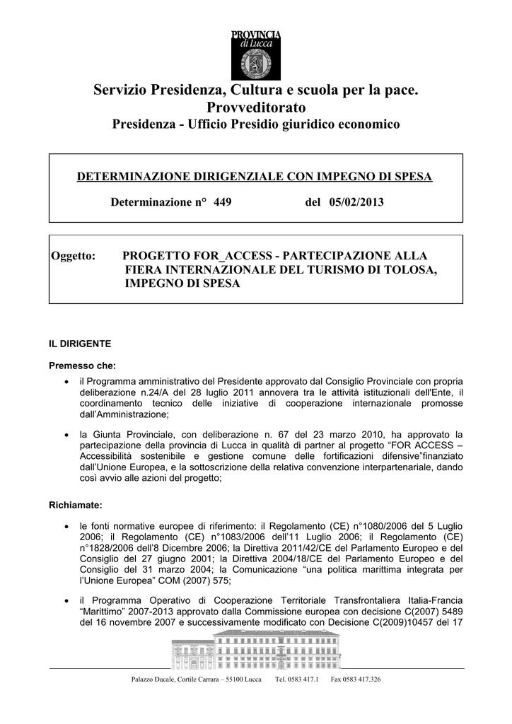 Servizio Presidenza, Cultura e scuola per la pace. Provveditorato Presidenza - Ufficio Presidio giuridico economico DETERMINAZIONE DIRIGENZIALE CON IMPEGNO DI SPESA Determinazione n° 449 Oggetto: del 05/02/2013 PROGETTO FOR_ACCESS - PARTECIPAZIONE ALLA FIERA INTERNAZIONALE DEL TURISMO DI TOLOSA, IMPEGNO DI SPESA IL DIRIGENTE Premesso che: il Programma amministrativo del Presidente approvato dal Consiglio Provinciale con propria deliberazione n.24/A del 28 luglio 2011 annovera tra le attività istituzionali dell'Ente, il coordinamento tecnico delle iniziative di cooperazione internazionale promosse dall’Amministrazione; la Giunta Provinciale, con deliberazione n. 67 del 23 marzo 2010, ha approvato la partecipazione della provincia di Lucca in qualità di partner al progetto “FOR ACCESS – Accessibilità sostenibile e gestione comune delle fortificazioni difensive”finanziato dall’Unione Europea, e la sottoscrizione della relativa convenzione interpartenariale, dando così avvio alle azioni del progetto; Richiamate: le fonti normative europee di riferimento: il Regolamento (CE) n°1080/2006 del 5 Luglio 2006; il Regolamento (CE) n°1083/2006 dell’11 Luglio 2006; il Regolamento (CE) n°1828/2006 dell’8 Dicembre 2006; la Direttiva 2011/42/CE del Parlamento Europeo e del Consiglio del 27 giugno 2001; la Direttiva 2004/18/CE del Parlamento Europeo e del Consiglio del 31 marzo 2004; la Comunicazione “una politica marittima integrata per l’Unione Europea” COM (2007) 575; il Programma Operativo di Cooperazione Territoriale Transfrontaliera Italia-Francia “Marittimo” 2007-2013 approvato dalla Commissione europea con decisione C(2007) 5489 del 16 novembre 2007 e successivamente modificato con Decisione C(2009)10457 del 17 Palazzo Ducale, Cortile Carrara – 55100 Lucca Tel. 0583 417.1 Fax 0583 417.326 dicembre 2009, il cui fine strategico consiste nel migliorare e qualificare la cooperazione nell’area di riferimento costituite dalle regioni Liguria, Sardegna, Corsica e la costa della Toscana,in tema di accessibilità, innovazione, valorizzazione delle risorse naturali e culturali e integrazione delle risorse e dei servizi; il Decreto del Presidente della Repubblica n. 196 del 3 ottobre 2008, con il quale si danno disposizioni sull’ammissibilità delle spese per i programmi cofinanziati dai fondi strutturali Considerato che: la Provincia di Lucca in qualità di partner del progetto “FOR ACCESS – Accessibilità sostenibile e gestione comune delle fortificazioni difensive” in coerenza con il piano delle attività e il relativo cronogramma, è tenuta a partecipare ad un'iniziativa di carattere internazionale per la promozione turistica del circuito delle fortificazioni difensive del progetto For_Access; l'analisi del calendario delle fiere turistiche italiane e francesi di livello internazionale nel periodo gennaio – 12 febbraio 2013 condivisa nell'ambito del Comitato di Pilotaggio del progetto tenutosi a Lucca il 20 dicembre 2012 ha evidenziato la fiera di Toulouse (Francia) come un'opportunità di presentazione e divulgazione del circuito For_Access nonché degli ulteriori strumenti tradizionali e multimediali realizzati nell'ambito del progetto; la suddetta fiera internazionale del turismo denominata Mahana Salon du Tourisme (XVI edizione) viene organizzata dalla società Comexposium presso il Parco delle Esposizioni di Tolosa dal giorno 8 al giorno 10 febbraio 2013 ; • l'iniziativa di cui sopra rientra nella componente 5.1 “Azioni Promozionali” ed in data 11/01/2013 è stata presentata al Capofila del Progetto una richiesta di variazione di budget per implementare le risorse a disposizione sull'attività; • tale richiesta di variazione è stata approvata dal STC che in data 18/01/2013 ha comunicato ufficialmente l'ammissibilità della spesa a finanziamento; Vista la nota prot. d’arrivo n. 21330/10.4.3 del 04.02.2013, conservata in atti, con la quale la COMEXPOSIUM con sede Aubagne Cedox - Francia, a seguito di richieste specifiche, trasmette l'offerta economica per la partecipazione alla suddetta fiera internazionale pari al costo di €. 5.635,75 (€. 4.722,00 onorario + €. 913,75 IVA )comprensiva dei seguenti servizi: • • • • • • • noleggio spazio espositivo di 6 mq allestimento base (6 mq) comprensivo di pareti, moquette, n. 1 cartello segnaletico dedicato con il logo dell'espositore, n. 1 faretto da 100W ogni 3mq; una presa di corrente di 220V; credito su mobili di euro 5/m2; pulizia quotidiana dello stand; assicurazione noleggio arredi (n. 1 desk nero e n. 2 sgabelli neri); collegamento wifi assistenza tecnica allestimento comunicazione visiva comprensiva di rielaborazione grafica, stampa pannelli e montaggio -2- Ritenuto di aderire alla proposta in quanto rispondente ampiamente agli obiettivi del progetto che mirano alla valorizzazione del Circuito delle Fortificazioni difensive For_Access anche a fini turistici; Accertata la necessaria copertura finanziaria; Visti gli artt. 50 e 55 dello Statuto Provinciale Ritenuta propria la competenza; DETERMINA 1. di accettare l’offerta proposta da COMEXPOSIUM con sede Aubagne Cedox – P.I. 34316780519 - Cod. fornitore 30957, acquisita al prot. d'arrivo n. 21330/10.4.3 del 04.02.2013 (conservata in atti), per la partecipazione della Provincia di Lucca alla Fiera internazionale che si terrà a Tolosa dall'8 al 10 febbraio 2013 (CIG 49147514d3); 2. di far fronte alla somma complessiva pari ad € 5.635,75 (iva compresa) richiesta per la partecipazione alla Fiera Internazionale di Tolosa e ritenuta congrua in relazione alla qualità e quantità dei servizi da realizzare e all’utilità conseguita per l’ente - mediante imputazione sul Capitolo 1006112/R del Bilancio 2013 in corso di formazione denominato “Spese per prestazioni di servizi Progetto FOR ACCESS finanziate da contributo Comune di Pula fondi FESR PO Transfr.” assumendo un sottoimpegno sull'impegno 12/225 - SIOPE 1308 – così