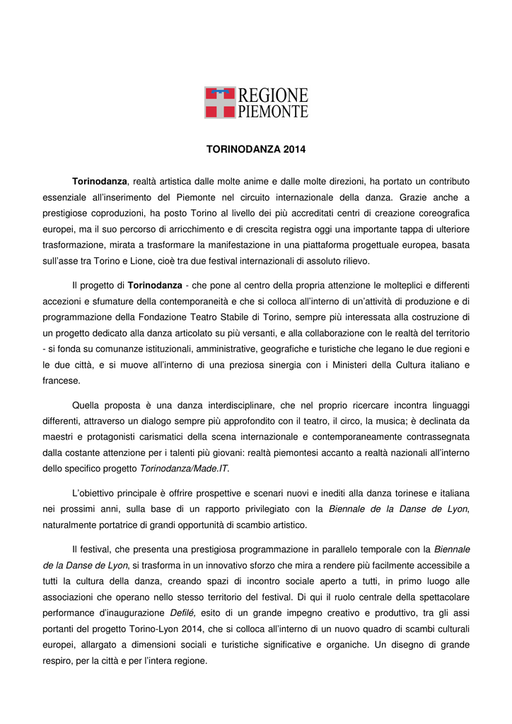 TORINODANZA 2014 Torinodanza, realtà artistica dalle molte anime e dalle molte direzioni, ha portato un contributo essenziale all’inserimento del Piemonte nel circuito internazionale della danza. Grazie anche a prestigiose coproduzioni, ha posto Torino al livello dei più accreditati centri di creazione coreografica europei, ma il suo percorso di arricchimento e di crescita registra oggi una importante tappa di ulteriore trasformazione, mirata a trasformare la manifestazione in una piattaforma progettuale europea, basata sull’asse tra Torino e Lione, cioè tra due festival internazionali di assoluto rilievo. Il progetto di Torinodanza - che pone al centro della propria attenzione le molteplici e differenti accezioni e sfumature della contemporaneità e che si colloca all’interno di un’attività di produzione e di programmazione della Fondazione Teatro Stabile di Torino, sempre più interessata alla costruzione di un progetto dedicato alla danza articolato su più versanti, e alla collaborazione con le realtà del territorio - si fonda su comunanze istituzionali, amministrative, geografiche e turistiche che legano le due regioni e le due città, e si muove all’interno di una preziosa sinergia con i Ministeri della Cultura italiano e francese. Quella proposta è una danza interdisciplinare, che nel proprio ricercare incontra linguaggi differenti, attraverso un dialogo sempre più approfondito con il teatro, il circo, la musica; è declinata da maestri e protagonisti carismatici della scena internazionale e contemporaneamente contrassegnata dalla costante attenzione per i talenti più giovani: realtà piemontesi accanto a realtà nazionali all’interno dello specifico progetto Torinodanza/Made.IT. L’obiettivo principale è offrire prospettive e scenari nuovi e inediti alla danza torinese e italiana nei prossimi anni, sulla base di un rapporto privilegiato con la Biennale de la Danse de Lyon, naturalmente portatrice di grandi opportunità di scambio artistico. Il festival, che presenta una prestigiosa programmazione in parallelo temporale con la Biennale de la Danse de Lyon, si trasforma in un innovativo sforzo che mira a rendere più facilmente accessibile a tutti la cultura della danza, creando spazi di incontro sociale aperto a tutti, in primo luogo alle associazioni che operano nello stesso territorio del festival. Di qui il ruolo centrale della spettacolare performance d’inaugurazione Defilé, esito di un grande impegno creativo e produttivo, tra gli assi portanti del progetto Torino-Lyon 2014, che si colloca all’interno di un nuovo quadro di scambi culturali europei, allargato a dimensioni sociali e turistiche significative e organiche. Un disegno di grande respiro, per la città e per l’intera regione.