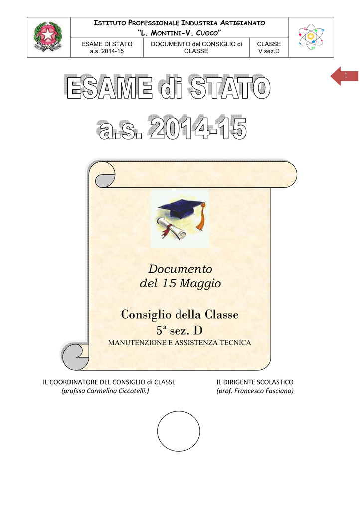 ISTITUTO PROFESSIONALE INDUSTRIA ARTIGIANATO “L. MONTINI-V. CUOCO” ESAME DI STATO a.s. 2014-15 DOCUMENTO del CONSIGLIO di CLASSE CLASSE V sez.D 1 Documento del 15 Maggio Consiglio della Classe 5a sez. D MANUTENZIONE E ASSISTENZA TECNICA IL COORDINATORE DEL CONSIGLIO di CLASSE (profssa Carmelina Ciccotelli.) IL DIRIGENTE SCOLASTICO (prof. Francesco Fasciano) ISTITUTO PROFESSIONALE INDUSTRIA ARTIGIANATO “L. MONTINI-V. CUOCO” ESAME DI STATO a.s. 2014-15 DOCUMENTO del CONSIGLIO di CLASSE CLASSE V sez.D INDICE 2 1. Presentazione della classe pag.3 2. Finalità e obiettivi pag.4 3. Metodi, mezzi, spazi e tempi del percorso formativo pag.5 4. Attività di recupero/potenziamento/approfondimento pag.6 5. Criteri e strumenti di verifica e valutazione adottati pag.7 6. Indicazioni sul profilo e sulle competenze acquisite dagli studenti con riferimento Pag.8 alle esperienze in alternanza scuola-lavoro 7. Programmi pag.11 8. pag.33 Attività di preparazione all’ esame di Stato - Allegati IL CONSIGLIO di CLASSE Discipline Italiano- Storia Docente prof. De Angelis Ida Sostituita da Fusco Giovanna Inglese prof Oriente Antonietta Matematica prof. Ciccotelli Carmelina Educazione Fisica prof. Trivisonno Lorenzo Tec. Meccaniche e applicazioni prof. Paglione Angelo Tec. Installazione e manutenzione prof. D’Angelo Luigi Tec. Elettriche e applicazioni prof. Villani Pasquale Esercitazioni pratiche-Codocente prof. Tedeschi Andrea Religione prof. Lucarelli Marcello Codocente Prof. Socci Antonio Firma ISTITUTO PROFESSIONALE INDUSTRIA ARTIGIANATO “L. MONTINI-V. CUOCO” ESAME DI STATO a.s. 2014-15 DOCUMENTO del CONSIGLIO di CLASSE CLASSE V sez.D 3 1. PRESENTAZIONE DELLA CLASSE La classe composta all’inizio dell’anno da 17 alunni provenienti dalla classe quarta dell’anno precedente , da tre ripetenti dalla stessa scuola e da un alunno da altra regione. Nel corso dell’anno l’alunno proveniente da altra regione si è ritirato e un altro ha seguito solo il primo periodo e poi ha abbandonato gli studi. Gli studenti provengono da una realtà sociale e geografica che non ha offerto molti stimoli culturali; infatti quasi tutti risiedono in paesi, anche lontani dal capoluogo, e sono costretti al disagio della pendolarità. Tuttavia non è mancato la partecipazione al lavoro di classe e ai vari progetti dove gli alunni hanno dato prova di serietà senso di responsabilità e interesse alle tematiche trattate. I progetti a cui ha partecipato l’intera classe o solo alcuni alunni sono: attività di orientamento. la visita alla Honda, corso formativo della durata di 20 ore “Laboratorio d’impresa” e “Laboratorio di innovazione tecnologica” . Per il potenziamento dell’eccellenza: corso di grafica tridimensionale con piattaforma Solidworks. Dopo la metà di maggio alcuni alunni andranno a visitare l’EXPO’. Negli ultimi tre anni si è mantenuta la continuità didattica solo in matematica, inglese,educazione fisica,e religione. Gli insegnanti delle altre discipline sono cambiati quest’ultimo anno, in particolare per italiano e storia la classe ha avuto ulteriori disagi per le continue e brevi assenze della docente titolare, soprattutto nel primo periodo e poi sostituita dalla supplente dal 20 di febbraio. Il gruppo classe, considerato nel suo complesso, possiede nelle varie discipline conoscenze a livello di informazioni essenziali che per alcuni studenti possono ritenersi complete e significative, in qualche caso anche approfondite. Per quanto riguarda le competenze e le capacità, gli studenti sono in grado di usare in compiti applicativi le conoscenze che possiedono in relazione alla quantità e alla qualità delle stesse e in modo diversificato, pur se non sempre con sicurezza o agilità. Generalmente organizzano il discorso in modo chiaro, ma non sempre corretto, per alcuni l’esposizione risulta scorrevole per altri meno. ISTITUTO PROFESSIONALE INDUSTRIA ARTIGIANATO “L. MONTINI-V. CUOCO” ESAME DI STATO a.s. 2014-15 DOCUMENTO del CONSIGLIO di CLASSE CLASSE V sez.D 4 2. FINALITA’ E OBIETTIVI (dal POF) L’attività didattico-culturale dell’intero Consiglio di classe è stata orientata a sviluppare negli allievi le seguenti potenzialità: OBIETTIVI FORMATIVI - rafforzare la consapevolezza del senso di appartenenza ad una comunità - educare al riconoscimento e al rispetto dell’altro e delle altre culture - sviluppare la capacità di cooperazione con i compagni per il raggiungimento di obiettivi comuni - acquisire la consapevolezza delle proprie potenzialità al fine di essere propositivi verso se stessi e gli altri - educare al valore della conoscenza e della cultura come mezzi di crescita personale e sociale OBIETTIVI COGNITIVI CONOSCENZE - conoscenza dei contenuti delle singole discipline - conoscenza del significato di termini e concetti - conoscenza degli strumenti e dei materiali oggetto di utilizzo laboratoriale - - COMPETENZE usare correttamente il lessico specifico acquisire competenze nel linguaggio scritto, orale e grafico acquisire competenze tecnico-professionali saper sintetizzare efficacemente contenuti e nozioni appresi saper applicare regole, tecniche, principi, proprietà saper intraprendere autonomamente semplici percorsi di studio e di ricerca anche suggeriti dagli insegnanti CAPACITA’ saper analizzare in modo autonomo lo studio saper consultare un testo, anche in lingua, in modo critico, consapevole e funzionale saper compiere inferenze e collegamenti interdisciplinari saper gestire una situazione professionale utilizzando il problem solving ISTITUTO PROFESSIONALE INDUSTRIA ARTIGIANATO “L. MONTINI-V. CUOCO” ESAME DI STATO a.s. 2014-15 DOCUMENTO del CONSIGLIO di CLASSE CLASSE V sez.D 5 Italiano X X Storia X X X Inglese X X X Matematica X X Ed. Fisica X X Tec.Meccaniche X X Tec. Installazione X X Tec. elettriche X Esercitazioni Religione X X X X X X X X X X X X X X X X X X X X X X X X X X X X X X X X X X X X X X X X X X X X X Attrezzature sportive Strume