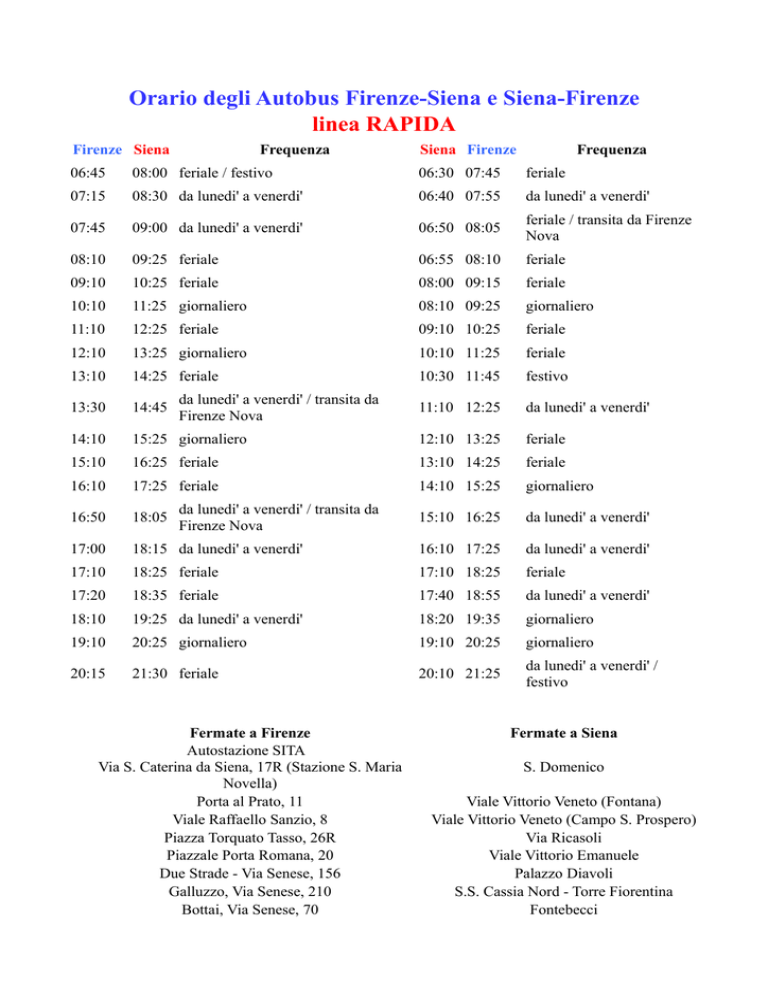 Orario degli Autobus Firenze-Siena e Siena-Firenze linea RAPIDA Firenze Siena Frequenza Siena Firenze Frequenza 06:45 08:00 feriale / festivo 06:30 07:45 feriale 07:15 08:30 da lunedi' a venerdi' 06:40 07:55 da lunedi' a venerdi' 07:45 09:00 da lunedi' a venerdi' 06:50 08:05 feriale / transita da Firenze Nova 08:10 09:25 feriale 06:55 08:10 feriale 09:10 10:25 feriale 08:00 09:15 feriale 10:10 11:25 giornaliero 08:10 09:25 giornaliero 11:10 12:25 feriale 09:10 10:25 feriale 12:10 13:25 giornaliero 10:10 11:25 feriale 13:10 14:25 feriale 10:30 11:45 festivo 13:30 14:45 11:10 12:25 da lunedi' a venerdi' 14:10 15:25 giornaliero 12:10 13:25 feriale 15:10 16:25 feriale 13:10 14:25 feriale 16:10 17:25 feriale 14:10 15:25 giornaliero 16:50 18:05 15:10 16:25 da lunedi' a venerdi' 17:00 18:15 da lunedi' a venerdi' 16:10 17:25 da lunedi' a venerdi' 17:10 18:25 feriale 17:10 18:25 feriale 17:20 18:35 feriale 17:40 18:55 da lunedi' a venerdi' 18:10 19:25 da lunedi' a venerdi' 18:20 19:35 giornaliero 19:10 20:25 giornaliero 19:10 20:25 giornaliero 20:15 21:30 feriale 20:10 21:25 da lunedi' a venerdi' / festivo da lunedi' a venerdi' / transita da Firenze Nova da lunedi' a venerdi' / transita da Firenze Nova . Fermate a Firenze Autostazione SITA Via S. Caterina da Siena, 17R (Stazione S. Maria Novella) Porta al Prato, 11 Viale Raffaello Sanzio, 8 Piazza Torquato Tasso, 26R Piazzale Porta Romana, 20 Due Strade - Via Senese, 156 Galluzzo, Via Senese, 210 Bottai, Via Senese, 70 Fermate a Siena S. Domenico Viale Vittorio Veneto (Fontana) Viale Vittorio Veneto (Campo S. Prospero) Via Ricasoli Viale Vittorio Emanuele Palazzo Diavoli S.S. Cassia Nord - Torre Fiorentina Fontebecci .