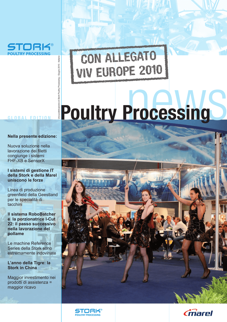 Una pubblicazione di Stork Poultry Processing - Giugno 2010 - Italiano GLOBAL EDITION Nella presente edizione: Nuova soluzione nella lavorazione dei filetti congiunge i sistemi FHF-XB e SensorX I sistemi di gestione IT della Stork e della Marel uniscono le forze Linea di produzione greenfield della Geestland per le specialità di tacchini Il sistema RoboBatcher e la porzionatrice I-Cut 22: il passo successivo nella lavorazione del pollame Le machine Reference Series della Stork sono estremamente indovinate L’anno della Tigre: la Stork in China Maggior investimento nei prodotti di assistenza = maggior ricavo CON ALLEGATO 0 1 0 2 E P O R U E V I V news Poultry Processing P o u l t r y content 2 Soluzioni integrate 3 Una nuova soluzione nella lavorazione automatica dei filetti congiunge i sistemi FHF-XB e SensorX 4 Macello Greenfield per le specialità di tacchino della Geestland Putenspezialitäten: lavorazione del tacchino al più alto livello 5 I sistemi di gestione IT uniscono le forze nella lavorazione del pollame 6 Il macello di pollame C. van Miert B.V. ha installato una Nuova 6 Eccellente gioco di squadra all’International Poultry Expo 2010 7 Legislazione EU sul benessere degli animali 7 La Stork Poultry Processing presenta un nuovo uccisore 8 La Stork Poultry Processing vince il premio ‘Netherlands Turkey Trade Award’ 8 La ditta IMBA S.A. acquista una linea di macellazione 9 RoboBatcher 9 Esempi delle innovazioni della Marel 10 La scelta del maggior produttore integrato di pollame dell’Australia 11 Le attività della Stork Poultry Processing in Cina nell’Anno della Tigre 12 Controllo totale del processo con il tunnel di raffreddamento Downflow Chiller “+” 12 La ditta Davaçi Broyler sceglie la Stork Poultry Processing 13 La nuova macchina di lavorazione automatica dei ventrigli (MG150) 13 La Matijević sceglie la qualità 14 Il mercato in espansione dell’India desidera automatizzarsi 15 Maggior ricavo grazie al maggior investimento nei prodotti di assistenza 16 Disavasa 16 Sada 17 Modernizzazione della Avicosán Barcelona con la Stork Poultry Processing 17 Coren 18 Le macchine Reference Series della Stork per il reparto di eviscerazione sono estremamente indovinate 20 La Boscher Volailles: il riferimento per automazione ed efficienza 20 Calendario delle fiere 2010 Soluzioni integrate La migliore soluzione per tutti i nostri clienti Durante la grave crisi economica mondiale agli inizi dell’anno scorso, nella prima metà del 2009 la Stork Poultry Processing non si è trovata in una situazione critica grazie al portafoglio degli ordini clienti sempre ricco. Abbiamo potuto constatare nel secondo trimestre un aumento del numero di investimenti, soprattutto in Europa. Nonostante ciò è stato impossibile evitare di adottare alcuni provvedimenti per effettuare risparmi sui costi. Tuttavia abbiamo preferito non risparmiare sulle innovazioni e sui costi della nostra organizzazione di vendita e di servizio assistenza; lo sviluppo di nuovi prodotti ed il nostro livello elevato di servizio assistenza sono stati, sono e rimarranno le nostri qualità di eccellenza. nell’offerta congiunta di prodotti Marel e Stork Poultry Processing. Proprio attraverso questa nostra collaborazione ben collaudata abbiamo potuto elaborare così rapidamente le nostre ‘integrated solutions’, soluzioni integrate che vi permettono di gestire ancora più facilmente tutte le fasi del processo di lavorazione. ‘Integrated solutions’ significa una larga e completa gamma di prodotti che semplifica tutte le lavorazioni (ad esempio dalla macellazione fino alla rilevazione di schegge di ossa nei filetti e la pesatura automatica ed il confezionamento) in modo ottimale tra di loro. La tecnica integrale di gestione permette inoltre di focalizzarsi sul ricavo, sia per quanto riguarda la qualità che la quantità 2009: un risultato positivo dei prodotti finali. Abbiamo potuto chiudere l’esercizio del 2009 3 > t e c h n o l o g y Una delle migliori soluzioni integrate della Stork e Marel è venuta alla luce posizionamento dei prodotti per la successiva fase clienti. Il principio ‘Best of both’ si riflette soprattutto N e w s Una nuova soluzione nella lavorazione automatica dei filetti congiunge i sistemi FHF-XB e SensorX questo ci rende più flessibili ai desideri dei nostri Integrated solutions P r o c e s s i n g del processo. Ciò può avvenire risistemando i Con l’introduzione della soluzione in linea per la lavorazione automatica dei filetti, la Stork Poultry Processing e la Marel offrono una sinergia di prodotti eccellenti. Il sistema completamente nuovo SensorX funziona perfettamente insieme al sistema FHF-XB di filettatura e di disossamento della Stork e con le soluzioni di confezionamento downstream. Questa ‘soluzione integrata’ rappresenta il nuovo standard industriale per la lavorazione automatica dei filetti in linea e garantisce un rendimento ancora migliore e una qualità più elevata, rispondendo interamente alle specifiche del cliente e ai requisiti imposti per la sicurezza alimentare. Nello stesso tempo il nuovo prodotto è più economico grazie ai minori costi di mano d’opera e di lavorazione dei prodotti. prodotti sui due nastri di trasporto nella posizione “lato esterno in alto” per soluzioni delle partite da effettuare per mezzo di robots. Un’altra soluzione nella lavorazione automatica dei filetti è congiungere i due nastri di trasporto in un solo nastro rendendo ad esempio possibile l’uso di una selezionatrice. Lo scopo della lavorazione automatica dei filetti Lo scopo della lavorazione automatica dei filetti è l’ulteriore ottimizzazione del rendimento, la garanzia di un’ottima qualità dei prodotti e la sicurezza alimentare a costi di mano d‘opera e di lavorazione dei prodotti ancora più bassi. La lavorazione automatica dei filetti congiunge le varie unità di lavorazione in linea in modo che i prodotti vengano toccati solo se necessario e vengano po
