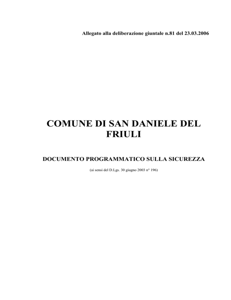 Allegato alla deliberazione giuntale n.81 del 23.03.2006 COMUNE DI SAN DANIELE DEL FRIULI DOCUMENTO PROGRAMMATICO SULLA SICUREZZA (ai sensi del D.Lgs. 30 giugno 2003 n° 196) Sommario 1 INTRODUZIONE 3 1.1 FONTI NORMATIVE ................................................................................................................................................. 3 1.2 PREMESSA............................................................................................................................................................ 3 2 ELENCO DEI TRATTAMENTI DEI DATI PERSONALI 4 2.1 ANALISI ED ELENCO DEI DATI PERSONALI, SENSIBILI E GIUDIZIARI.................................................................................. 4 2.1.1 Trattamento con strumenti elettronici...................................................................................................... 4 2.1.2 Trattamento senza l’ausilio di strumenti elettronici................................................................................ 4 2.1.3 Altri trattamenti dati esterni alla sede comunale..................................................................................... 5 3 CARATTERISTICHE DI AREE, LOCALI E STRUMENTI CON CUI SI EFFETTUANO I TRATTAMENTI 6 3.1 DESCRIZIONE DEL SISTEMA INFORMATICO COMUNALE................................................................................................ 6 3.1.1 Hardware.................................................................................................................................................. 7 3.1.2 Software.................................................................................................................................................... 7 4 MANSIONARIO PRIVACY ED INTERVENTI FORMATIVI DEGLI INCARICATI 8 4.1 STRUTTURA ORGANIZZATIVA FUNZIONALE AL TRATTAMENTO DATI E SINGOLE RESPONSABILITÀ........................................... 8 4.1.1 Individuazione delle figure previste dal D.Lgs. n° 196/03....................................................................... 8 5 ANALISI DEI RISCHI CHE INCOMBONO SUI DATI 17 5.1 ANALISI DEI RISCHI SUI LUOGHI FISICI..................................................................................................................... 17 5.2 ANALISI DEI RISCHI SULLE RISORSE HARDWARE........................................................................................................ 18 5.3 ANALISI DEI RISCHI SULLE RISORSE SOFTWARE......................................................................................................... 19 5.4 ANALISI DEI RISCHI SULLE RISORSE DATI................................................................................................................. 19 6 MISURE DI SICUREZZA ADOTTATE O DA ADOTTARE 20 6.1 MISURE DI SICUREZZA DI TIPO FISICO...................................................................................................................... 20 6.2 MISURE DI SICUREZZA DI TIPO LOGICO.................................................................................................................... 20 6.3 MISURE DI SICUREZZA DI TIPO ORGANIZZATIVO........................................................................................................ 21 6.4 POLITICA DELLE PASSWORD................................................................................................................................... 22 6.5 PIANO DI VERIFICA DELLE MISURE ADOTTATE........................................................................................................... 22 6.6 PIANO DI FORMAZIONE DEGLI INCARICATI................................................................................................................ 22 6.7 AFFIDAMENTO DATI PERSONALI ALL’ESTERNO ......................................................................................................... 23 6.8 PROGRAMMA DI REVISIONE ED ADEGUAMENTO......................................................................................................... 23 6.9 DICHIARAZIONE DI IMPEGNO E FIRMA...................................................................................................................... 23 PERIODICITÀ DELLE VERIFICHE PREVISTE DAL DISCIPLINARE TECNICO 24 SISTEMA INFORMATICO COMUNALE: REQUISITI HARDWARE 26 SISTEMA INFORMATICO COMUNALE: REQUISITI SOFTWARE 30 DECRETO NOMINA RESPONSABILI TRATTAMENTO DATI (1) 48 LETTERA TIPO NOMINA INCARICATI(1) 53 MANUALE OPERATIVO PER L’APPLICAZIONE DELLE MISURE DI SICUREZZA 56 (AD USO DEGLI INCARICATI) 56 DELIBERA GIUNTALE PER L’ADOZIONE DEL DOCUMENTO PROGRAMMATICO 61 (IN TERMINI DI AGGIORNAMENTO) 61 MODELLO DI LETTERA PER TRATTAMENTO EFFETTUATO DA TERZI DI DATI PERSONALI DI NATURA NON SENSIBILE DI CUI È TITOLARE IL COMUNE (1) 65 - 1 - MODELLO DI LETTERA PER TRATTAMENTO EFFETTUATO DA TERZI DI DATI PERSONALI DI NATURA SENSIBILE DI CUI È TITOLARE IL COMUNE (1) - 2 - 67 1 INTRODUZIONE 1.1 Fonti normative Le disposizioni di legge principali concernenti la corretta gestione di sistemi informatici sono: • 1.2 D.Lgs. 30.6.2003 n°196. Premessa Scopo di questo documento programmatico sulla sicurezza (nel seguito denominato più semplicemente DPSS) è di delineare il quadro delle misure di sicurezza organizzative fisiche e logiche adottate per il trattamento dei dati personali effettuati da questo Ente. Conformemente a quanto previsto dal Disciplinare Tecnico (Allegato B del D.Lgs. n° 196/03) il presente documento contiene idonee informazioni riguardanti: • l’elenco dei trattamenti di dati personali; • la distribuzione dei compiti e delle responsabilità nell’ambito delle strutture preposte al trattamento dei dati; • l’analisi dei rischi che incombono sui dati; • le misure da adottare per garantire l’integrità e la disponibilità dei dati, nonché la protezione delle aree e dei locali, rilevanti ai fini della loro custodia e accessibilità; • la descrizione dei criteri e delle modalità per il ripristino della disponi