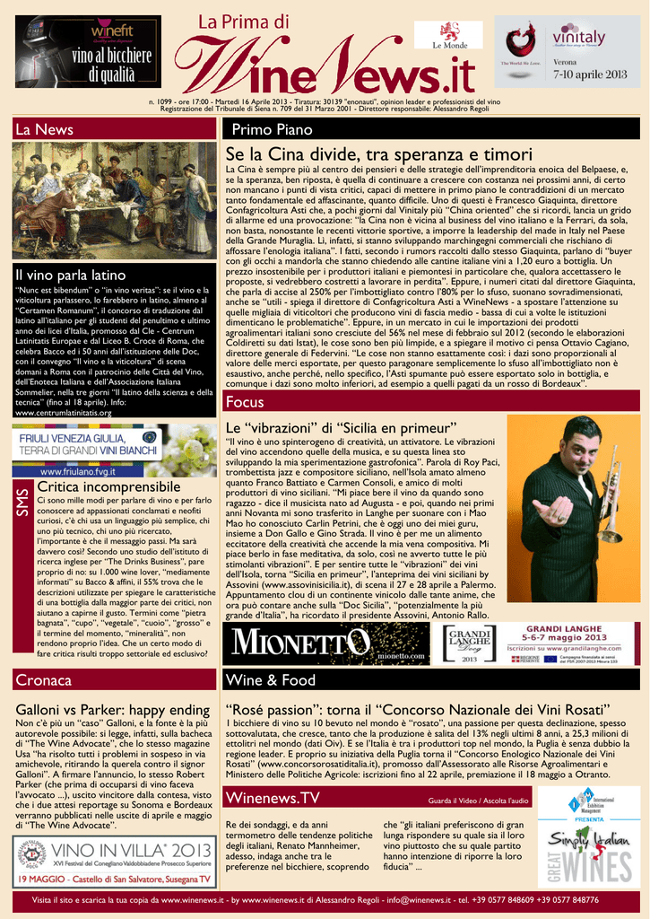 n. 1099 - ore 17:00 - Martedì 16 Aprile 2013 - Tiratura: 30139 "enonauti", opinion leader e professionisti del vino Registrazione del Tribunale di Siena n. 709 del 31 Marzo 2001 - Direttore responsabile: Alessandro Regoli La News Primo Piano Se la Cina divide, tra speranza e timori Il vino parla latino “Nunc est bibendum” o “in vino veritas”: se il vino e la viticoltura parlassero, lo farebbero in latino, almeno al “Certamen Romanum”, il concorso di traduzione dal latino all’italiano per gli studenti del penultimo e ultimo anno dei licei d’Italia, promosso dal Cle - Centrum Latinitatis Europae e dal Liceo B. Croce di Roma, che celebra Bacco ed i 50 anni dall’istituzione delle Doc, con il convegno “Il vino e la viticoltura” di scena domani a Roma con il patrocinio delle Città del Vino, dell’Enoteca Italiana e dell’Associazione Italiana Sommelier, nella tre giorni “Il latino della scienza e della tecnica” (fino al 18 aprile). Info: www.centrumlatinitatis.org La Cina è sempre più al centro dei pensieri e delle strategie dell’imprenditoria enoica del Belpaese, e, se la speranza, ben riposta, è quella di continuare a crescere con costanza nei prossimi anni, di certo non mancano i punti di vista critici, capaci di mettere in primo piano le contraddizioni di un mercato tanto fondamentale ed affascinante, quanto difficile. Uno di questi è Francesco Giaquinta, direttore Confagricoltura Asti che, a pochi giorni dal Vinitaly più “China oriented” che si ricordi, lancia un grido di allarme ed una provocazione: “la Cina non è vicina al business del vino italiano e la Ferrari, da sola, non basta, nonostante le recenti vittorie sportive, a imporre la leadership del made in Italy nel Paese della Grande Muraglia. Lì, infatti, si stanno sviluppando marchingegni commerciali che rischiano di affossare l’enologia italiana”. I fatti, secondo i rumors raccolti dallo stesso Giaquinta, parlano di “buyer con gli occhi a mandorla che stanno chiedendo alle cantine italiane vini a 1,20 euro a bottiglia. Un prezzo insostenibile per i produttori italiani e piemontesi in particolare che, qualora accettassero le proposte, si vedrebbero costretti a lavorare in perdita”. Eppure, i numeri citati dal direttore Giaquinta, che parla di accise al 250% per l’imbottigliato contro l’80% per lo sfuso, suonano sovradimensionati, anche se “utili - spiega il direttore di Confagricoltura Asti a WineNews - a spostare l’attenzione su quelle migliaia di viticoltori che producono vini di fascia medio - bassa di cui a volte le istituzioni dimenticano le problematiche”. Eppure, in un mercato in cui le importazioni dei prodotti agroalimentari italiani sono cresciute del 56% nel mese di febbraio sul 2012 (secondo le elaborazioni Coldiretti su dati Istat), le cose sono ben più limpide, e a spiegare il motivo ci pensa Ottavio Cagiano, direttore generale di Federvini. “Le cose non stanno esattamente così: i dazi sono proporzionali al valore delle merci esportate, per questo paragonare semplicemente lo sfuso all’imbottigliato non è esaustivo, anche perché, nello specifico, l’Asti spumante può essere esportato solo in bottiglia, e comunque i dazi sono molto inferiori, ad esempio a quelli pagati da un rosso di Bordeaux”. Focus SMS Le “vibrazioni” di “Sicilia en primeur” Critica incomprensibile Ci sono mille modi per parlare di vino e per farlo conoscere ad appassionati conclamati e neofiti curiosi, c’è chi usa un linguaggio più semplice, chi uno più tecnico, chi uno più ricercato, l’importante è che il messaggio passi. Ma sarà davvero così? Secondo uno studio dell’istituto di ricerca inglese per “The Drinks Business”, pare proprio di no: su 1.000 wine lover, “mediamente informati” su Bacco & affini, il 55% trova che le descrizioni utilizzate per spiegare le caratteristiche di una bottiglia dalla maggior parte dei critici, non aiutano a capirne il gusto. Termini come “pietra bagnata”, “cupo”, “vegetale”, “cuoio”, “grosso” e il termine del momento, “mineralità”, non rendono proprio l’idea. Che un certo modo di fare critica risulti troppo settoriale ed esclusivo? “Il vino è uno spinterogeno di creatività, un attivatore. Le vibrazioni del vino accendono quelle della musica, e su questa linea sto sviluppando la mia sperimentazione gastrofonica”. Parola di Roy Paci, trombettista jazz e compositore siciliano, nell’Isola amato almeno quanto Franco Battiato e Carmen Consoli, e amico di molti produttori di vino siciliani. “Mi piace bere il vino da quando sono ragazzo - dice il musicista nato ad Augusta - e poi, quando nei primi anni Novanta mi sono trasferito in Langhe per suonare con i Mao Mao ho conosciuto Carlin Petrini, che è oggi uno dei miei guru, insieme a Don Gallo e Gino Strada. Il vino è per me un alimento eccitatore della creatività che accende la mia vena compositiva. Mi piace berlo in fase meditativa, da solo, così ne avverto tutte le più stimolanti vibrazioni”. E per sentire tutte le “vibrazioni” dei vini dell’Isola, torna “Sicilia en primeur”, l’anteprima dei vini siciliani by Assovini (www.assovinisicilia.it), di scena il 27 e 28 aprile a Palermo. Appuntamento clou di un continente vinicolo dalle tante anime, che ora può contare anche sulla “Doc Sicilia”, “potenzialmente la più grande d’Italia”, ha ricordato il presidente Assovini, Antonio Rallo. Cronaca Wine & Food Galloni vs Parker: happy ending “Rosé passion”: torna il “Concorso Nazionale dei Vini Rosati” Non c’è più un “caso” Galloni, e la fonte è la più autorevole possibile: si legge, infatti, sulla bacheca di “The Wine Advocate”, che lo stesso magazine Usa “ha risolto tutti i problemi in sospeso in via amichevole, ritirando la querela contro il signor Galloni”. A firmare l’annuncio, lo stesso Robert Parker (che prima di occuparsi di vino faceva l’avvocato ...), uscito vincitore dalla c