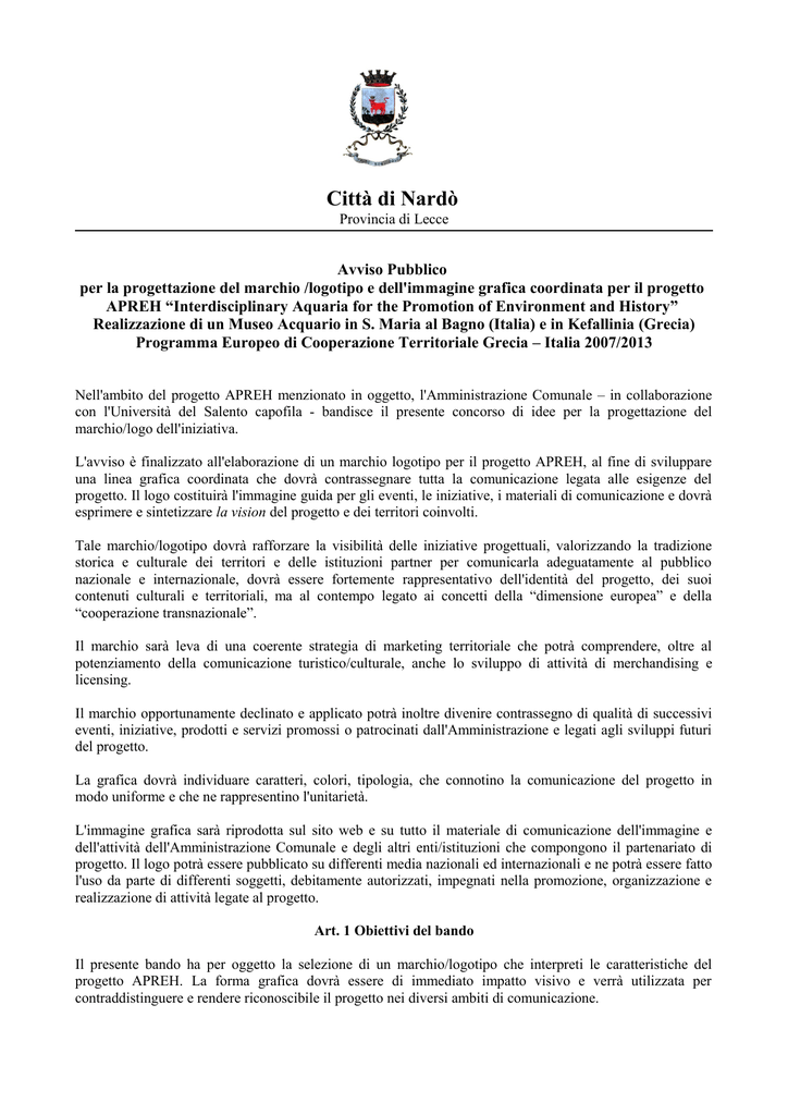 Città di Nardò Provincia di Lecce Avviso Pubblico per la progettazione del marchio /logotipo e dell'immagine grafica coordinata per il progetto APREH “Interdisciplinary Aquaria for the Promotion of Environment and History” Realizzazione di un Museo Acquario in S. Maria al Bagno (Italia) e in Kefallinia (Grecia) Programma Europeo di Cooperazione Territoriale Grecia – Italia 2007/2013 Nell'ambito del progetto APREH menzionato in oggetto, l'Amministrazione Comunale – in collaborazione con l'Università del Salento capofila - bandisce il presente concorso di idee per la progettazione del marchio/logo dell'iniziativa. L'avviso è finalizzato all'elaborazione di un marchio logotipo per il progetto APREH, al fine di sviluppare una linea grafica coordinata che dovrà contrassegnare tutta la comunicazione legata alle esigenze del progetto. Il logo costituirà l'immagine guida per gli eventi, le iniziative, i materiali di comunicazione e dovrà esprimere e sintetizzare la vision del progetto e dei territori coinvolti. Tale marchio/logotipo dovrà rafforzare la visibilità delle iniziative progettuali, valorizzando la tradizione storica e culturale dei territori e delle istituzioni partner per comunicarla adeguatamente al pubblico nazionale e internazionale, dovrà essere fortemente rappresentativo dell'identità del progetto, dei suoi contenuti culturali e territoriali, ma al contempo legato ai concetti della “dimensione europea” e della “cooperazione transnazionale”. Il marchio sarà leva di una coerente strategia di marketing territoriale che potrà comprendere, oltre al potenziamento della comunicazione turistico/culturale, anche lo sviluppo di attività di merchandising e licensing. Il marchio opportunamente declinato e applicato potrà inoltre divenire contrassegno di qualità di successivi eventi, iniziative, prodotti e servizi promossi o patrocinati dall'Amministrazione e legati agli sviluppi futuri del progetto. La grafica dovrà individuare caratteri, colori, tipologia, che connotino la comunicazione del progetto in modo uniforme e che ne rappresentino l'unitarietà. L'immagine grafica sarà riprodotta sul sito web e su tutto il materiale di comunicazione dell'immagine e dell'attività dell'Amministrazione Comunale e degli altri enti/istituzioni che compongono il partenariato di progetto. Il logo potrà essere pubblicato su differenti media nazionali ed internazionali e ne potrà essere fatto l'uso da parte di differenti soggetti, debitamente autorizzati, impegnati nella promozione, organizzazione e realizzazione di attività legate al progetto. Art. 1 Obiettivi del bando Il presente bando ha per oggetto la selezione di un marchio/logotipo che interpreti le caratteristiche del progetto APREH. La forma grafica dovrà essere di immediato impatto visivo e verrà utilizzata per contraddistinguere e rendere riconoscibile il progetto nei diversi ambiti di comunicazione. Art. 2 Condizioni di partecipazione La partecipazione è aperta a tutti. Ogni singolo o gruppo o società o azienda o istituto scolastico può presentare un solo elaborato. Ogni componente di un gruppo non potrà partecipare al progetto di un gruppo diverso, pena l'esclusione di entrambi gli elaborati. Ogni gruppo dovrà nominare un suo componente quale delegato a rappresentare il gruppo stesso. Art. 3 Incompatibilità Oltre ai motivi di esclusione di cui all'art. 2, non possono partecipare al concorso: − − − − − i membri effettivi o supplenti della Commissione giudicatrice; le società di cui uno o più componenti della Commissione abbiano partecipazioni dirette o indirette; le società che hanno alle proprie dipendenze uno o più componenti della Commissione; i parenti fino al terzo grado dei membri della Commissione; i dipendenti del Comune di Nardò impegnati nell'iniziativa. Art. 4 Caratteristiche del logo Il marchio logotipo dovrà rispondere ai criteri strategici del progetto, con particolare riferimento alla dimensione europea delle attività progettuali e caratterizzare un progetto di valorizzazione del territorio che tengo conto della vocazione euromediterranea dell'iniziativa e della volontà di offrire un apporto duraturo in termini di arricchimento dell'offerta turistico/culturale. Il marchio/logotipo dovrà possedere forte carattere emozionale e avere caratteristiche di originalità, esclusività e non dovrà essere già presente e/o utilizzato sul mercato. Il progettista potrà proporre, sia nella progettazione del logo sia nella sua applicazione, qualsiasi soluzione purchè siano rispettati i seguenti requisiti: − − − − attinenza alle caratteristiche ed agli obiettivi del progetto APREH; originalità, riconoscibilità, efficacia; economicità di realizzazione e gestione; riproducibilità su vari tipi di supporti e media ( a colori, retinato, monocromatico), anche con sistemi che consentono un controllo tecnico parziale (fax, immagine su monitor, stampa laser, etc..). Inoltre: − il titolo/acronimo su cui lavorare è “A.Pr.E.H”. Il logo di progetto dovrà rispecchiare la mission di − − − − progetto. L’immagine coordinata dovrà prevedere l’integrazione del logo di progetto proposto con il logo dell’Unione Europea, con il logo del Programma “European Territorial Cooperation Programme Greece/Italy 2007-2013” e con il suo slogan “Investing in our future”; il logo deve essere suscettibile di riduzione o di ingrandimento, senza perdere di forza comunicativa, mantenere visibilità, riconoscibilità, equilibrio e valori estetici a qualsiasi scala, sia in versione statica che dinamica (motion graphic); deve essere facilmente memorizzabile, realizzando la massima coesione possibile tra parte grafica e parole utilizzate; deve essere comprensibile e utilizzabile in tutto il mondo; prevedere l'applicazione in abbinamento ad altri marchi istituzionali (es. Pubblica Amministrazione, enti, istituzioni, etc..). Il logo sarà utilizzato per tutti gli strumenti di comun