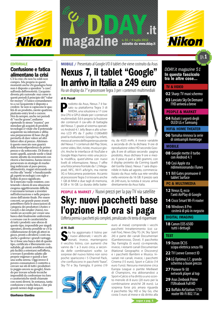 n. 51 / 9 luglio 2012 estratto da www.dday.it p.1 EDITORIALE Confusione e fatica alimentano la crisi C’è la crisi: chi non ha soldi non compra. Ma proprio in questi momenti anche chi guadagna bene non è disposto a spendere “a caso”, sull’onda dell’emotività. L’acquisto diventa più razionale: mai come in questi periodi il principio del “value for money” è l’unico comandamento a cui l’acquirente è disposto a credere. Se non si capiscono le qualità di un prodotto, niente quattrini, piuttosto entry level e correre. Noi da sempre, anche nei periodi di “vacche grasse”, andiamo ripetendo lo stesso “mantra”: per stimolare gli acquisti di prodotti tecnologici è vitale che il potenziale acquirente sia informato e abbia una preparazione di base che gli permetta di dare valore ad altri fattori oltre al prezzo. Altrimenti questo mercato non guarirà dalla tossicodipendenza da primo prezzo e da sottocosto. Di fronte ai nostri appelli, aziende sorde o fatalmente attratte da investimenti con ritorni a brevissimo, hanno invece perseverato in strategie di marketing indirizzate al puro prezzo, all’emotività, magari strizzando un occhio alla “moda” o banalizzando gli aspetti tecnologici con sigle e bollini di poco significato. Se il mercato vuole resistere, contenendo i danni di una situazione esogena oggettivamente difficile, è necessario tornare a investire nell’informazione e nella preparazione dell’utente finale. Per essere concreti, un grande passo avanti potrebbero farlo le associazioni di categoria dei produttori (Anitec e Ceced) e dei retailer (Aires), trovando un accordo per creare una banca dati finalmente uniformata e comune con le caratteristiche di tutti i prodotti: uno sforzo di questo tipo, impossibile per singoli operatori, diventa possibile se c’è la collaborazione di tutti gli attori in gioco, pronti a dividersi i costi ma anche a goderne i grandi vantaggi. Se ci fosse una banca dati di questo tipo, certificata e liberamente consultabile, gli utenti avrebbero molta più facilità a orientarsi nell’offerta, a trovare il prodotto adatto alle proprie esigenze e quindi a fare una scelta serena. Oggi invece il povero consumatore è costretto a cercare sui siti di tutti i produttori (o peggio ancora su google), finendo per trovare schede tecniche impossibili da confrontare tra loro e caratteristiche simili chiamate con nomi diversi. In sostanza, tanta confusione e molta fatica, i due più grandi nemici degli acquisti. Gianfranco Giardina MOBILE / Presentato al Google I/O il tablet che viene costruito da Asus Nexus 7, il tablet “Google” In arrivo in Italia a 249 euro Ha un display da 7” e processore Tegra 3 per i contenuti multimediali di R. Pezzali P rodotto da Asus, Nexus 7 è basato su piattaforma Tegra 3 di NVIDIA, una soluzione a 17 core (tra CPU e GPU) ideale per i contenuti multimediali. Ed è proprio la fruizione dei contenuti il cav-allo di battaglia del Nexus 7, grazie al sistema operativo Android 4.1 Jelly Bean e allo schermo LCD IPS da 7 pollici (1280x800 pixel la risoluzione). Google ha, infatti, messo al centro dell’esperienza utente del Nexus 7 i contenuti del Play Store, come video, libri, riviste, musica e giochi. Anche le interfacce di YouTube e Google Maps hanno visto una piccola modifica, quest’ultima con nuovi livelli di informazione. Nexus 7 offre una fotocamera frontale da 1.2 Megapixel, NFC, Wi-Fi a/b/g/n, ma niente 3G o fotocamera posteriore. Accanto al processore Tegra 3 si trovano anche 1 GB di RAM e due tagli di memoria, 8 GB e 16 GB. La durata della batte- DDAY.it magazine 51 In questo fascicolo tra le altre cose... TV & VIDEO 02 Sharp: TV maxi schermo 03 Lanciato Sky On Demand l’HD arriverà a breve PEOPLE & MARKET 04 Rubati i segreti degli OLED LG e Samsung HIFI& HOME THEATER ria, da 4325 mAh, è invece variabile a seconda di chi la dichiara: 9 ore di riproduzione video HD secondo Google, 8 ore di utilizzo secondo pagina prodotto, Asus dichiara 9 ore e mezzo. Il peso è pari a 340 grammi, con il display protetto da Corning (quelli del Gorilla Glass). Nexus 7 sarà disponibile in Italia ad agosto, commercializzato da Asus nella sua rete vendita nella versione da 16 GB. Il prezzo sarà di 249 euro, la notizia è sicura: arriva direttamente da Asus Italia. 06 Yamaha rinnova la serie di sintoampli Aventage MOBILE 08 Google mette il turbo con Android 4.1 10 Così Apple sta ridimensionando iTunes 11 Bill Gates promuove il tablet Surface PC & MULTIMEDIA PEOPLE & MARKET / Nuovi prezzi per la pay TV via satellite 12 Nexus Q, ecco l’anti AirPlay di Google 14 Cisco Smart Wi-Fi router 16 Windows 8 Pro costerà di più in negozio L’offerta premia i pacchetti più completi, penalizzato chi tenta di risparmiare DIGITAL IMAGING Sky: nuovi pacchetti base l’opzione HD ora si paga di M. Dalli S ky ha aggiornato il listino per i nuovi abbonati; i vecchi abbonati, invece, mantengono il vecchio listino, con aumenti che vanno da 1 a 3 euro circa, a seconda delle combinazioni scelte. Le sorprese del nuovo listino non sono poche: spariscono i 5 Channel Pack, che confluiscono in pacchetti “base”, Sky TV e Sky Famiglia. Il primo (19 euro al mese) comprende i vecchi pacchetti Intrattenimento (coi canali Fox), News (Sky TG 24, Sky Sport 24) e parte dei canali Documentari (Gamberorosso, Dove). Il pacchetto Sky Famiglia (5 euro) co-mprende, invece, i restanti canali Documentari (National Geographic e Discovery) e i pacchetti Bambini e Musica. Invariati nei canali, invece, i pacchetti Cinema (15 euro), Sport e Calcio (14 euro l’uno). Nessuna menzione circa Europa League o partite Mediaset di Champions, ma abbonandosi a Sport+Calcio si ha diritto a uno sconto mensile di 8 euro (20 euro per la combinazione anziché 28 euro). La sorpresa forse più amara riguarda il pacchetto Sky HD e Sky Go, che costa 5 euro al mese e dà diritto alla segue a pag. 5 18 Canon EOS 650D tutti i dettagli TEST 19 Dyson DC35 scopa elettrica senza