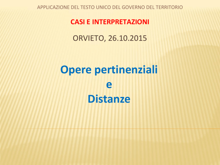 APPLICAZIONE DEL TESTO UNICO DEL GOVERNO DEL TERRITORIO CASI E INTERPRETAZIONI ORVIETO, 26.10.2015 Opere pertinenziali e Distanze APPLICAZIONE DEL TESTO UNICO DEL GOVERNO DEL TERRITORIO CASI E INTERPRETAZIONI OPERE PERTINENZIALI: IL REGOLAMENTO REGIONALE N. 02/2015 Art. 21 - Opere Pertinenziali (Op) 1. Si definiscono opere pertinenziali i manufatti che, pur avendo una propria individualità ed autonomia sono posti in durevole ed esclusivo rapporto di proprietà, di subordinazione funzionale o ornamentale, con uno o più edifici principali di cui fanno parte e sono caratterizzati: a) dalla oggettiva strumentalità; b) dalla limitata dimensione; c) dalla univoca destinazione d’uso; d) dalla collocazione in aderenza o a distanza non superiore a 30 metri lineari dall’edificio principale o ricadenti, comunque, all’interno del lotto di insediamenti di cui agli articoli 91, 94, 95, 96 e 97, o da realizzare nelle aree pubbliche indipendentemente dalla presenza di edifici e fatte salve distanze superiori rese obbligatorie da norme di sicurezza o igienico sanitarie o qualora si tratti di opere di recinzione o di muri di sostegno; e) dal rapporto di proprietà o di altro titolo equipollente. (…) 6. La distanza di cui al comma 1, lettera d) si misura con le modalità previste al comma 1 dell’articolo 23, dalla parete dell’edificio principale alla parete dell’edificio pertinenziale o alla linea perimetrale delle opere pertinenziali più vicina all’edificio principale medesimo. OPERE PERTINENZIALI: IL CODICE CIVILE (E LA GIURISPRUDENZA) Art. 817 del Codice Sono pertinenze le cose destinate in modo durevole a servizio o ad ornamento di un'altra cosa. La destinazione può essere effettuata dal proprietario della cosa principale o da chi ha un diritto reale sulla medesima Consiglio di Stato, sez. IV, sentenza 08/08/2006 n° 4780 Si intendono per pertinenze, ai sensi dell’art. 817 del codice civile, "le cose destinate in modo durevole a servizio o ad ornamento di un’altra cosa", cioè – secondo la unanime rappresentazione che di tali opere è fatta – quelle non costituenti in opere autonome ma in una pertinenza dell’immobile già esistente. In questo senso si è espressa la Quarta Sezione del Consiglio di Stato, in una vicenda nella quale il ricorrente si era visto opporre diniego di rilascio di titolo edificatorio in quanto l’opera che intendeva realizzare (una piscina all’interno della proprietà privata di cui è titolare) non era ritenuta dal Comune una pertinenza, accessoria al fabbricato ad uso abitativo già esistente, bensì un autentico manufatto configurante una nuova edificazione. APPLICAZIONE DEL TESTO UNICO DEL GOVERNO DEL TERRITORIO CASI E INTERPRETAZIONI Il comma 1 del R.R. 02/2015: a) Definisce e caratterizza univocamente gli interventi definibili ‘opere pertinenziali’; b) Stabilisce le diverse condizioni perché un’opera possa essere qualificata come ‘pertinenza’: oggettiva strumentalità; limitata dimensione; univoca destinazione d’uso; collocazione in aderenza o a distanza non superiore a 30 metri dall’edificio principale o, comunque, interna al lotto in area urbana; rapporto di proprietà o altro titolo equipollente; rispetto degli aspetti discrezionali precisati nel REC/PRG, nei limiti del comma 2. Le varie e diverse condizioni richieste sono tutte coessenziali, l’assenza di uno solo dei requisiti richiesti non permette la classificazione dell’opera come ‘pertinenza’ … con le problematiche conseguenti … APPLICAZIONE DEL TESTO UNICO DEL GOVERNO DEL TERRITORIO CASI E INTERPRETAZIONI MA CHE SI INTENDE PER EDIFICIO PRINCIPALE ? APPLICAZIONE DEL TESTO UNICO DEL GOVERNO DEL TERRITORIO CASI E INTERPRETAZIONI LA REGIONE UMBRIA HA CHIARITO … che gli Edifici ‘PRINCIPALI’ dell’art. 21 comma 1 del RR 02/2015 sono quelli a destinazione residenziale, produttiva o per servizi. L’art. 155 della L.R. n. 01/2015 al comma 3 individua le seguenti tre categorie principali di destinazione d’uso, indipendentemente dalle diverse tipologie di attività, riconducibili alle stesse: a) Residenziale; b) Produttiva, compresa quella agricola; c) Attività di servizi come definite all’art. 7 comma 1 lettera ‘l’. APPLICAZIONE DEL TESTO UNICO DEL GOVERNO DEL TERRITORIO CASI E INTERPRETAZIONI OPERE PERTINENZIALI: IL REGOLAMENTO REGIONALE N. 02/2015 Art. 21 - Opere Pertinenziali (Op) (…) 2. Le opere pertinenziali, ove siano verificate le caratteristiche di cui al comma 1 e comunque fatte salve le disposizioni del regolamento comunale per l’attività edilizia e dello strumento urbanistico, sulle tipologie e sui materiali utilizzabili, sono differenziate secondo quanto previsto ai commi 3 e 4. 3. Le opere pertinenziali di cui agli articoli 7, comma 1, lettera e), punto 6 (CIOE’: CHE COMPORTANO SUC) e 118, comma 1, lettera d) del TU (CIOE’: QUELLI ELENCATI AL PRESENTE COMMA, ED ANCHE GLI ELEMENTI DI ARREDO URBANO E SEGNALETICA DA REALIZZARE NELLA AREE PUBBLICHE ED A SERVIZIO DELLA VIABILITA’), eseguibili senza titolo abilitativo purché, ai sensi dello stesso articolo 118, comma 4 del TU, non riguardino gli edifici di interesse storico - artistico o classificabili come edilizia tradizionale integra, di cui alla deliberazione di Giunta regionale n. 420 del 19 marzo 2007 (Disciplina degli interventi di recupero del patrimonio edilizio esistente .. 4. Le opere pertinenziali di cui agli articoli 7, comma 1, lettera e), punto 6 (CIOE’: CHE COMPORTANO SUC) e 124, comma 1, lettere c) e d) del TU (CIOE’: CHE NON COMPORTANO SUC, RAPPRESENTATE NELLO SPECIFICO DA: MANUFATTI TEMPORANEI, SENZA STRUTTURE FONDALI O COPERTURA FISSA, A STRUTTURA LEGGERA AD ESCLUSIVO SERVIZIO DI ATTIVITA’ ZOOTECNICHE, PER LA DURATA DELL’ATTIVITA’ ZOOTECNICA STESSA; SERVIZI IGIENICI PER LA SOSTA TEMPORANEA DI CAMPEGGIATORI NELLE ATTIVITA’ AGRITURISTICHE FINO A MQ 20,00 DI SUC; OPERE PERTINENZIALI RIGUARDANTI IMMOBILI DI INTERESSE STORICO/ARTISTICO O IMMOBILI CLASS