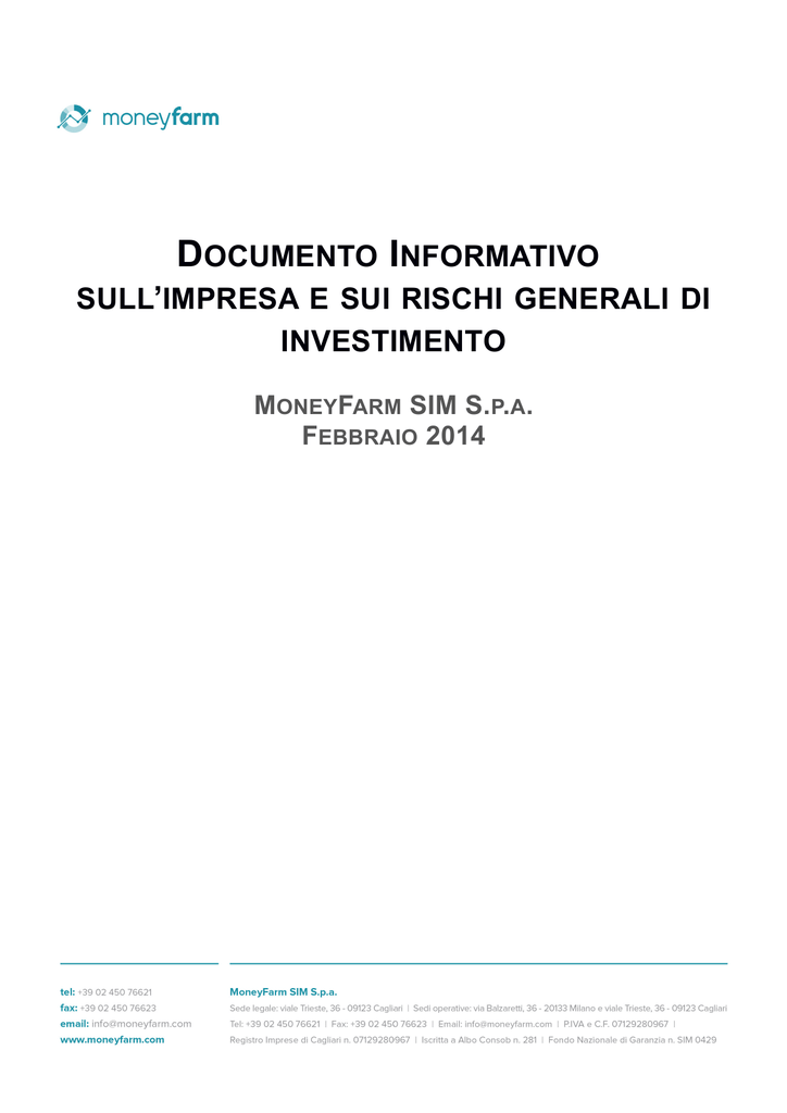 DOCUMENTO INFORMATIVO SULL’IMPRESA E SUI RISCHI GENERALI DI INVESTIMENTO MONEYFARM SIM S.P.A. FEBBRAIO 2014 Indice 1.INFORMAZIONI SULL'INTERMEDIARIO E I SUOI SERVIZI.................................................................3 2.SERVIZI DI INVESTIMENTO AUTORIZZATI AI SENSI DEL TUF............................................................3 3.MODALITÀ DI COMUNICAZIONE TRA IL CLIENTE E LA SIM..............................................................4 4.SERVIZI DI INVESTIMENTO OFFERTI.................................................................................................4 5.INFORMAZIONI SUGLI STRUMENTI FINANZIARI..............................................................................5 6.GLI STRUMENTI FINANZIARI............................................................................................................5 7.RISCHI DEGLI INVESTIMENTI IN STRUMENTI FINANZIARI...............................................................7 8.STRATEGIA DI TRASMISSIONE DEGLI ORDINI................................................................................10 9.RESPONSABILITÀ, RISCHI E ONERI.................................................................................................13 10.DOCUMENTO INFORMATIVO SULLA TRATTAZIONE DEI RECLAMI DELLA CLIENTELA.................14 11.POLICY CONFLITTI DI INTERESSI..................................................................................................14 2 1. INFORMAZIONI SULL'INTERMEDIARIO E I SUOI SERVIZI (art. 29 del Regolamento Intermediari) Dati societari della SIM • • • • • • • • • • • • Denominazione: MoneyFarm SIM S.p.A. (la SIM o la Società) Forma giuridica: società per azioni Iscritta al registro delle imprese di Cagliari n. 07129280967 P.IVA. 07129280967 Sede legale e amministrativa: viale Trieste, 36 – 09123 Cagliari Sedi operative: via Balzaretti, 36 - 20133 Milano e viale Trieste, 36 – 09123 Cagliari Indirizzo telematico: [email protected] Recapito telefonico: +39.02.450 76621 Recapito fax: +39.02.450 76623 Iscritta al n.281 dell’Albo SIM della Consob con delibera n.18125 del 22 febbraio 2012 Capitale sociale sottoscritto e versato: Euro 894.919,00 i.v. Sistemi di garanzia a cui la Sim aderisce: Fondo Nazionale di Garanzia, codice d’iscrizione SIM 0429. Il Fondo Nazionale di Garanzia indennizza gli investitori, nei limiti e alle condizioni previste nel regolamento operativo del Fondo, per i crediti rappresentati da strumenti finanziari e/o da denaro, nei confronti di intermediari aderenti al Fondo e derivanti dalla prestazione dei principali servizi di investimento. La SIM è, inoltre, sottoposta a vigilanza anche della Banca d’Italia, via Nazionale, 91, 00184 - Roma. La SIM presta i servizi di “ricezione e trasmissione ordini” e “consulenza in materia di investimenti” ai sensi dell’art.1, comma 5, lett. e) e f) del Decreto Legislativo n. 58, del 24 febbraio 1998 e successive modifiche ed integrazioni (TUF) e dei relativi regolamenti di attuazione. 2. SERVIZI DI INVESTIMENTO AUTORIZZATI AI SENSI DEL TUF MoneyFarm SIM S.p.A. è autorizzata quale intermediario finanziario dalla Consob, con sede in via G.B. Martini, 3, 00198 - Roma, tel. 06.84771 (centralino), fax 06.8417707, email [email protected], web: http://www.consob.it. e sede secondaria operativa in via Broletto, 7, 20121 – Milano, tel 02.724201, fax 02.89010696. La Società è autorizzata all'esercizio dei servizi di investimento di cui all’art.1, comma 5, TUF, lettere: e) ricezione e trasmissione di ordini; f) consulenza in materia di investimenti. L’autorizzazione alla prestazione dei suddetti servizi è rilasciata con le seguenti limitazioni operative: "senza detenzione, neanche temporanea, delle disponibilità liquide e degli strumenti finanziari della clientela e senza assunzione di rischi da parte della Società stessa". 3. MODALITÀ DI COMUNICAZIONE TRA IL CLIENTE E LA SIM Eventuali comunicazioni tra la Sim ed il cliente, per ricevere il servizio, informazioni e documentazione, come previsto dal Regolamento Intermediari, potranno avvenire in lingua italiana e prevalentemente per posta elettronica agli indirizzi ed ai recapiti sopra indicati al punto 1., oppure attraverso la sezione riservata del sito della SIM (www.moneyfarm.com). Suddette comunicazioni avverranno per posta ordinaria o telefonicamente solo su richiesta espressa del cliente. 4. SERVIZI DI INVESTIMENTO OFFERTI Informativa relativa al servizio di consulenza in materia di investimenti in strumenti finanziari A seguito dell’applicazione in Italia della Direttiva MIFID 2004/39/CE, la consulenza in materia di investimenti è considerata quale servizio di investimento che può essere prestato solo dagli intermediari autorizzati. L’art.1, comma 5 septies, del TUF definisce l’attività di consulenza in materia di investimenti come “la prestazione di raccomandazioni personalizzate a un cliente, dietro sua richiesta o per iniziativa del prestatore del servizio, riguardo a una o più operazioni relative ad un determinato strumento finanziario”. Elemento essenziale dell’attività di consulenza in materia di investimenti è la ‘personalizzazione’: è necessario che la ‘raccomandazione personalizzata’ sia diretta ad uno specifico investitore, deve essere basata sulle caratteristiche specifiche della persona (necessità di valutare il servizio prestato in termini di ‘adeguatezza’, basata su conoscenza ed esperienza in materia di servizi di investimento e strumenti finanziari, la situazione finanziaria, gli obiettivi di investimento e la propensione al rischio) e deve avere ad oggetto una specifica operazione di investimento in strumenti finanziari: comprare, vendere, sottoscrivere, scambiare, riscattare, detenere un determinato strumento finanziario o assumere garanzie nei confronti dell’emittente rispetto a tale strumento, esercitare o non esercitare qualsiasi diritto conferito da un determinato strumento finanz