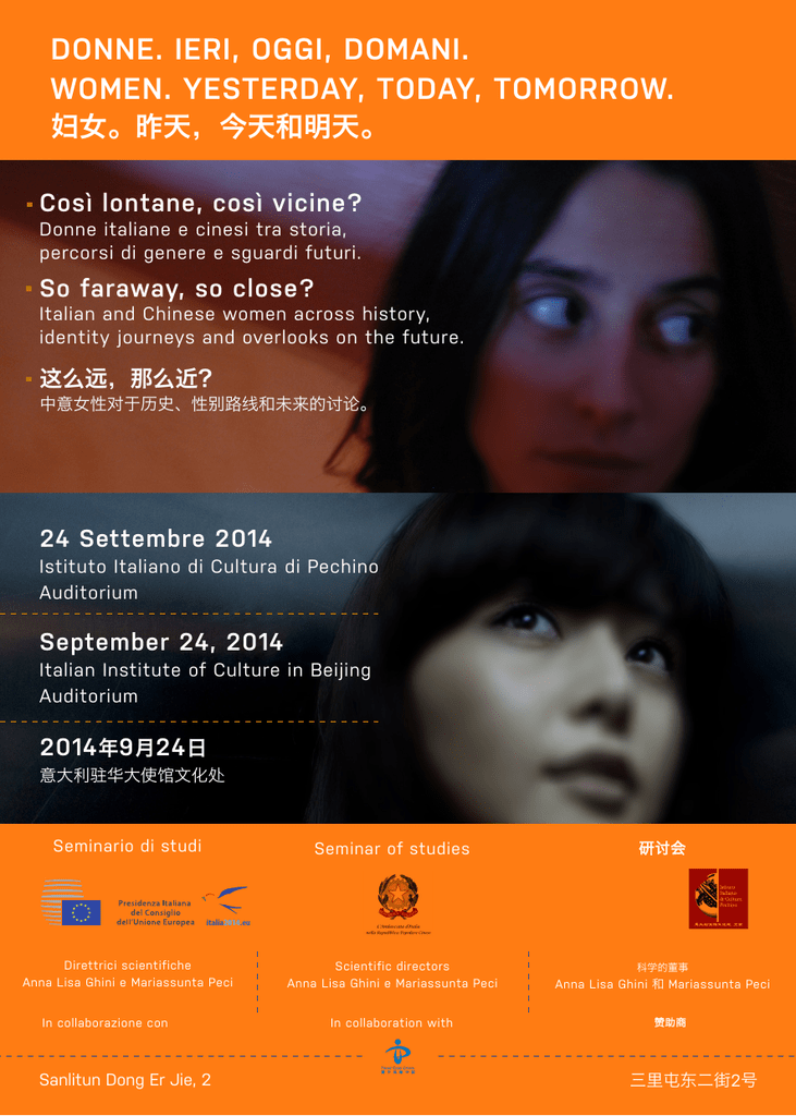 DONNE. IERI, OGGI, DOMANI. WOMEN. YESTERDAY, TODAY, TOMORROW. 妇女。昨天,今天和明天。 Così lontane, così vicine? Donne italiane e cinesi tra storia, percorsi di genere e sguardi futuri. So faraway, so close? Italian and Chinese women across history, identity journeys and overlooks on the future. 这么远,那么近? 中意女性对于历史、性别路线和未来的讨论。 24 Settembre 2014 Istituto Italiano di Cultura di Pechino Auditorium September 24, 2014 Italian Institute of Culture in Beijing Auditorium 2014 年9 月24 日 意大利驻华大使馆文化处 Seminario di studi Seminar of studies 研讨会 Scientific directors Anna Lisa Ghini e Mariassunta Peci Anna Lisa Ghini 和 Mariassunta Peci italia2014.eu Direttrici scientifiche Anna Lisa Ghini e Mariassunta Peci In collaborazione con Sanlitun Dong Er Jie, 2 In collaboration with 科学的董事 赞助商 三里屯东二街2号 Programma 14.00 Registrazione dei partecipanti 14.30 Alberto Bradanini, Ambasciatore d’Italia Saluto 14:40 Stefania Stafutti, Direttrice dell’Istituto Italiano di Cultura di Pechino Saluto 14.50 Anna Lisa Ghini, moderatrice del seminario Introduzione 15.00 Zhang Lijia, scrittrice, giornalista, commentatrice televisiva Le donne cinesi tra presente e futuro 15.30 Cristina Comencini, regista, scrittrice, sceneggiatrice Nuovi modi di raccontare le donne nel cinema, nella letteratura e nella politica 16.00 Serena Sapegno, docente di letteratura italiana e di women’s studies, Università degli Studi La Sapienza Percorsi di Identità di genere tra epoche e culture 16.30 Coffee break 16.45 Ruixiang Guo, funzionaria di UN Women China Office La dimensione socio-culturale della violenza contro le donne e le ragazze in Cina e modalità’ di affrontarla 17.15 Mariassunta Peci, psicopedagogista Educare al femminile 17.45 Germana Rivi, docente di Lingue e di Relazioni Interculturali Conclusioni 18.00 Dibattito 18.30 Pranzo buffet Seminario in italiano, inglese e cinese con traduzione simultanea Per pre-registrarsi al Seminario scrivere cortesemente a [email protected] Cristina Comencini è regista, scrittrice e sceneggiatrice. Il suo debutto da regista cinematografica avviene nel 1988 con il film Zoo seguito poi dalla sceneggiatura del film Buon Natale... Buon Anno. Ha diretto molti film, tra i più importanti Il più bel giorno della mia vita e La bestia nel Cuore ( nel 2006 questo film è stato scelto per rappresentare l’Italia ai premi Oscar, sezione miglior film straniero). Comencini è autrice di molti romanzi premiati, tra i quali Matrioska, Passione di famiglia, Il cappotto turco e L’illusione del bene. Ha co - fondato con Serena Sapegno, Se non ora quando, importante movimento politico in favore delle donne che il 13 febbraio 2011 ha promosso una manifestazione a Roma con un milione di donne partecipanti per promuovere il rispetto e la dignità delle donne. Anna Lisa Ghini è una studiosa di Politica Internazionale. Ha effettuato ricerche dettagliate su questioni relative a minoranze etniche, conflitti statali e non statali, violenza e non violenza politica. Ha collaborato con IsIAO (Istituto Italiano per l’Africa e l’Oriente) e CeMiSS (Centro Militare di Studi Strategici) di Roma e le Università di Trieste e di Udine. In Asia da quasi quindici anni, ha vissuto in Cina, Giappone, Hong Kong e Pakistan dove, tra il 1999 ed il 2001, ha lavorato all’Università di Karachi con un programma finanziato dalla Commissione Europea. Ghini ha ottenuto il Master dall’Università Lumsa di Roma ed il Dottorato dall’Università di Hull (Gran Bretagna) Ruixiang Guo è Coordinatrice di Programma presso UN Women China Ruixiang Guo ha conseguito il Master in studi di genere e pianificazione rurale e regionale presso l’Asia Institute of Technology in Tailandia (AIT), ha più di venti anni di esperienza del settore dello sviluppo e quindici anni di lavoro nelle agenzie delle Nazioni Unite in Cina. Coordinatrice di Programma presso UN Women China dal marzo 2012, Guo si occupa di programmi ed iniziative relative alla violenza contro le donne e le ragazze, alle questioni di genere e all’AIDS. Mariassunta Peci è psicopedagogista. Ha lavorato per 15 anni per il Ministero dell’istruzione dove è stata responsabile del settore formazione del Forum degli assessorati alle politiche sociali. Ha lavorato in qualità di psicologa presso una Comunità per il recupero dei tossicodipendenti. Per molti anni ha collaborato con la Facoltà di scienze dell’educazione dell’università degli studi di Roma Tre, dove ha insegnato Pedagogia e comunicazione educativa. Ha partecipato a varie conferenze per sensibilizzare contro la violenza femminile. E’ autrice di diverse pubblicazioni sui temi sociali e sul bullismo. Germana Rivi è docente di lingue e di relazioni interculturali. Germana Rivi è da diversi anni docente di lingue ed esperta di questioni relative all’integrazione degli stranieri. Ha anche tenuto docenze su tematiche relative alla cultura dell’infanzia in alcuni paesi dell’estremo oriente, il diverso contesto culturale, storico e sociale, tradizione e modernità nella Cina contemporanea, l’inserimento di bambini e adolescenti cinesi nella scuola italiana dell’obbligo presso il Centro Internazionale per la difesa e lo sviluppo dell’infanzia di Reggio Children (2001). Inoltre, ha lavorato come Ricercatrice presso l’Università di Modena e Reggio Emilia (Dipartimento di Storia Contemporanea) su questioni attinenti le ‘Relazioni interculturali e interreligiose tra Europa e Cina’ (2005-2006) e come esperta di cultura cinese al Master in gestione del business in Cina organizzato dal centro IFOA di Reggio Emilia e dall’Associazione industriali di Modena (2007-2008). Maria Serena Sapegno è docente di letteratura italiana, in particolare del Rinascimento, e di women’s studies presso l’Università degli studi La Sapienza. Attualmente i suoi studi e le sue ricerche focalizzano su