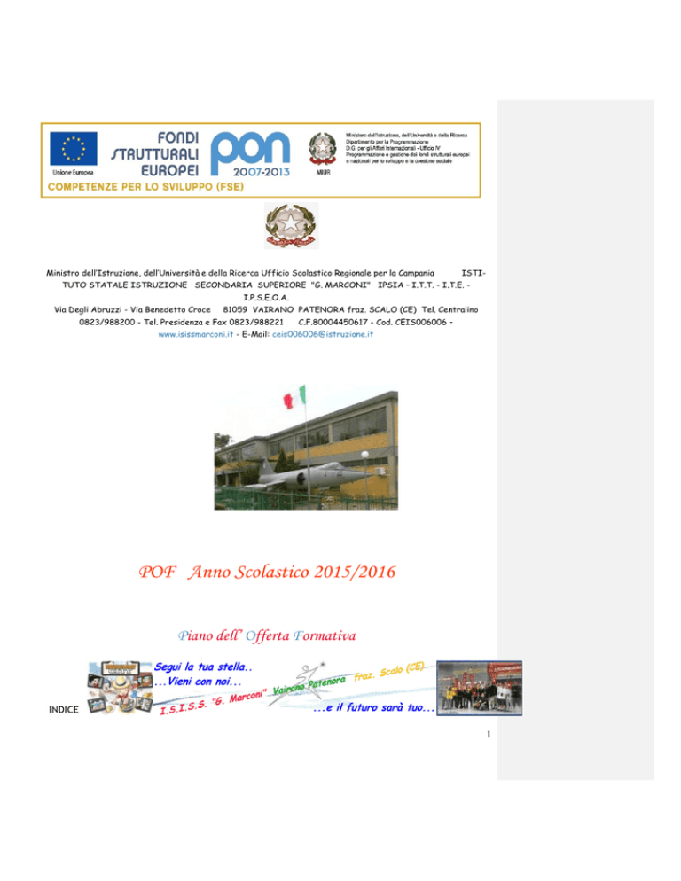 Ministro dell’Istruzione, dell’Università e della Ricerca Ufficio Scolastico Regionale per la Campania ISTI- TUTO STATALE ISTRUZIONE SECONDARIA SUPERIORE "G. MARCONI" IPSIA – I.T.T. - I.T.E. I.P.S.E.O.A. Via Degli Abruzzi - Via Benedetto Croce 81059 VAIRANO PATENORA fraz. SCALO (CE) Tel. Centralino 0823/988200 - Tel. Presidenza e Fax 0823/988221 C.F.80004450617 - Cod. CEIS006006 – www.isissmarconi.it - E-Mail: [email protected] POF Anno Scolastico 2015/2016 Piano dell’ Offerta Formativa INDICE 1 Premessa………………………………………………………………………………………………….pag. 6 Normativa di riferimento…………………………………………………………………………….......pag. 7 CAP. I - Analisi del contesto 1.1 - Lettura del territorio 1.1.1 Condizioni socio-ambientali ……………………………………….…………………..pag. 9 1.1.2 Analisi demografica / analisi economica / livello di alfabetizzazione……….………..pag. 11 1.2 – L’Istituzione scolastica ………………………………………………………………….………pag. 16 1.3 – Descrizione e quantificazione delle risorse………………………………………………………..pag. 17 1.4 - Descrizione delle risorse finanziarie……………………………………………………………….pag.18 CAP. II –Indirizzi di studio 2.1 – Indirizzi del nuovo ordinamento…………………………………………………………………..pag.20 2.2 – Indirizzi del vecchio ordinamento (CORSI SERALI)…………………………………….………pag. 20 2.3 – Quadri orario • a) Quadro orario indirizzo MAT (ex meccanici)…….………………………………... pag.22 • b) Quadro orario indirizzo MAT (ex elettrici)……….……….……………………..… pag.23 • c) Quadro orario indirizzo Produz.Indust.e Artig.(ex TAM)………………………..... pag.24 • d) Quadro orario indirizzo servizi socio-sanitario odontotecnico ……….…………. pag.25 • e) Quadro orario indirizzo enogastronomia e l’ospitalità alberghiera (ex IPSSART)….pag.26 • f) Quadro orario indirizzo trasporti e logistica (ex ITI).. ………………………… pag.28 • g) Quadro orario indirizzo CHIMICA,MATERIALI,BIOTECNOLOGIE AMBIENTALI articolazione BIOTECNOLOGIE AMBIENTALI ……………………………………………………..…. pag.29 • h) Quadro orario indirizzo amministrazione finanza e marketing ( ex ITC) ………… pag.30 • i) Quadro orario serale: tecnico delle industrie elettroniche ed elettriche ………… pag.31 enogastronomia e l’ospitalità alberghiera (ex IPSSART) .… pag.31 CAP. III – Progettazione educativa 3.1 – Profilo in entrata…………………………………………………………………...........................pag.32 3.2 – Scelte formative…………………………………………………………………………………... pag.34 2 • Obiettivi educativi e cognitivi trasversali (1° e 2° anno) ……………………………....pag.35 • Obiettivi educativi e cognitivi trasversali ( 3°, 4° e 5° anno) ………………………….pag.35 • Obiettivi educativi trasversali particolari: (educazione alla legalità/educazione alla salute/ educazione ambientale/ educazione alla lettura) ……………………….…………..….pag.36 • Progetto di Attività Alternativa all’IRC ………………………………………………pag 37 • Scienze motorie e sportive ……………………………………………………………pag 38 • Modulistica programmazione educativo-didattica …….………………………………pag.41 3.3 – Profilo culturale, educativo e professionale degli indirizzi tecnici……………………..………… pag.44 • Settore economico (indirizzo “amministrazione, finanza e marketing) ………………..pag.45 • Settore tecnologico (indirizzo trasporti e logistica) …………………………………….pag.46 • Settore CHIMICA,MATERIALI,BIOTECNOLOGIE AMBIENTALI (indirizzo BIOTECNOLOGIE AMBIENTALI) …………………………………………………..pag.46 3.4 – Profilo culturale, educativo e professionale degli istituti professionali………………………..… pag.48 • Settore industria e artigianato: tecnico dell’abbigliamento e moda (TAM)……………pag.49 • Settore industria e artigianato: tecnico delle industrie meccaniche (TIM); tecnico delle industrie elettroniche (TIEN); tecnico delle industrie elettriche (TIEL)...pag.50 • Settore servizi per l’enogastronomia e l’ospitalità alberghiera: enogastronomia ; servizi di sala e di vendita; accoglienza turistica……………………………………….pag. 51 • Settore servizi indirizzi socio-sanitari: odontotecnico…………………………..……...pag.52 CAP. IV – Progettazione curricolare 4.1 – Obiettivi didattici delle singole aree • Area linguistico-espressiva………………………………………………………………pag.55 • Area logico-matematica e scientifica……………………………………………………pag.56 • Obiettivi delle discipline caratterizzanti i diversi indirizzi - Area tecnico professionale istituto tecnico tecnologico……………….……………pag.57 - Area tecnico-professionale istituto tecnico economico……………………………..pag.57 3 - Area tecnico-professionale settore servizi-enogastronomia…………......................pag.58 - Area tecnico-professionale MAT …………………………………………………..pag.58 - Area tecnico-professionale settore industria e artigianato-servizi sanitari………….pag.58 4.2 – Sezione progettuale(progetti offerta formativa/ progetti ampliamento offerta formativa/piano integrato d’Istituto PON 2007-2013) …