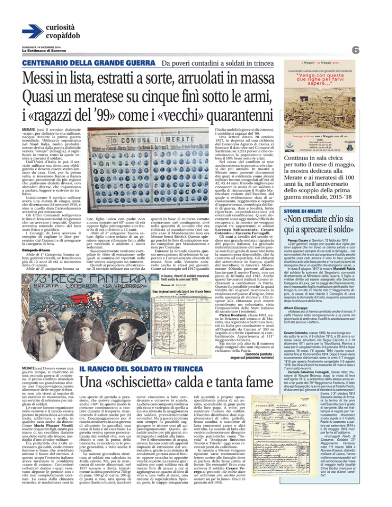 curiosità cvopàfdob 6 DOMENICA 14 DICEMBRE 2014 La Settimana di Saronno CENTENARIO DELLA GRANDE GUERRA Da poveri contadini a soldati in trincea Messi in lista, estratti a sorte, arruolati in massa Quasi un meratese su cinque finì sotto le armi, i «ragazzi del ’99» come i «vecchi» quarantenni MERATE (ces) Il termine dialettale «naja», per definire la vita militare, nacque durante la prima guerra mondiale. Utilizzato soprattutto nel Nord Italia, molto probabilmente deriva dalla parola dialettale veneta “tenaja” (tenaglia), a significare la morsa entro la quale veniva a trovarsi il soldato. Dall’Unità d’Italia in poi, il servizio militare era diventato obbligatorio e doveva essere svolto lontano da casa. Così, per la prima volta, si trovarono fianco a fianco giovani provenienti da più regioni che parlavano dialetti diversi, con abitudini diverse, che imparavano a parlare, leggere e scrivere in italiano. Inizialmente il servizio militare aveva una durata di cinque anni, che diventarono 24 mesi nel 1910, e sino a quella data l’arruolamento avveniva per estrazione. Gli Uffici Comunali redigevano le liste di leva con i nomi dei giovani che ne avevano i requisiti. Questo avveniva tenendo conto del loro stato fisico e giuridico. I Consigli di Leva avevano il compito di vagliare le liste presentate dai Comuni e di assegnare la categoria di leva. Categoria di Leva Abile di 1° Categoria: buona salute, genitori viventi, un fratello con più di 12 anni di età al momento della chiamata. Abile di 2° categoria: buona sa- lute, figlio unico con padre non ancora entrato nel 65° anno di età oppure figlio primogenito con fratello di età inferiore a 12 anni. Abile di 3° categoria: buona salute, figlio unico orfano di un genitore oppure riformato fatto abile per necessità e addetto a lavori sedentari. Successivamente venivano compilate le «liste di estrazione» nelle quali ai nominativi riportati nelle liste veniva assegnato un numero. Quindi si procedeva all’estrazione. Il servizio militare era svolto da quanti in base al numero estratto rientravano nel contingente, cioè nella quantità di uomini che era richiesta al mandamento (nel nostro caso il Mandamento non era Merate bensì Brivio). Questo spiega perché le liste di estrazione erano compilate per Mandamento e non per Comune. Durante la Grande Guerra questo meccanismo di selezione fu superato e l’arruolamento diventò di massa. Non solo. Vennero coinvolte anche le classi più giovani. Come ad esempio nel 1917 quando In basso, ritratti di soldati meratesi finiti sotto le armi nel 1915 l’Italia mobilitò giovani diciottenni, i cosiddetti ragazzi del ’99. Una lettera datata 28 ottobre 1917, in risposta ad una richiesta del Consorzio Agrario di Como, ci fornisce il dato che nel Comune di Sartirana, su 1.213 persone che costituiscono la popolazione totale, ben il 19% fosse sotto le armi. Nel corso del conflitto si rese anche necessario precettare le classi dei più anziani. In mostra a Merate sono presenti documenti dai quali si evidenzia come alcuni militari furono congedati all’età di 42, 43, 44 anni. Il modo migliore per conoscere la storia di un soldato è quella di rintracciare il Foglio Matricolare redatto dall’Esercito, dal quale si evidenziano: data di arruolamento, reggimento e reparto d’appartenenza, cronologia dei fatti di guerra, date e località, ferite riportate, ospedalizzazioni ed eventuali onorificenze. Questi documenti sono oggi molto difficili da recuperare, in mostra ne vengono esposti tre appartenuti ai soldati Lorenzo Sottocornola, Cesare Colombo e Zaccaria Fumagalli. Gli anni a cavallo del secolo videro una grande ondata migratoria del popolo italiano. La graduale industrializzazione del nostro paese non fu in grado di assorbire tutta la manodopera disponibile, che fu costretta ad espatriare. Gli abitanti del settentrione in Europa, quelli del meridione in America. Mediamente 600mila persone all’anno lasciavano il nostro Paese, con un picco di 873mila nel 1913. Anche questi lavoratori italiani furono richiamati a combattere in Patria. Questo fu possibile perché la quasi totalità dei migranti manteneva la residenza nel paese d’origine, forse nella speranza di ritornare. Chi rispose alla chiamata può essere considerato un volontario, vista l’impossibilità dello Stato italiano di sanzionare i renitenti. Pietro Bonfanti, classe 1891, nato in Svizzera nel comune di Muralto, ma registrato a Sartirana rientrò in Italia per combattere e morì all’Ospedale da Campo n° 203 in seguito alle ferite riportate in combattimento. Apparteneva al 111° Reggimento Fanteria. Ma molto più alto fu il numero degli emigrati che non risposero al richiamo della Patria. (seconda puntata segue sul prossimo numero) MERATE (ces) Doveva essere una guerra lampo, si trasformò in una ostinata guerra di posizione. Il primo conflitto mondiale comportò un grandissimo sforzo per l’approvvigionamento alimentare delle truppe al fronte: non più viveri al seguito di un esercito in movimento, ma un servizio di refezione per migliaia di soldati. Le cucine furono organizzate nelle retrovie e il rancio veniva portato in prima linea a dorso di mulo, addirittura a spalla, in qualche caso anche da donne. Come Maria Plozner Mentil, madre di quattro figli, morta per mano di un cecchino durante una delle salite alle trincee, medaglia d’oro al valor militare. Era preferibile che i cibi arrivassero già caldi, onde evitare fiamme e fumo che avrebbero attirato il fuoco del nemico. A questo scopo l’esercito italiano aveva inventato le cosiddette «casse di cottura». Contenitori coibentati dentro i quali venivano deposte le pentole con i cibi non completamente cucinati. La cassa dalla chiusura ermetica si trasformava così in IL RANCIO DEL SOLDATO IN TRINCEA Una «schiscietta» calda e tanta fame una specie di pentola a pressione, che poteva raggiungere anche i 60°. In questo modo le pietanze continuavano a cuocere dura