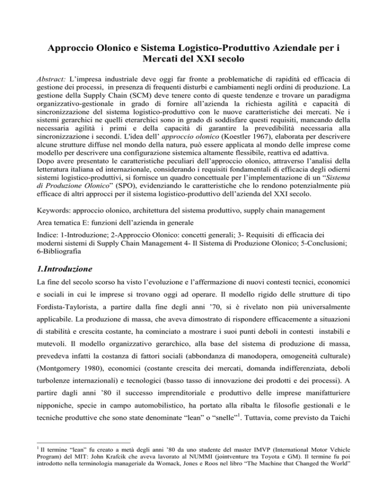 Approccio Olonico e Sistema Logistico Produttivo Aziendale per i Mercati del XXI secolo Abstract: L’impresa industriale deve oggi far fronte a problematiche di rapidità ed efficacia di gestione dei processi, in presenza di frequenti disturbi e cambiamenti negli ordini di produzione. La gestione della Supply Chain (SCM) deve tenere conto di queste tendenze e trovare un paradigma organizzativo"gestionale in grado di fornire all’azienda la richiesta agilità e capacità di sincronizzazione del sistema logistico"produttivo con le nuove caratteristiche dei mercati. Ne i sistemi gerarchici ne quelli eterarchici sono in grado di soddisfare questi requisiti, mancando della necessaria agilità i primi e della capacità di garantire la prevedibilità necessaria alla sincronizzazione i secondi. L'idea dell’ approccio olonico (Koestler 1967), elaborata per descrivere alcune strutture diffuse nel mondo della natura, può essere applicata al mondo delle imprese come modello per descrivere una configurazione sistemica altamente flessibile, reattiva ed adattiva. Dopo avere presentato le caratteristiche peculiari dell’approccio olonico, attraverso l’analisi della letteratura italiana ed internazionale, considerando i requisiti fondamentali di efficacia degli odierni sistemi logistico"produttivi, si fornisce un quadro concettuale per l’implementazione di un “Sistema di Produzione Olonico” (SPO), evidenziando le caratteristiche che lo rendono potenzialmente più efficace di altri approcci per il sistema logistico"produttivo dell’azienda del XXI secolo. Keywords: approccio olonico, architettura del sistema produttivo, supply chain management Area tematica E: funzioni dell’azienda in generale Indice: 1"Introduzione; 2"Approccio Olonico: concetti generali; 3" Requisiti di efficacia dei moderni sistemi di Supply Chain Management 4" Il Sistema di Produzione Olonico; 5"Conclusioni; 6"Bibliografia La fine del secolo scorso ha visto l’evoluzione e l’affermazione di nuovi contesti tecnici, economici e sociali in cui le imprese si trovano oggi ad operare. Il modello rigido delle strutture di tipo Fordista"Taylorista, a partire dalla fine degli anni ’70, si è rivelato non più universalmente applicabile. La produzione di massa, che aveva dimostrato di rispondere efficacemente a situazioni di stabilità e crescita costante, ha cominciato a mostrare i suoi punti deboli in contesti instabili e mutevoli. Il modello organizzativo gerarchico, alla base del sistema di produzione di massa, prevedeva infatti la costanza di fattori sociali (abbondanza di manodopera, omogeneità culturale) (Montgomery 1980), economici (costante crescita dei mercati, domanda indifferenziata, deboli turbolenze internazionali) e tecnologici (basso tasso di innovazione dei prodotti e dei processi). A partire dagli anni ’80 il successo imprenditoriale e produttivo delle imprese manifatturiere nipponiche, specie in campo automobilistico, ha portato alla ribalta le filosofie gestionali e le tecniche produttive che sono state denominate “lean” o “snelle”1. Tuttavia, come previsto da Taichi 1 Il termine “lean” fu creato a metà degli anni ’80 da uno studente del master IMVP (International Motor Vehicle Program) del MIT: John Krafcik che aveva lavorato al NUMMI (jointventure tra Toyota e GM). Il termine fu poi introdotto nella terminologia manageriale da Womack, Jones e Roos nel libro “The Machine that Changed the World” Ohno, creatore del Just In Time della Toyota, l’approccio snello si è rivelato difficilmente implementabile al di fuori dell’arcipelago Giapponese (Monden 1998), e comunque non sufficiente ad affrontare le sfide dell’arena competitiva del XXI secolo. La diffusione di Internet ,a partire dagli anni ’90, ha reso possibile l’utilizzo, da parte delle imprese, di una infrastruttura informativa planetaria a basso costo, che sta tutt’oggi favorendo radicali cambiamenti nel mercato. Questi cambiamenti, insieme alle trasformazioni di natura sociale che hanno contraddistinto la fine del secolo scorso, hanno portato agli attuali livelli di complessità dell’ambiente socio"economico, dunque dei mercati e delle catene di fornitura. L’aumento della complessità si identifica infatti con l’aumento della varietà, della mutevolezza e della non prevedibilità dei fenomeni che caratterizzano l’ambiente in cui opera l’impresa. Le direttrici di crescita della complessità sono raggruppabili in tre categorie: economica, tecnica e socio"psicologica (Merli e Saccani 1994). Della prima categoria fanno parte i fattori di cambiamento nell’ambito delle relazioni che coinvolgono gli attori economici come l’ampliamento della dimensione del business, i bassi tassi di crescita economica, gli elevati tassi di inflazione, la terziarizzazione e l’eterogeneità della domanda. Alla direttrice tecnica si riconducono le traiettorie di sviluppo tecnologico che generano complessità attraverso la rapida obsolescenza delle strutture hardware e software ed alla richiesta di tecnologie flessibili. La complessità socio"psicologica, infine, incide sulla sfera dei comportamenti sociali dell’individuo, ed in particolare, sui comportamenti del consumatore, che si evolve divenendo più esigente, più informato e più disponibile a fornire indicazioni per ottenere il prodotto che desidera e che deve essere fortemente differenziato. In questo scenario le modalità di previsione tradizionali sono rese inefficaci dal moltiplicarsi dei prodotti necessario a seguire le esigenze di mercati maturi e di consumatori il cui ruolo si è evoluto da “consumer” a “prosumer2”. La produzione di massa non permetteva la personalizzazione del prodotto ma offriva grandi volumi di beni standardizzati. Le mutate esigenze spingono oggi invece verso la produzione di beni personalizzati in grandi quantità; per soddisfare queste esigenze è necessario dotarsi di una struttura logistico"produttiva estremamente flessibile. Le 