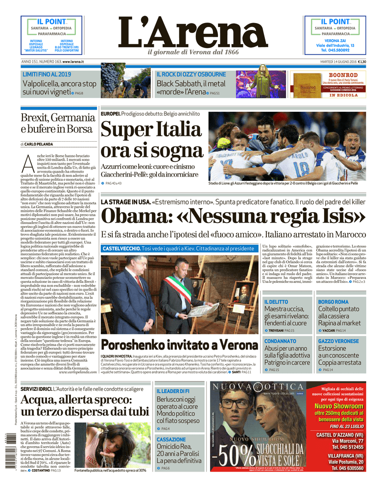 IL POINT IL POINT S.R.L. SANITARIA S.R.L. ORTOPEDIA SANITARIA PARAFARMACIA INTERNO OSPEDALE LEGNAGO “MATER SALUTIS” PARAFARMACIA VERONA ZAI Viale dell’Industria, 13 Tel. 045.580892 INTERNO OSPEDALE B.GO TRENTO (VR) POLO CONFORTINI ANNO 151. NUMERO 163. www.larena.it MARTEDÌ 14 GIUGNO 2016 ¤ 1,30 LIMITIFINOAL2019 ILROCKDIOZZYOSBOURNE Valpolicella,ancorastop suinuovivigneti•> BlackSabbath,ilmetal «morde»l’Arena•> PAG8 di CARLO PELANDA nche ieri le Borse hanno bruciato oltre 130 miliardi. I mercati sono inquieti non tanto per l’eventuale uscita di Londra dalla Ue, di fatto già avvenuta quando ha ottenuto qualche mese fa la facoltà di non aderire al progetto di unione politica e monetaria, cioè al Trattato di Maastricht, ma perché non è chiaro come e se il mercato inglese verrà ri-associato a quello europeo continentale. Questo è il punto fondamentale che riguarda anche l’ipotesi di altre defezioni da parte di 7 delle 10 nazioni “non euro” che non vogliono adottare la moneta unica. La Germania, attraverso le parole del ministro delle Finanze Schauble che Merkel per motivi diplomatici non può usare, ha preso una posizione punitiva nei confronti di Londra per dissuadere l’uscita di altre nazioni dall’Ue: non sperino gli inglesi di ottenere un nuovo trattato di associazione economica, o dentro o fuori. Io trovo sbagliata tale posizione. Evidentemente il progetto unionista non riesce a essere un modello federatore per tutti gli europei. Una logica politica razionale suggerirebbe di prenderne atto e di cercare un altro meccanismo federatore più realistico. Che è semplice: chi non vuole partecipare all’Ue può uscirne e subito riassociarsi con un trattato di libero scambio, rafforzato dall’adesione a standard comuni, che replichi le condizioni attuali di partecipazione al mercato unico. Se il mercato finanziario potesse scommettere su questa soluzione in caso di vittoria della Brexit improbabile ma non escludibile - non vedrebbe grandi rischi né nel caso specifico né in quello di altre uscite da parte di nazioni non euro. L’exit di nazioni euro sarebbe destabilizzante, ma la riorganizzazione più flessibile della relazione tra Eurozona e nazioni che non vogliono aderire al progetto unionista, anche perché le regole depressive Ue ne soffocano la crescita, salverebbe il mercato integrato europeo. Il negare tale soluzione da parte della Germania è un atto irresponsabile e ne svela la paura di perdere il dominio sul sistema e il conseguente vantaggio da signoraggio (geo)economico. Per questo la questione inglese è in realtà un ritorno della secolare “questione tedesca” in Europa. Come risolverla prima che ci porti nuovamente alla tragedia? Elaborando un nuovo principio federatore per gli europei: tutti devono trovare un modo comodo e vantaggioso per stare insieme. Ciò implica una nuova Comunità europea che ammette diversi livelli di associazione e senza diktat della Germania. www.carlopelanda.com Poste Italiane S.p.A. - Sped. in a.p. - D.L. 353/2003 (conv. in L. 27/02/2004 n. 46) art. 1, comma 1, DCB Verona y(7HB5J1*LQRKKR( +.!z!.!=!& PAG51 EUROPEI. Prodigiosodebutto: Belgioannichilito SuperItalia ora si sogna Azzurricomeleoni:cuoreecinismo Giaccherini-Pellè:goldaincorniciare • > PAG40a 43 LA STRAGE IN USA. «Estremismo interno». Spunta predicatore fanatico. Il ruolo del padre del killer Obama: «Nessuna regia Isis» E si fa strada anche l’ipotesi del «fuoco amico». Italiano arrestato in Marocco CASTELVECCHIO. Tosi vede i quadri a Kiev. Cittadinanza al presidente PoroshenkoinvitatoaVerona IQUADRI IN MOSTRA.Inaugurata ieriaKiev, alla presenzadel presidenteucraino PetroPoroshenko, del sindaco diVeronaFlavio Tosi e dell’ambasciatore italianoFabrizio Romano,lamostra conle17 telerapinate a Castelvecchio,recuperate inUcraina e oraespostealmuseo Khanenko.Tosi haconferito,«per riconoscenza»,la cittadinanzaonoraria veronesea Poroshenko, invitandoload un’opera inArena. Rientrodei quadri previsto in «qualchesettimana».Quattro opere andranno aRomaper unamostra voluta daicarabinieri. > SANTI PAG11 • • > PAG4 CASSAZIONE OmicidioRea, 20anniaParolisi Lapenadefinitiva Fontanellapubblica; nell’acquedotto sprecoal30% • > PAG6 • BORGOROMA Maestrauccisa, gliesamirivelano: fendentialcuore Coltellopuntato allacassiera Rapinaalmarket • > VACCARI PAG14 CONDANNATO GAZZOVERONESE Abusiperunanno sullafigliaadottiva Patrignoincarcere Estorsione aunconoscente Coppiaarrestata • > PAG15 • > PAG14 Migliaia di occhiali delle nuove collezioni scontatissimi per ogni tipo di esigenza ILLEADERDI FI Berlusconioggi operatoalcuore Mondopolitico colfiatosospeso grazione e terrorismo. Lo stesso Obama accredita l’ipotesi di un lupo solitario: «Non ci sono prove che il killer sia stato guidato da estremisti dall’estero». Si fa strada che alcune delle vittime siano state uccise dal «fuoco amico». Un italiano invece arrestato in Marocco: «Preparava un attacco dell’Isis». > PAG2 e3 ILDELITTO > TREVISANI PAG15 Acqua,allertaspreco: unterzodispersadaitubi • Un lupo solitario «omofobo», radicalizzatosi in America con un giuramento di fedeltà all’Isis «last minute». Dopo la strage nel gay club di Orlando si cerca di capire chi è Omar Mateen, spunta un predicatore fanatico e si indaga sul ruolo del padre. Il massacro ha riaperto negli Usa le polemiche su armi, immi- • SERVIZIIDRICI. L’Autorità elefallenelle condottescaligere A Verona un terzo dell’acqua potabile si perde attraverso falle, buchi e crepe delle condotte, prima ancora di raggiungere i rubinetti. Il dato arriva dall’Autorità d’ambito territoriale (Aato) che governa il servizio idrico integrato nei 97 Comuni. A Roma invece vanno persi circa due terzi della risorsa, in alcune località del Sud il 70%. «E riparare le condotte talvolta non conviene». > COSTANTINO PAG13 Stadiodi Lione:gli Azzurri festeggiano dopolavittoriaper 2-0controilBelgio coni gol di Giaccherinie Pellè N