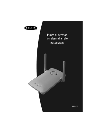 Punto di accesso wireless alla rete Manuale utente F5D6130 Indice Indice . . . . . . . . . . . . . . . . . . . . . . . . . . . . . . . . . . . . . . . . . . . . . . . . . . . . . .1–2 Specifiche del prodotto . . . . . . . . . . . . . . . . . . . . . . . . . . . . . . . . . . . . . . . . . . .3 Conoscere il vostro punto di accesso wireless Belkin . . . . . . . . . . . . . . . . . . . .4–5 Impostazione rapida . . . . . . . . . . . . . . . . . . . . . . . . . . . . . . . . . . . . . . . . . . .6–7 Installazione . . . . . . . . . . . . . . . . . . . . . . . . . . . . . . . . . . . . . . . . . . . . . . . .8–10 Installazione del software per il programma di gestione del punto di accesso wireless . . . . . . . . . . . . . . . . . . . . . . . . . . . .11–12 Utilizzo del programma di gestione del punto di accesso wireless . . . . . . . .13–21 Realizzazione di una rete wireless utilizzando 802.11b . . . . . . . . . . . . . . . .22–25 Glossario dei termini delle reti wireless . . . . . . . . . . . . . . . . . . . . . . . . . . . .26–27 Glossario dei termini delle reti wired . . . . . . . . . . . . . . . . . . . . . . . . . . . . .28–29 Rilevazione e risoluzione delle anomalie . . . . . . . . . . . . . . . . . . . . . . . . . . . . .30 Note . . . . . . . . . . . . . . . . . . . . . . . . . . . . . . . . . . . . . . . . . . . . . . . . . . . . . . . .31 Informazioni . . . . . . . . . . . . . . . . . . . . . . . . . . . . . . . . . . . . . . . . . . . . . . . . . .32 Introduzione Vi ringraziamo per aver acquistato il WAP, il punto di accesso wireless (WAP) da 11Mbps e vi diamo il benvenuto nel mondo delle reti wireless. Ora potrete trarre il massimo vantaggio da questa fantastica tecnologia e ottenere la libertà di cui avete bisogno a casa e in ufficio senza dover ricorrere all’impiego di cavi. Il WAP agisce come ponte tra la rete wired esistente e i vostri computer wireless. Grazie alla semplicità di installazione e di impostazione, potrete realizzare una rete wireless in pochi minuti. Accertatevi di aver letto attentamente questo manuale, solo così potrete trarre il massimo vantaggio dal vostro WAP. Principali caratteristiche Ampia area di copertura ad alte velocità Il WAP Belkin garantisce una copertura con un raggio di 10 m in uno spazio chiuso e 600 m in uno spazio aperto. Criptazione di sicurezza fino a 128 bit Il WAP Belkin è in grado di criptare (confondere) le onde radio trasmesse garantendo in questo modo la protezione dei vostri dati. Questa caratteristica optional vi consente di criptare i vostri dati a 64 o 128 bit utilizzando una chiave che provvederete ad inserire direttamente voi. Filtro con indirizzi MAC Per aumentare la sicurezza, potete elaborare un elenco di indirizzi MAC (identificatori unici del client) ai quali consentire l’accesso alla vostra rete wireless. Ogni computer dotato di un adattatore per reti wireless ha il proprio indirizzo MAC. E’ sufficiente che riportiate questi indirizzi MAC in un elenco utilizzando il software di gestione rete wireless 802.11b Belkin e l’accesso alla vostra rete attraverso il WAP sarà limitato soltanto agli indirizzi MAC da voi indicati. 1 Introduzione Applicazioni • Roaming wireless con un portatile in casa o in ufficio Per darvi la libertà di muovervi in casa o in ufficio senza l’ingombro dei cavi. • Ambienti dove il cablaggio è difficile Da utilizzare negli edifici dotati di muri solidi e finiti o in spazi aperti dove è difficile posare i cavi. • Frequenti cambiamenti di ambiente Uffici o in ambienti che modificano o cambiano di frequente la disposizione delle postazioni di lavoro. • LAN provvisorie per progetti speciali o per picchi di lavoro momentanei Fiere, esposizioni o cantieri edili, dove le reti sono necessarie soltanto provvisoriamente. Aziende che hanno bisogno di incrementare il numero delle proprie postazioni di lavoro per un periodo limitato. • SOHO (Small Office/Home Office) Utenti SOHO che richiedono un’impostazione semplice e rapida. Il pacchetto contiene • Punto di accesso wireless alla rete Belkin • Alimentatore di corrente • Software di gestione wireless 802.11b Belkin • Manuale utente Requisiti del sistema • Almeno un computer dotato di un adattatore Ethernet wireless 802.11b conforme • Protocollo di rete TCP/IP installato su ogni computer 2 Specifiche del prodotto Specifiche Standard wireless: 802.11b Tecnologia radio: Direct Sequence Spread Spectrum (DSSS) Canali operativi: Conformi alla norma IEEE 802.11 11 canali (USA, Canada) 13 canali (ETSI) 14 canali (Giappone) Velocità dati: 11, 5,5, 2, 1Mbps per canale (Rollback automatico) Raggio d’azione tipico in un ambiente chiuso: 180 300 450 550 m m m m a a a a 11Mbps 5,5Mbps 2Mbps 1Mbps Standard di rete: IEEE 802.3 10BaseT Indicatore LED: Collegamento, attività, alimentazione Banda di frequenza: Banda ISM, 2400 ~ 2483.5MHz Tipo di modulazione: QPSK, BPSK, CCK Velocità dati: 1 / 2 / 5,5 / 11Mbps per canale Protocollo: CSMA/CA (Collision Avoidance –anticollisione) con ACK Potenza erogata: 13dBm ~ 20dBm (50 mW) (max.) Sensibilità di ricezione: Min. –78 dBm per 11Mbps @ BER 10E-5; Min. –82 dBm per 5,5/2/1Mbps @ BER 10E-5 Criptazione: 64/128-bit WEP (Wired Equivalent Privacy) Tipo di antenna: 2dBi (max.) @ antenna esterna patch PCB Potenza assorbita: 5V, 750mA max. Dimensioni: 114,5 x 54 x 5,0mm Peso: 50 g Supporto OS: Windows® 95 (OSR2), 98, 2000, NT, Me Certificazione: FCC Classe B, marchio CE, C-Tick 3 Conoscere il vostro punto di accesso wireless Belkin LED collegamento Ethernet /Attività LED trasmissione/ricezione LED alimentazione LED alimentazione Indica che il WAP riceve corrente LED trasmissione/ricezione Verde lampeggiante: indica che la trasmissione dei dati è in corso Ambra lampeggiante: indica che la ricezione dei dati è in corso LED collegamento Ethernet /Attività Verde fissa: indica che il collegamento via cavo ad Ethernet (wired) è valido Arancione lampeggiante: indica l’attività 