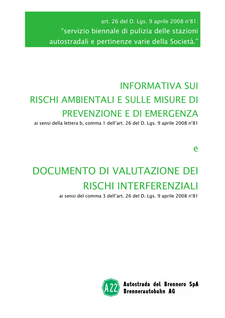 art. 26 del D. Lgs. 9 aprile 2008 n°81: “servizio biennale di pulizia delle stazioni autostradali e pertinenze varie della Società.” INFORMATIVA SUI RISCHI AMBIENTALI E SULLE MISURE DI PREVENZIONE E DI EMERGENZA ai sensi della lettera b, comma 1 dell’art. 26 del D. Lgs. 9 aprile 2008 n°81 e DOCUMENTO DI VALUTAZIONE DEI RISCHI INTERFERENZIALI ai sensi del comma 3 dell’art. 26 del D. Lgs. 9 aprile 2008 n°81 INDICE 1. Anagrafica del contratto 3 2. Informazioni sui rischi ambientali 9 3. Informazioni sui rischi interferenziali 21 3.1 Rischi interferenziali dovuti alla presenza di lavoratori dipendenti di Autostrada del Brennero che intervengono direttamente nell’appalto. .................................... 24 3.2 Rischi interferenziali dovuti alla presenza di lavoratori dipendenti di Autostrada del Brennero che intervengono nei luoghi dell’appalto nell’ambito delle proprie mansioni. ............................................................................................................. 25 3.3 Rischi interferenziali dovuti alla presenza di lavoratori dipendenti di strutture date in gestione a terzi, nelle immediate vicinanze dei luoghi oggetto dell’appalto che possono subire i rischi immessi nel luogo di lavoro dalle lavorazioni dell’appaltatore................................................................................... 28 3.4 Informazioni specifiche sui rischi interferenziali dovuti alla presenza di sovrapposizioni di più attività svolte ad opera di operatori diversi......................... 30 4. Prescrizioni particolari 33 5. Procedure autorizzative minime 36 6. Aggiornamenti del documento 37 7. Elenco degli allegati 37 Modulo art. 26 comma 3-ter D. Lgs. 81/2008 - Rischi e misure di sicurezza da adottare da parte dell’operatore economico affidatario. Integrazione a cura dei datori di lavoro di: 1. Fabbricato pulifunzionale Plessi Museum – Brennero, 2. Polizia Stradale di Vipiteno, 3. Area Sadobre – Vipiteno, 4. Ufficio Informazioni Turistiche di Bressanone, 5. Parcheggio Mezzi pesanti Trento Interporto, 6. Polizia Stradale e COA – Trento presso cui si svolge parte dell’appalto. 38 NOTA: Il presente documento è redatto ai sensi dell’art. 26 commi 1, lettera b, e 3 del D. Lgs. 9 aprile 2008 n°81. Pertanto esso non riguarda alcuna singola attività che abbia natura di lavoro edile o ingegneria civile, come definiti dall’Allegato X del D. Lgs. 81/08, o l’eventuale svolgimento di attività all’interno di cantieri. In questi casi bisognerà mettere in atto le procedure previste dal Titolo IV dello stesso decreto e/o le procedure di promozione della cooperazione e coordinamento e di aggiornamento del DUVRI previste. INFORMATIVA SUI RISCHI AMBIENTALI E SULLE MISURE DI PREVENZIONE E DI EMERGENZA E DOCUMENTO DI VALUTAZIONE DEI RISCHI INTERFERENZIALI Servizio biennale di pulizia delle stazioni autostradali e pertinenze varie della Società rev. 0 del 15.07.2014 pag. 2 di 38 1. Anagrafica del contratto Oggetto del contratto OGGETTO DEL CONTRATTO DESCRIZIONE SINTETICA DELLE ATTIVITA’ PREVISTE Servizio biennale di pulizia delle stazioni autostradali e pertinenze varie della Società Sono previste attività di pulizia “ordinaria” a cadenza giornaliera, settimanale, quindicinale e mensile, da svolgersi sulla base di orari minimi prestabiliti dalla Società e riguardanti principalmente strutture adibite ad uffici, laboratori, stazioni autostradali e servizi igienici pubblici; nonché altre attività di pulizia “periodica” a cadenza semestrale ed annuale, determinate invece da orari minimi offerti in sede di gara dall’Impresa e relative a lavorazioni straordinarie più specifiche delle sopraccitate strutture, dei locali tecnologici di controllo e delle cabine di esazione. Rientrano nel servizio anche altre pulizie periodiche di superfici vetrate ed allumini delle stazioni autostradali, dei C.S.A., della Sede di Trento, del palazzo C.A.U./C.O.A. e del fabbricato polifunzionale “Plessi Museum”, regolate diversamente, sulla base di costi a metro quadrato offerti dall’Impresa in sede di gara. Le attività di pulizia possono comprendere anche lavorazioni che dovranno essere eseguite in orari notturni (22.00 - 06.00), come a titolo esemplificativo ma non esaustivo, la pulizia annuale delle pensiline di stazione o quella interna specifica delle cabine di esazione. E’ previsto inoltre un servizio di igienizzazione dei sanitari dei servizi igienici e di profumazione dei relativi ambienti di tutte le strutture oggetto d’appalto, mediante un sistema di ricarica periodica che ne consenta il corretto e continuo funzionamento ed un servizio di noleggio e sostituzione periodica di tappeti antipolvere presso gli ingressi dei caseggiati di stazione, dei C.S.A. e di tutte le altre strutture adibite ad ufficio. Per i maggiori dettagli dell’attività prevista dall’appalto si rimanda al Capitolato Speciale d’Appalto. Sede di Trento Palazzina Uffici – piano terra e piano primo scala B e ampliamento ala OVEST (scala C). Centro Direzionale Interporto Trento Uffici piano terra e piano 4°, LUOGHI DI ESECUZIONE DEL CONTRATTO Interporto Trento Uffici e laboratori dei magazzini 15 e 17 Palazzo CAU COA Stazioni Autostradali di: Vipiteno, Bressanone, Bressanone Z.I., Chiusa, Bolzano nord, Bolzano sud, Egna – Ora, S. Michele, Trento Nord, Trento Centro, Trento Sud, Rovereto Nord, Rovereto Sud, Ala – Avio, Affi, Verona Nord, Nogarole Rocca, Mantova Nord, Mantova Sud, Pegognaga, Reggiolo Rolo, Carpi, Campogalliano, INFORMATIVA SUI RISCHI AMBIENTALI E SULLE MISURE DI PREVENZIONE E DI EMERGENZA E DOCUMENTO DI VALUTAZIONE DEI RISCHI INTERFERENZIALI Servizio biennale di pulizia delle stazioni autostradali e pertinenze varie della Società rev. 0 del 15.07.2014 pag. 3 di 38 Uffici, laboratori e magazzini del Servizio Automazione Manutenzione Impianti Esazione presso la stazione autostradale di Trento Nord. Centro servizi per la Sicurezza Autostradale di: 