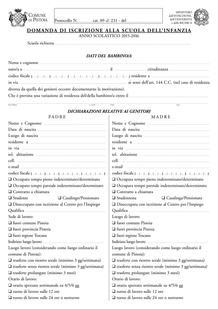 COMUNE DI PISTOIA Protocollo N. ………………… cat. 09 cl. 231 - del ……………………………………………… MINISTERO dell’ISTRUZIONE, dell’UNIVERSITÀ e della RICERCA D O M A N D A D I I S C R I Z I O N E A L L A S C U O L A D E L L’ I N FA N Z I A ANNO SCOLASTICO 2015-2016 Scuola richiesta …………………………………………………………………………………………………………………………………………………………………………………………………… DATI DEL BAMBINO/A Nome e cognome ……………………………………………………………………………………………………………………………………………………………………………………………………………………………………………………… nato/a a …………………………………………………………………………………………………………………………… il ……………………………………………… cittadinanza ………………………………………………………… codice fiscale |………|………|………|………|………|………|………|………|………|………|………|………|………|………|………|………| residente a …………………………………………………………………………………… in via …………………………………………………………………………………………………………………………………………………………… ai sensi dell’art. 144 C.C. (nel caso di residenza diversa da quella dei genitori occorre documentarne la motivazione). Che è prevista una variazione di residenza del/della bambino/a entro il ………………………………………………………………………………………………………………… ………………………………………………………………………………………………………………………………………………………………………………………………………………………………………………………………………………………………… n. civico Città Cap Via o Piazza DICHIARAZIONI RELATIVE AI GENITORI PADRE MADRE Nome e Cognome ………………………………………………………………………………………… Data di nascita ………………………………………………………………………………………………… Luogo di nascita ……………………………………………………………………………………………… residente a …………………………………………………………………………………………………………… in via ………………………………………………………………………………………………………………………… tel. abitazione …………………………………………………………………………………………………… cell. ……………………………………………………………………………………………………………………………… e-mail ………………………………………………………………………………………………………………………… codice fiscale |……|……|……|……|……|……|……|……|……|……|……|……|……|……|……|……| ❑ Occupato tempo pieno indeterminato/determinato ❑ Occupato tempo parziale indeterminato/determinato ❑ Contratto a chiamata ❑ Studente ❑ Casalingo/Pensionato ❑ Disoccupato con iscrizione al Centro per l’Impiego Qualifica …………………………………………………………………………………………………………………… Sede di lavoro: ❑ fuori comune Pistoia ❑ fuori provincia Pistoia ❑ fuori regione Toscana Indirizzo luogo lavoro ………………………………………………………………………………………… Luogo lavoro (considerando come luogo ordinario il comune di Pistoia): ❑ trasferte con rientro serale (minimo 3 gg/settimana) ❑ trasferte senza rientro serale (minimo 3 gg/settimana) ❑ trasferte prolungate (minimo 3 mesi) Orario di lavoro: ❑ orario spezzato settimanale su 4/5/6 gg ❑ turno di lavoro sulle 12 ore ❑ turno di lavoro sulle 24 ore o notturno Nome e Cognome ………………………………………………………………………………………… Data di nascita ………………………………………………………………………………………………… Luogo di nascita ……………………………………………………………………………………………… residente a …………………………………………………………………………………………………………… in via ………………………………………………………………………………………………………………………… tel. abitazione …………………………………………………………………………………………………… cell. ……………………………………………………………………………………………………………………………… e-mail ………………………………………………………………………………………………………………………… codice fiscale |……|……|……|……|……|……|……|……|……|……|……|……|……|……|……|……| ❑ Occupata tempo pieno indeterminato/determinato ❑ Occupata tempo parziale indeterminato/determinato ❑ Contratto a chiamata ❑ Studentessa ❑ Casalinga/Pensionata ❑ Disoccupata con iscrizione al Centro per l’Impiego Qualifica …………………………