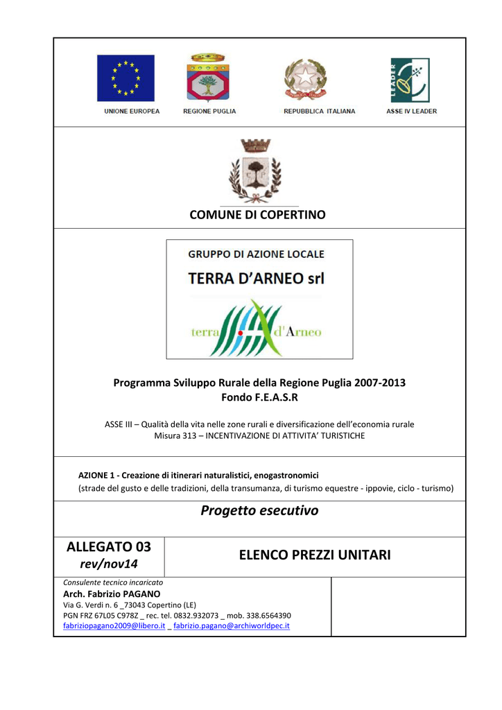 COMUNE DI COPERTINO Programma Sviluppo Rurale della Regione Puglia 2007-2013 Fondo F.E.A.S.R ASSE III – Qualità della vita nelle zone rurali e diversificazione dell’economia rurale Misura 313 – INCENTIVAZIONE DI ATTIVITA’ TURISTICHE AZIONE 1 - Creazione di itinerari naturalistici, enogastronomici (strade del gusto e delle tradizioni, della transumanza, di turismo equestre - ippovie, ciclo - turismo) Progetto esecutivo ALLEGATO 03 rev/nov14 ELENCO PREZZI UNITARI Consulente tecnico incaricato Arch. Fabrizio PAGANO Via G. Verdi n. 6 _73043 Copertino (LE) PGN FRZ 67L05 C978Z _ rec. tel. 0832.932073 _ mob. 338.6564390 [email protected] _ [email protected] pag. 2 Num.Ord. TARIFFA D E S C R I Z I O N E D E L L' A R T I C O L O Nr. 1 fornitura di dispositivo smartfhone con sistema operativo Android Samsung Galaxy Note II display 5,5" Attr.elettroni fotocamera 8Mpxl - GPS- Bluetooth - s pen che euro (duecentoottantatre/11) unità di misura PREZZO UNITARIO cadauno 283,11 postazione vdt completa di pc e stampante; PC: MS WINDOWS 7 PROFESSIONAL 64BIT MONITOR LG 21,5"LED FULL HD16:9/250NIT/1920X1080 CASE MIDI ATX CON ALIMENTATORE CPU INTEL I5-3470 3,2GH SKT1155 H2 QUADCORE 6MB CACHE 5GT/S QPI MB MSI B75MA-P45 SKT 1155 4DDR3 VGAUSB3 GBLAN DVI M/ATX RAM 8GB KINGSTON HD 3,5 500GB SATA WESTERN DIGITAL MASTERIZZATORE LG DVD-RW BLACK SATA24X VGA MSI ATI R5450 1GB TASTIERA + MOUSEpc_MS Windows _MICROSOFT OFFICE 2010 Professional _singola licenza _ product key STAMPANTE MF LAS COLORI SAM CLX-4195FN MULTIF LAS COL MULTIFUNZIONE LASER COLORE FAX COPIA SCAN STAMPA 18PPM COL 18PP M B/N ADF 50FF USB ETHERNET euro (milleduecentosettantauno/07) cadauno 1´271,07 fornitura di Sedia Igloo H87 Trasparente,con braccioli, impilabile con Struttura in Policarbonato, Per Uso Interno ed Esterno, ughifuga Misure: H 87 cm Hs 47 cm L 57 cm P 54 cm Colori: Trasparente euro (settantasei/00) cadauno 76,00 cadauno 63,00 cadauno 119,90 Nr. 6 postazione front-office con scrivania 160x90 struttura sp. 4mm noce canaletto, dattilo 100x60, cassettiera Attr._postaz. 51,5x56x57, mobile contenitore 180x45x84 con ante, mobile contenitore, poltrone mod. direzionale oper. schienale basso, 2 poltroncine mod. gogò in polipropilene euro (milleduecentoottantacinque/00) cadauno 1´285,00 Nr. 7 fornitura di rastrelliera per biciclette 6 posti tipo Klettler con struttura interamente in acciaio, Attr._rastr.bic particolarmente resistente agli agenti atmosferici, in opera opportunamente ancorata, con possibilità di i parcheggio su due lati contrapposti, munito di pannello per applicazione di promo euro (duecentotrentanove/00) cadauno 239,00 a corpo 12´058,68 a corpo 450,00 Nr. 2 attr.inform. Nr. 3 Attr.tura_arr edo 2 Nr. 4 fornitura di Sedia Igloo Chair H87 Trasparente, impilabile con Struttura in Policarbonato, per uso interno ed Attr.tura_arr esterno_ighifuga edo1 Misure: H 87 cm Hs 46 cm L 45 cm P 52 cm Colori: Trasparente euro (sessantatre/00) Nr. 5 attr._bici F Nr. 8 Attrezz/sist inform fornitura di bici da città modello Weg Olanda 26", semplice e confortevole, manubrio rialzato per consentire una postura eretta durante la guida, portapacchi posteriore, carter oaracatena, cavalletto, kit luci, garanzia 5 anni e 2 sui componenti euro (centodiciannove/90) Sistema Informativo multimediale per la promozione territoriale contenente: i percorsi enogastronomici e degli antichi mestieri, la messa in rete dei beni ambientali, artistici e culturali del territorio, la valorizzazione della ricettività turistica. La tecnologia del sistema si compone di: - Totem informativi - applicativo informatico per smartphone con sistema Android euro (dodicimilacinquantaotto/68) Nr. 9 realizzazione di supporti adesivi per la necessaria riconoscibilità delle attrezzature oggetto del progetto az.ne (bike,rastrelliere, totem...) in forme e intellegibilità tale da individuare gli stemmi e le indicazioni per logo pub.taria ad. Amministrazione Comunale e GAL Terra d'Arneo euro (quattrocentocinquanta/00) COMMITTENTE: Amministrazione Comunale pag. 3 Num.Ord. TARIFFA Nr. 10 azione pubblicità D E S C R I Z I O N E D E L L' A R T I C O L O unità di misura PREZZO UNITARIO realizzazione di pannelli pubblicitari a corredo delle manifestazioni organizzative mediante stampe infgormative su folder e manifesti pubblicitari a logo dell'Amministratzione Comunale e del GAL TERRA D'ARNEO, per azione di pubblicità e informazione itinerari euro (settecentocinquanta/00) a corpo 750,00 Demolizione totale o parziale di murature di tufo, pietrame in genere, mattoni pieni o in calcestruzzo, effettuata a mano e con mezzi meccanici, in qualsiasi condizione, altezza o profondita, compreso l'onere per il calo o l'innalzamento dei materiali di risulta con successivo carico su automezzo, tagli anche a fiamma ossidrica dei ferri, cernita dei materiali, accatastamenti, impiego di mezzi d’opera adeguati alla mole delle strutture da demolire, l’adozione di tutti gli accorgimenti atti a tutelare l’incolumita degli operai e del pubblico, le segnalazioni diurne e notturne, e gli oneri per la chiusura della viabilita circostante l’opera le opere d stuoie e lamiera per ripari, recinzioni etc. e quant'altro occorre per dare il lavoro finito in opera a perfetta regola d'arte, . Valutato per la cubatura effettiva delle parti demolite: - eseguito a mano o con l’ausilio di piccoli utensili elettromeccanici euro (centosessantacinque/00) mc 165,00 Rimozione di infissi, lucernai, vetrate di qualunque forma e specie, incluse mostre, telai, controtelai, ecc. anche se incompleti. Sono compresi: la necessaria assistenza muraria, il calo a terra del materiale, la cernita e l’accatastamento nell’ambito del cantiere del materiale riutilizzabile o di risulta. E’ inoltre compreso quant'altro occorre per dare il lavoro finito: - rimozione di infissi senza recupero con fatturazione minima di mq. 1,00 euro (venticinque/00) mq 25,00 Rimozione di cristalli o vetri composti o di grosso spessore, complet