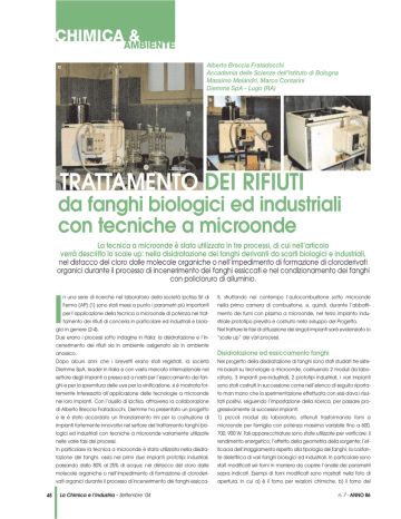 CHIMICAAMBIENTE & Alberto Breccia Fratadocchi Accademia delle Scienze dell’Istituto di Bologna Massimo Melandri, Marco Contarini Diemme SpA - Lugo (RA) a b c TRATTAMENTO DEI RIFIUTI da fanghi biologici ed industriali con tecniche a microonde La tecnica a microonde è stata utilizzata in tre processi, di cui nell’articolo verrà descritto lo scale up: nella disidratazione dei fanghi derivanti da scarti biologici e industriali, nel distacco del cloro dalle molecole organiche o nell’impedimento di formazione di cloroderivati organici durante il processo di incenerimento dei fanghi essiccati e nel condizionamento dei fanghi con policloruro di alluminio. I n una serie di ricerche nel laboratorio della società Ipctisa Srl di ti, sfruttando nel contempo l’autocombustione sotto microonde Fermo (AP) [1] sono stati messi a punto i parametri più importanti nella prima camera di combustione, e, quindi, durante l’abbatti- per l’applicazione della tecnica a microonde di potenza nel trat- mento dei fumi con plasma a microonde, nel terzo impianto indu- tamento dei rifiuti di conceria in particolare ed industriali e biolo- striale prototipo previsto e costruito nello sviluppo del Progetto. gici in genere [2-4]. Nel trattare le fasi di attuazione dei singoli impianti sarà evidenziato lo Due erano i processi sotto indagine in Italia: la disidratazione e l’in- “scale up” dei vari processi. cenerimento dei rifiuti sia in ambiente ossigenato sia in ambiente 48 anossico. Disidratazione ed essiccamento fanghi Dopo alcuni anni che i brevetti erano stati registrati, la società Nel progetto della disidratazione di fanghi sono stati studiati tre siste- Diemme SpA, leader in Italia e con vasto mercato internazionale nel mi basati su tecnologie a microonde, costruendo 2 moduli da labo- settore degli impianti a pressa ed a nastri per l’essiccamento dei fan- ratorio, 3 impianti pre-industriali, 2 prototipi industriali. I vari impianti ghi e per la spremitura delle uve per la vinificazione, si è mostrata for- sono stati costruiti in successione come nell’elenco di seguito riporta- temente interessata all’applicazione delle tecnologie a microonde to man mano che la sperimentazione effettuata con essi dava i risul- nei loro impianti. Con l’ausilio di Ipctisa, attraverso la collaborazione tati positivi, seguendo l’impostazione della ricerca, per passare pro- di Alberto Breccia Fratadocchi, Diemme ha presentato un progetto gressivamente ai successivi impianti: e le è stato accordato un finanziamento Imi per la costruzione di 1) piccoli moduli da laboratorio, ottenuti trasformando forni a impianti fortemente innovativi nel settore del trattamento fanghi bio- microonde per famiglia con potenza massima variabile fino a 600, logici ed industriali con tecniche a microonde variamente utilizzate 700, 900 W. Tali apparecchiature sono state utilizzate per verificare: il nelle varie fasi dei processi. rendimento energetico; l’effetto della geometria della sorgente; l’ef- In particolare la tecnica a microonde è stata utilizzata nella disidra- ficacia dell’irraggiamento rispetto alla tipologia dei fanghi; la costan- tazione dei fanghi, ossia nei primi due impianti prototipi industriali, te dielettrica di vari fanghi biologici ed industriali. In particolare sono passando dallo 80% al 25% di acqua; nel distacco del cloro dalle stati modificati sei forni in maniera da coprire l’analisi dei parametri molecole organiche o nell’impedimento di formazione di cloroderi- sopra indicati. Esempi di forni modificati sono mostrati nella foto di vati organici durante il processo di incenerimento dei fanghi essicca- apertura, in cui a) è il forno per reazioni chimiche, b) il forno del La Chimica e l’Industria - Settembre ‘04 n. 7 - ANNO 86 modulo da laboratorio per sistema di incene- fango con abbattimento fumi con filtri; un rimento, c) il forno con muffola interna per piccolo impianto pilota con abbattimento incenerire; fumi con filtri e con plasma a microonde; un 2) impianto pre-industriale con sorgente di 17 impianto industriale con trattamento fumi kW teorici e movimentazione del fango con con microonde per eliminare la formazione di coclea a circuito chiuso per un quantitativo cloro derivati e parzialmente per l’abbatti- di 400 kg di fango biologico. Complesso di mento fumi. generatori presi in affitto; Il modulo da laboratorio consisteva di quattro 3) impianto pre-industriale con tre generatori parti: il reattore in pyrex protetto internamen- di microonde a magnetron da 2 kW e movi- te da uno schermo ceramico termoisolante mentazione a coclea continua con connes- ma trasparente alle microonde. Le tempera- sioni in teflon e con carico e scarico del ture nel reattore in pyrex erano fra 870 e 900 fango biologico. Il sistema dei magnetron era °C. Il reattore era posto in un forno Cem-Alter fornito di isolatore e diodo raffreddati ad di 900 W potenza nominale, connesso tramite acqua per la valutazione dell’energia riflessa. tubi di vetro pyrex ad un gorgogliatore con- Il pannello di controllo conteneva anche tenente acido nitrico al 10%, quindi ad un l’accessorio per la regolazione della potenza vaso contenente gel di silice e filtri per assor- di microonde da fornire al sistema; Figura 1 - Impianto al plasma 4) impianto pilota industriale con movimenta- bimento dei fumi L’abbattimento dei fumi era del 60%. Nel reattore veniva insufflata aria per zione a coclee in continuo dalla potenza di 20 kW in microonde e la combustione e per il trasporto dei fumi. dalla portata di 360 kg. Lo scorrimento delle coclee dalla durata di L’impianto prototipo era formato da un contenitore in acciaio,dalla sei ore e la potenza dei generatori erano rapportate alla quantità di portata di 8 kg, collegato ad un generatore di microonde da 2 kW acqua da evaporare in 360 kg di fanghi, biologici già essiccati al e ad un tubo in metallo per il trasporto dei fumi. 25%, per portarli al 75% di secco. L’impianto base