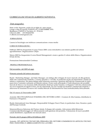 CURRICULUM VITAE DI ALBERTO NOVENTA Dati anagrafici Stato civile: Separato, padre di un figlio di anni cinque Luogo e data di nascita: PADOVA IL 13 DICEMBRE 1974 Residenza: PADOVA Via Istria 12 - ITALIA CELLULARE: +39-3932222785 @ [email protected] FORMAZIONE Laurea in Sociologia con indirizzo comunicazione e mass media CORSI DI FORMAZIONE : Febbraio 2003 ho frequentato il corso Vision 2000: corso introduttivo sui sistemi qualità nel settore agroalimentare. Organizzatore: CSQA Marzo 2003 ho frequentato il corso Brand Management: creare e gestire il valore della Marca. Organizzatore: Il Sole 24 Ore. Formazione Interaziendale Continua PROFILO PROFESSIONALE Dal novembre del 2009 ad oggi: Primaria azienda del settore meccanico Ruolo : Marketing Manger and Sales Manager, con delega allo sviluppo di nuovi mercati, ed alla gestione della rete commerciale esistente. L’azione operativa è rivolta, in particolar modo ad importatori e dealer di settore e contractors. Ho piena delega nella relazione,creazione e gestione dell’attività commerciale in tutti i paesi dove l’azienda è presente od intende entrare. Il mio ruolo principale è l’individuazione dei possibili mercati di sbocco e la creazione delle dinamiche ideali per poter iniziare e sviluppare l’attività commerciale, sia con il supporto di agenti in loco, da me selezionati, sia con l’ausilio di strutture commerciali esistenti o attraverso la creazione di nuove reti vendita.Mercati di riferimento:Far East,Australia,India,Africa,Brasile. Dal 01 marzo al 15novembre 2009 Azienda: MULTINAZIONALE SVIZZERA DEL SETTORE LUSSO – Cosmesi di Alta Gamma, distribuita in Farmacia e Drugstore. Ruolo: International Area Manager- Responsabile Sviluppo Nuovi Paesi, in particolare Asia, Oceania e parte dell’Europa Centrale. Mansioni:Ricerca Selezione del Partner ideale, Sviluppo del contatto, Attivazione della Relazione Commerciale,Monitoraggio ed Affiancamento nella gestione del prodotto, Valutazione di nuovi possibili canali distributivi, soprattutto nei mercati esteri. Periodo: dal 01 giugno 2006 al 28 febbraio 2009 Azienda : FIP ARTICOLI TECNICI SRL,PRIMARIA DEL SETTORE COMMERCIO DI ARTICOLI TECNICI PER L’INDUSTRIA E ABBIGLIAMENTO DA LAVORO. Ruolo: AREA MANAGER ITALIA - ESTERO Mansioni Selezione e gestione del personale cinese, registrazione e conduzione della sede di Rappresentanza in Cina, ricerca e acquisizione di risorse produttive in tutto il Sud Est Asiatico per i settori Abbigliamento, Calzature, Guanti ed Articoli Tecnici per l’industria, Scouting di possibili nuovi business per il gruppo. Gestione generale degli acquisti import. Supervisione dei fornitori esteri. Ispezioni nei siti produttivi. Sviluppo di nuovi articoli e prodotti. Creazione di nuovi marchi e gestione delle certificazioni per le linee DPI. Per parte della mia attività nelle aziende del gruppo mi sono impegnato nella riorganizzazione ed affiancamento della rete commerciale, seguendo i processi di vendita e sviluppo dei nuovi mercati. Periodo: dal novembre 2005 all’ aprile 2006 Azienda : Maingroup S.p.A.-Vilor Ruolo: Resident Manger Asia Mansioni: Consolidamento e sviluppo della rete commerciale in tutta la Cina e l’Asia, analisi e sviluppo dei mercati possibili di sbocco, individuazione ed inserimento di prodotti affini al core business nel mercato consolidato, trading di nuovi prodotti non necessariamente connessi al core business. Consulente per Bado S.r.L. e per Witalybio S.r.L. fino al 06 novembre 2005 Periodo: dal gennaio 2004 al luglio 2005 Azienda: Bado s.r.l. Ruolo: Responsabile Commerciale Mansioni: Creazione e sviluppo della rete commerciale in Italia,analisi e sviluppo dei mercati possibili di sbocco all’estero Individuazione di nuovi prodotti e materiali per la realizzazione di prodotti “speciali”. Periodo: dall’ ottobre 2002 al novembre 2003 Azienda: S.p.A. Burro delle Alpi- S.A.B.A. Ruolo: Addetto al Marketing e Assistente alla Direzione Commerciale Mansioni : I'individuazione delle strategie pubblicitarie e promozionali, la cura e la gestione dell'immagine aziendale. Il coordinamento delle attività di ricerca e sviluppo aziendale, I'individuazione dei nuovi articoli, la ricerca di nuovi canali di sviluppo commerciale e nuove tecniche di vendita. Periodo: dal gennaio 2001 al settembre 2002 Azienda: Ristomat S.r.l.- società di serivizi Ruolo: Responsabile acquisizione commesse di servizio Principali responsabilità: Stipula di contratti di servizio, Redazione di offerte commerciali destinate a clienti Privati e Pubblici. ESPERIENZE ALL’ESTERO 1992 1993 2002 Irlanda- Vacanza Studio USA – Viaggio Studio Irlanda – Corso Avanzato di Lingua Inglese Dal 2005 ad oggi, frequento assiduamente l’Asia, ho vissuto un’esperienza di Resident Manager in Cina.Ho integrato la frequentazione dei mercati esteri, concentrandomi sulla totalità dell'Asia,Oceania, India, Medio Oriente ,Africa,Europa e Brasile a partire dal 2009. AL TRE ESPERIENZE Dal settembre del 1999 all'agosto 2000 ho partecipato, in qualità di organizzatore, alla realizzazione di uno tra i più importanti eventi della "Giornata Mondiale della Gioventù" con la partecipazione di oltre 20000 giovani provenienti da tutto il mondo allo stadio "Flaminio" di Roma Membro del Gruppo Giovani Imprenditori di Confindustria Padova. Le attività che negli anni ho svolto mi hanno consentito di sviluppare, curare e gestire relazioni con persone provenienti da molte aree del mondo. L'esperienza professionale che sto maturando, mi permette di elaborare strategie di marketing, di sviluppo del prodotto, perfezionando le mie conoscenze quotidiane. Profonda conoscenza del mercato Cinese vendita e acquisti, ottima conoscenza del Sud Est Asiatico e buona dei mercati Europei. CONOSCENZE INFORMATICHE Uso quotidianamente i sistemi informatici disponibili in azienda ( Pacchetto Office), ed in particolare il gestionale AS/400. LINGUE STRANIERE Inglese :buona conoscenza della lingua scritta e parlata,