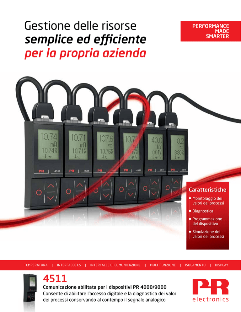 Gestione delle risorse semplice ed efficiente per la propria azienda PERFORMANCE MADE SMARTER Caratteristiche TEMPERATURA | INTERFACCE I.S | INTERFACCE DI COMUNICAZIONE | MULTIFUNZIONE 4511 Comunicazione abilitata per i dispositivi PR 4000/9000 Consente di abilitare l'accesso digitale e la diagnostica dei valori dei processi conservando al contempo il segnale analogico | Monitoraggio dei valori dei processi Diagnostica Programmazione del dispositivo Simulazione dei valori dei processi ISOLAMENTO | DISPLAY Benvenuto in un sistema di connettività flessibile Comunicazione abilitata 4511 Semplice apertura/chiusura a scatto Sulla parte anteriore dei dispositivi PR 4000 / 9000 Rotazione di 180˚ per installazione sottosopra (cambio pulsanti su/giù) Rilevazione automatica delle impostazioni dei dispositivi PR 4000 o 9000 Programmazione sul posto o remota utilizzando il software PPS, disponibile per iOS, Android, Windows e Mac Una connessione più intelligente ai dispositivi Per le nuove installazioni e i clienti che utilizzano già i vari dispositivi PR 4000/ 9000 in panelli esistenti, l´interfaccia di comunicazione 4511rappresenta un modo semplice per passare al digitale. È conveniente e sicuro, ma anche semplice da implementare e utilizzare. Aprire a scatto in modo semplice senza strumenti, collegare una presa RJ45 e iniziare a utilizzarlo. Il modello 4511 rileva immediatamente le impostazioni del dispositivo e i valori dei processi e il display anteriore intuitivo e completamente programmabile con il testo della guida scorrevole rende più semplice il condizionamento del segnale. Quindi, in base alla modalità desiderata di comunicazione, è possibile programmare sul posto o in modo remoto, simulare input e monitorare i dispositivi in pochi secondi, mentre si mantiene ancora il segnale analogico. Il software a piattaforma incrociata rende possibile l'accesso ai dispositivi PR 4000 e 9000 tramite PC/Mac, ai dispositivi gestiti o a un sistema PLC/ DCS. In qualunque modo si esegua la connessione, il modello 4511 consente l'esecuzione dei processi semplicemente in modo più intelligente. Comunicazione veloce e accurata con i dispositivi Cablaggio o wireless, decidi tu PR electronics è sempre pronta a innovare nuovi modi per assicurare migliori prestazioni e gestione delle installazioni. l´interfaccia di Comunicazione 4511 non fa eccezione. Con cablaggio o wireless, localmente o in modo remoto, analogico o digitale, questo dispositivo avanzato consente un accesso semplice ed economico ai valori dei processi dai dispositivi 4000 e 9000 esistenti. È possibile gestire i processi sul posto, connettersi ai dispositivi Modbus RTU, connettersi a qualsiasi protocollo di comunicazione principale tramite gateway o in remoto tramite l'applicazione PPS (PR Process Supervisor). processi, si avranno vantaggi da una comunicazione accurata e veloce coperta dalla stabilità della disponibilità di dati ridondanti. Oltre a una maggiore flessibilità per i Semplicità e sicurezza Digitale e analogico Cablaggio o wireless • Connettività semplice e intuitiva • Apertura/chiusura a scatto per i dispositivi • Il rilevamento automatico trova i dispositivi 4000 o 9000 una volta combinati • Crittografia AES (SHA252) per proteggere i dati attraverso la tecnologia di scambio del certificato protetto. • Ottiene contemporaneamente segnali sia analogici che digitali • Offre misure di ridondanza o aggiuntive per assicurare la disponibilità di dati stabili e sicuri. • Accesso locale o remoto • Monitoraggio e controllo dei dispositivi sul posto o da una posizione remota. Il modello 4511 è dotato di numerose approvazioni per le applicazioni a livello mondiale. Zone 2 Gestione remota delle risorse Sempre e ovunque Per i processi pericolosi, le aree geograficamente remote o difficili da raggiungere, la gestione remota delle risorse aumenta la sicurezza, risparmia il tempo ed è più conveniente. Ciò vale per molti settori e applicazioni, inclusi: energia eolica o idroelettrica, acque e acque reflue, industrie petrolchimiche, bonifica dei siti dei rifiuti, generatori remoti o stazioni di pompaggio. Se è dunque necessario controllare i valori di processo, simulare, configurare, arrestare o avviare un sistema, modificare i setpoint di allarme, scalare di nuovo, attivare o disattivare, è possibile eseguire queste operazioni senza interruzioni e in modo remoto. Tramite l'utilizzo dell'applicazione PPS con un tablet o un PC, è possibile accedere ai dispositivi senza dover ricorrere a un tecnico. Miglior controllo dei livelli dell'acqua nelle stazioni di sollevamento Caso: Lyonnaise des Eaux Lyonnaise des Eaux, a Montgeron (Ile-de-France, Francia) è una società di distribuzione dell'acqua e di trattamento delle acque reflue che ha deciso di rinnovare i quadri di automazione delle stazioni di sollevamento per ottenere una configurazione più semplice e conveniente con accesso remoto. Il problema principale è che le sonde della stazione di sollevamento stavano reagendo al contatto con i rifiuti e l'acqua piovana, causando l'arresto delle pompe. Sostituendo le sonde esistenti con sonde piezo e installando i nuovi trasmettitori universali 4116 con i PR 4511 montati, si è ottenuta un'installazione con una minore quantità di cavi e molto meno problemi. Il team può ora programmare le pompe e monitorare i livelli dell'acqua in modo remoto e ciò porta a una migliore elaborazione e gestione delle risorse. Per altri casi, consultare il sito prelectronics.it/casestories "Oggi, senza cavi, possiamo accedere in remoto ai dati trasmessi dal 4116, nonché programmare i moduli". – Arnaud Chambon, Automaticien Connessione locale o remota Interfaccia per operatori locali (Onsite) Il dispositivo 4511 funziona come interfaccia dell'operatore locare per simulare, monitorare e configurare i valori in sede. Viene di seguito riportata una serie di semplici passaggi, è possibile salvare una configurazione esistente nell'interf