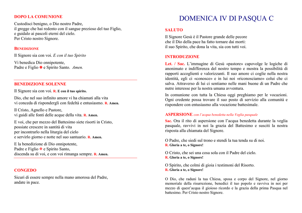 DOPO LA COMUNIONE Custodisci benigno, o Dio nostro Padre, il gregge che hai redento con il sangue prezioso del tuo Figlio, e guidalo ai pascoli eterni del cielo. Per Cristo nostro Signore. DOMENICA IV DI PASQUA C SALUTO BENEDIZIONE Il Signore Gesù è il Pastore grande delle pecore che il Dio della pace ha fatto tornare dai morti: il suo Spirito, che dona la vita, sia con tutti voi. Il Signore sia con voi. E con il tuo Spirito INTRODUZIONE Vi benedica Dio onnipotente, Padre e Figlio e Spirito Santo. Amen. Let. / Sac. L’immagine di Gesù «pastore» capovolge le logiche di anonimato e indifferenza del nostro tempo e mostra la possibilità di rapporti accoglienti e valorizzanti. Il suo amore ci coglie nella nostra identità, egli ci «conosce» e in lui noi «riconosciamo» colui che ci salva. Attraverso di lui ci sentiamo nelle mani buone di un Padre che nutre interesse per la nostra umana avventura. In comunione con tutta la Chiesa oggi preghiamo per le vocazioni. Ogni credente possa trovare il suo posto di servizio alla comunità e rispondere con entusiasmo alla vocazione battesimale. BENEDIZIONE SOLENNE Il Signore sia con voi. R. E con il tuo spirito. Dio, che nel suo infinito amore vi ha chiamati alla vita vi conceda di rispondergli con fedeltà e entusiasmo. R. Amen. Il Cristo, Agnello e Pastore, vi guidi alle fonti delle acque della vita. R. Amen. E voi, che per mezzo del Battesimo siete risorti in Cristo, possiate crescere in santità di vita per incontrarlo nella liturgia del cielo e servirlo giorno e notte nel suo santuario. R. Amen. E la benedizione di Dio onnipotente, Padre e Figlio e Spirito Santo, discenda su di voi, e con voi rimanga sempre. R. Amen. ASPERSIONE con l’acqua benedetta nella Veglia pasquale Sac. Ora il rito di aspersione con l’acqua benedetta durante la veglia pasquale, ravvivi in noi la grazia del Battesimo e susciti la nostra risposta alla chiamata del Signore. O Padre, che siedi sul trono e stendi la tua tenda su di noi. R. Gloria a te, o Signore! O Cristo, che sei una cosa sola con il Padre del cielo. R. Gloria a te, o Signore! O Spirito, che colmi di gioia i testimoni del Risorto. CONGEDO R. Gloria a te, o Signore! Sicuri di essere sempre nella mano amorosa del Padre, andate in pace. O Dio, che raduni la tua Chiesa, sposa e corpo del Signore, nel giorno memoriale della risurrezione, benedici il tuo popolo e ravviva in noi per mezzo di quest’acqua il gioioso ricordo e la grazia della prima Pasqua nel battesimo. Per Cristo nostro Signore. Il sacerdote prende l’aspersorio e asperge se stesso e i ministri, poi il clero e il popolo, passando, se lo ritiene opportuno, attraverso la navata della chiesa. Intanto si esegue un canto battesimale adatto Terminato il canto, rivolto al popolo, dice a mani giunte: Dio onnipotente ci purifichi dai peccati, e per questa celebrazione dell’Eucaristia ci renda degni di partecipare alla mensa del suo regno, in Cristo Gesù nostro Signore. Gloria a Dio nell'alto dei cieli e pace in terra agli uomini di buona volontà. Noi ti lodiamo, ti benediciamo, ti adoriamo, ti glorifichiamo, ti rendiamo grazie per la tua gloria immensa, Signore Dio, Re del cielo, Dio Padre onnipotente. Signore, Figlio unigenito, Gesù Cristo, Signore Dio, Agnello di Dio, Figlio del Padre, tu che togli i peccati del mondo, abbi pietà di noi; tu che togli i peccati del mondo, accogli la nostra supplica; tu che siedi alla destra del Padre, abbi pietà di noi. Perché tu solo il Santo, tu solo il Signore, tu solo l'Altissimo, Gesù Cristo, con lo Spirito Santo nella gloria di Dio Padre. Amen. SIMBOLO DEGLI APOSTOLI In Quaresima e nel Tempo Pasquale di può dire il SIMBOLO DEGLI APOSTOLI Cantore: Credo, Signore, Amen! Tutti: Credo, Signore, Amen! Sac. o Lettore: Io credo in Dio, Padre onnipotente, creatore del cielo e della terra. R. S/L E in Gesù Cristo, suo unico Figlio, nostro Signore, il quale fu concepito di Spirito Santo, nacque da Maria Vergine, patì sotto Ponzio Pilato, fu crocifisso, morì e fu sepolto; discese agli inferi; il terzo giorno risuscitò da morte; salì al cielo, siede alla destra di Dio Padre onnipotente; di là verrà a giudicare i vivi e i morti. R. S/L Credo nello Spirito Santo, la santa Chiesa cattolica, la comunione dei santi, la remissione dei peccati, la risurrezione della carne, la vita eterna. R. COLLETTA Dio onnipotente e misericordioso, guidaci al possesso della gioia eterna, perché l’umile gregge dei tuoi fedeli giunga con sicurezza accanto a te, dove lo ha preceduto il Cristo, suo pastore. Egli è Dio, e vive e regna con te... Oppure: O Dio, fonte della gioia e della pace, che hai affidato al potere regale del tuo Figlio le sorti degli uomini e dei popoli, sostienici con la forza del tuo Spirito, e fa’ che nelle vicende del tempo, non ci separiamo mai dal nostro pastore che ci guida alle sorgenti della vita. Egli è Dio, e vive e regna con te … PREGHIERA DEI FEDELI Introduzione: Stiamo in piedi davanti a Colui che siede sul trono e all’Agnello, nostro Pastore: affidiamogli le nostre intenzioni di preghiera. Supplichiamo il Kyrios, il Signore della vita che ha vinto la morte. Cantore: Preghiamo il Signore: Kyrie, eleison! Conclusione: Signore risorto, ascolta le nostre preghiere e guida alle fonti delle acque della vita questo gregge che il Padre ti ha dato. Tu che vivi e regni nei secoli dei secoli. DOMENICA IV DI PASQUA C DOMENICA IV DI PASQUA C PREFAZIO INVITO AL “PADRE NOSTRO” Nessuno può rapirci dalla mano del Padre. Con fiducia – poiché il nostro Maestro e Pastore lo ha comandato – , noi dalla terra osiamo dire [cantare]la preghiera dei figli e delle figlie di Dio. PREGHIERA ALLO SCAMBIO DEL SEGNO DI PACE Signore Gesù Cristo, che hai detto ai tuoi discepoli: «Io sono il buon pastore. Ho altre pecore che non sono di quest’ovile, anche queste io devo condurre»: non guardare ai nostri peccati e alle nostre divisioni, e dona alla tua Chiesa unità e pace, perché ascoltando la tua voce 