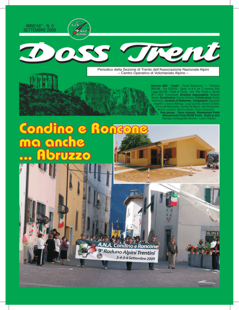 ANNO 56° - N. 3 SETTEMBRE 2009 Periodico della Sezione di Trento dell’Associazione Nazionale Alpini – Centro Operativo di Volontariato Alpino – Condino e Roncone ma anche ... Abruzzo Sezione ANA - Trento - Vicolo Benassuti, 1 - Telefono 985246 - Fax 230235 - Sped. in A.P. art. 2 comma 20/c Legge 662/96 - Filiale di Trento - Aut. Trib. Trento n. 36 del 30.1.1953. Trimestrale. Direttore responsabile: Roberto Gerola. Coordinatore: Giorgio Debiasi. Collaboratore: Guido Vettorazzo. Comitato di Redazione - Componenti: Giancarlo Angelini, Lorenzo Bettega, Luigi Carretta, Saverio Cristel, Enrico de Aliprandini, Aurelio De Maria, Ivan Giovannini, Bruno Lucchini, Marino Sandri, Paolo Zanlucchi. Taxe perçue - Tassa riscossa, Abonnement Poste Abbonamento Posta 38100 Trento - Gratis ai soci Stampa Litotipografia Alcione - Lavis (Trento) 2 n. 3 / settembre 2009 La Presidenza Informa a cura di A. De Maria La Direzione ANA di Trento, i Responsabili di Cori e Fanfare, la Redazione del Doss Trent e i Soci Alpini e Amici si uniscono commossi all'omaggio espresso a livello nazionale ai sei paracadutisti caduti in Afghanistan. Il loro sacrificio è avvenuto nell'adempimento del dovere di mantenere la pace e far crescere la democrazia. – Alla solenne cerimonia di benedizione della Bandiera dei Kaiseriager svoltasi a Jenbach il 6 giugno la Sezione è stata rappresentata dai consiglieri Luigi Carretta con il vessillo e da Nicola Chistè. – Il 25 giugno al Castello del Buonconsiglio di Trento è stato celebrato il 235° Anniversario della Fondazione del Corpo della Guardia di Finanza. Ferdinando Carretta con Vessillo ha rappresentato la Sezione. – La festa del Patrono di Trento, San Vigilio, è stata celebrata con una solenne cerimonia in Duomo presieduta dal Cardinale di origine trentina, Leonardo Sandri. Alla processione nel centro storico di Trento e alla cerimonia in Duomo ha partecipato una delegazione della Sezione con Vessillo sezionale scortato dal Vicepresidente Maurizio Pinamonti, dai Consiglieri Attilio Martini e Aurelio De Maria e da altri alpini. – Venerdì 10 luglio, in occasione del cambio di Comandante del 2° Rgt. Art. Terrestre “Vicenza” fra il Col. Dario Buffa e il Col. Luca Fontana -a cui è stata affidata la Bandiera di Guerra- Il nostro Presidente Giuseppe Demattè e Ferdinando Carretta hanno rappresentato la Sezione. – Il Presidente Giuseppe Demattè accompagnato da Luigi Romeo con Vessillo ha preso parte il 12 agosto alla Messa in suffragio, tenutosi nella chiesa Tempio Civico di San Lorenzo in Trento, per il compianto Padre Eusebio Renato Iori. Figura di alte virtù umanitarie e sociali. – Il 30 agosto a Belluno, preceduto il giorno 28 dalla inaugurazione della mostra allestita in omaggio ad Arturo Andreoletti e da sabato 29 dalla solenne e commovente cerimonia al Sacrario di Col Visentin in omaggio a tutti i Caduti del 5° Rgt. Art. Alpina e del Gruppo “Val Piave”, s’è concluso, con sfilata per le vie cittadine, il 3° Raduno della Brigata Alpina “Cadore”. Solenne la manifestazione a forte testimonianza dell’attaccamento –non solo spirituale- degli Alpini che nel corso degli anni hanno fatto parte di questa gloriosa unità alpina. La presenza del Presidente Nazionale con Labaro dell’Associazione Nazionale Alpini scortato dal C.D.N. e dalla Bandiera di Guerra del 7° Rgt. Alpini hanno conferito alto e significativo attestato alla Brigata “Cadore”. La sezione di Trento ha voluto dare testimonianza tangibile, con la sua presenza, inviando numerosa rappresentanza costituita da Attilio Martini, Aurelio De Maria, Paolo Filippi e Ferdinando Carretta con Vessillo. La strada dove s’è snodata la sfilata, interminabile, ricca di oltre 240 Gagliardetti e 24 Vessilli, è stata accompagnata da una selva di applausi da parte della popolazione giunta dalle Valli cadorine e da altre regioni. REGOLE PER INVIARE MATERIALE AL DOSS TRENT Per poter confezionare al meglio il nostro periodico, si chiede un po’ di collaborazione agli estensori delle cronache di eventi e in particolare da parte dei Gruppi. Questo perché troppo spesso non vengono rispettate alcune regole fondamentali. Per esempio: – Le notizie devono passare al vaglio del capogruppo (o delegato). – Corredare l’articolo possibilmente con foto (non di pranzi o convivi). – Ogni evento è utile da inserire nel settore “cronache dai gruppi”. Si raccomanda di non inviare elenchi di manifestazioni (tipo bilancio di un anno fatto durante l’assemblea), ma inviare le singole manifestazione durante l’anno e non aspettare l’ultimo momento. In ogni numero è pubblicato il termine entro il quale si riceve il materiale. – Il materiale inviato: lo scritto e la foto vanno consegnati in Sezione (su carta o su cd, non su floppy) con telefono di recapito. Se consegnata a mano o inviata per posta la foto deve riportare sul retro la località. Le notizie possono essere inviate preferibilmente per e-mail: foto e testo separati. Tenere presente che lo scritto va inviato in “doc” e le foto in “jpg”, "tif" o “pdf” . Non inserire le foto nel testo perché poi è difficoltoso separarle tecnicamente. – Occorre essere chiari specificando nome e cognome di eventuali personaggi. – In caso di manifestazioni importanti, incaricare qualcuno di fiducia per redigere l’articolo e scattare le foto, e inviare il tutto subito dopo l’evento e non attendere mesi. Le uscite del Doss Trent sono periodiche. Non si vuole pubblicare la notizia di un anno fa o dell’inverno passato. Rispettare i periodi di uscita. – Si pubblicano volentieri matrimoni, anniversari, nascite o decessi. In questi casi è assai gradita un’offerta al Doss Trent. – Non si accettano articoli di giornale (da ricopiare) e fotocopie di foto. Non inviare le foto ricavate dalla stampante perché impubblicabili. Un minimo di collaborazione significa anche pochi minuti per scrivere la cronaca dell’evento e inviarla in Sezione. 