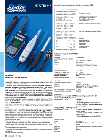 HD37AB1347 Esempio di stampa immediata dei dati, ottenuto con la stampante HD40.1 Modello dello strumento Versione del firmware dello strumento Data del firmware dello strumento Numero di Serie dello strumento Codice Identificativo Descrizione della sonda collegata all’ingresso 1 Descrizione della sonda collegata all’ingresso 2 Data e ora Biossido di Carbonio Monossido di Carbonio Umidità relativa Temperatura Pressione atmosferica Velocità dell’aria Dati tecnici dello strumento HD37AB1347 Strumento Dimensioni 185x90x40mm (Lunghezza x Larghezza x Altezza) Peso 470 g (completo di batterie) Materiali ABS, gomma Display retroilluminato, a matrice di punti 160x160 punti, area visibile 52x42mm HD37AB1347 Indoor Air Quality Monitor HD37AB1347 IAQ Monitor è uno strumento prodotto da Delta Ohm per l’analisi della qualità dell’aria (Indoor Air Quality, IAQ). Lo strumento misura contemporaneamente vari parametri: Biossido di Carbonio CO2, Monossido di Carbonio CO, temperatura, umidità relativa, calcola il Dew Point, la temperatura di bulbo umido, l’umidità assoluta, il mixing ratio, l’entalpia e la pressione atmosferica. Tutto questo con la sonda SICRAM P37AB147. La sonda SICRAM P37B147 non misura il Monossido di Carbonio CO. Allo strumento possono essere collegate inoltre le sonde combinate SICRAM di temperatura e umidità, le sonde SICRAM di velocità dell’aria a filo caldo, le sonde SICRAM di velocità dell’aria a ventolina ed infine le sonde SICRAM di temperatura. Lo strumento, con opportuna procedura, calcola la percentuale di immissione di aria esterna ( % Outside Air) in funzione sia del Biossido di Carbonio CO2 che della temperatura e il Ventilation Rate. HD37AB1347 è datalogger con una capacità di memoria di 67600 memorizzazioni per ciascuno dei due ingressi suddivise in 64 blocchi. Usa il software DeltaLog10 versione 0.1.5.0. Lo strumento è dotato di un ampio display grafico a matrice di punti con risoluzione di 160x160 punti. Norme di riferimento: ASHRAE 62.1-2004, Decreto Legge 81/2008. Le norme si applicano a tutti gli spazi chiusi che possono essere occupati da persone. Sono inclusi, a causa della presenza di elevata umidità, le cucine, i bagni, gli spogliatoi e le piscine. Vanno presi in considerazione, in funzione della qualità dell'aria, eventuali contaminanti chimici, fisici e biologici o l'aria esterna portata all'interno non adeguatamente purificata (Ventilation Rate). Applicazioni tipiche dello strumento con la gamma di sonde sopra menzionate sono: - Misura IAQ e condizioni di comfort nelle scuole, negli uffici e negli ambienti interni. - Analisi e studio della sindrome da edificio malato ( Sick Building Syndrome) e conseguenze che ne derivano. - Verifica dell’efficienza del sistema HVAC. - Esame delle condizioni di IAQ nelle fabbriche per ottimizzare il microclima e migliorare la produttività. - Verifiche in Building Automation. 226 Air Quality - CO - CO2 Condizioni operative Temperatura operativa Temperatura di magazzino Umidità relativa di lavoro Grado di protezione Incertezza dello strumento -5 … 50°C -25 … 65°C 0 … 85% UR no condensa IP66 ± 1 digit @ 20°C Alimentazione Adattatore di rete (cod. SWD10) Batterie Autonomia Corrente assorbita a strumento spento Sicurezza dei dati memorizzati 12Vdc/1A 4 batterie 1.5V tipo AA 20 ore con batterie alcaline da 1800mAh (con sonda P37AB147 inserita) < 45µA illimitata Collegamenti Ingresso per sonde con modulo SICRAM2 Connettori 8 poli maschio DIN 45326 All’ingresso Indoor Air Quality possono essere collegate le sonde: - P37AB147 - P37B147 - Sonde di temperatura con modulo SICRAM - Sonde combinate di temperatura e umidità con modulo SICRAM All’ingresso Temp – Air Velocity possono essere collegate le sonde: - Sonde di velocità dell’aria a filo caldo con modulo SICRAM - Sonde di velocità dell’aria a ventolina con modulo SICRAM - Sonde di temperatura con modulo SICRAM Interfaccia seriale: Presa: Tipo: Baud rate: Bit di dati: Parità: Bit di stop: M12-8 poli. RS232C (EIA/TIA574) oppure USB 1.1 o 2.0 non isolate da 1200 a 38400 baud. Con USB baud=460800 8 Nessuna 1 Memoria Capacità di memoria Intervallo di memorizzazione Intervallo di memorizzazione Sonde di umidità relativa e temperatura con modulo SICRAM Xon-Xoff max 15m suddivisa in 64 blocchi. 67600 memorizzazioni per ciascuno dei 2 ingressi. selezionabile tra: 15, 30 secondi, 1, 2, 5, 10, 15, 20, 30 minuti e 1 ora. Capacità di memoria Intervallo di memorizzazione HP472ACR Pt100 HP473ACR Pt100 ±1.5%UR (10…90%UR) ±0.3°C 0…100%UR -20°C…+80°C ±2.5%UR restante campo ±0.3°C HP474ACR Pt100 0…100%UR -40°C…+150°C HP475ACR Pt100 0…100%UR -40°C…+150°C %UR Temperatura HP475AC1R Pt100 0…100%UR -40°C…+150°C Pt100 0…100%UR -40°C…+150°C Pt100 0…100%UR -40°C…+150°C 15 secondi Circa 11 giorni e 17 ore 10 minuti Circa 1 anno e 104 giorni 30 secondi Circa 23 giorni e 11 ore 15 minuti Circa 1 anno e 339 giorni HP478ACR 1 minuto Circa 46 giorni e 22 ore 20 minuti Circa 2 anni e 208 giorni 2 minuti Circa 93 giorni e 21 ore 30 minuti Circa 3 anni e 313 giorni 5 minuti Circa 234 giorni e 17 ore 1 ora Circa 7 anni e 261 giorni Sonde SICRAM P37AB147 e P37B147 - P37AB147: misura di CO2 – CO – Umidità Relativa - Temperatura – Pressione atmosferica. - P37B147: misura di CO2 – Umidità Relativa - Temperatura – Pressione atmosferica. NDIR a doppia lunghezza d’onda 0 … 5000ppm -5 … 50°C ±50ppm+3% della misura 1ppm 0.1%f.s./°C < 120 sec. (velocità aria = 2m/sec) 5% della misura/5anni %UR Temp 0…100%UR -20°C…+80°C Capacità di memoria Dati tecnici delle sonde che si possono collegare allo strumento HD37AB1347 Accuratezza Sensore di temperatura HP477DCR Biossido di Carbonio CO2 Sensore Campo di misura Campo di lavoro del sensore Accuratezza Risoluzione Dipendenza dalla temperatura Tempo di risposta (T90) Stabilità di lungo termine Campo d’impiego Modello ±0.3°C ±0.3°C ±2.5% (10…95%U