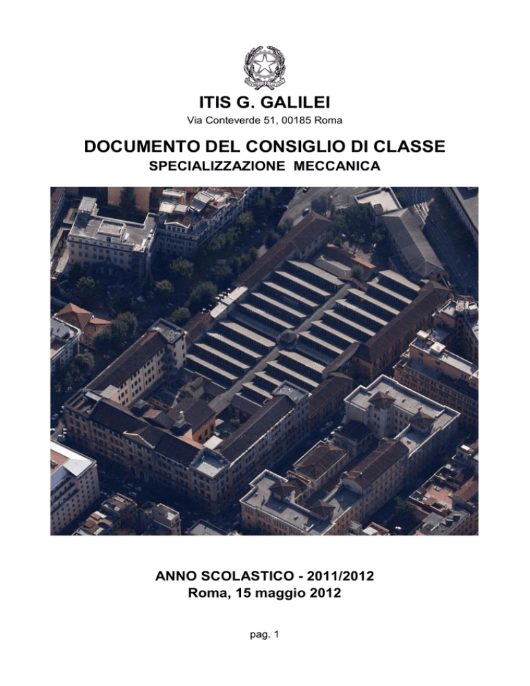 ITIS G. GALILEI Via Conteverde 51, 00185 Roma DOCUMENTO DEL CONSIGLIO DI CLASSE SPECIALIZZAZIONE MECCANICA ANNO SCOLASTICO - 2011/2012 Roma, 15 maggio 2012 pag. 1 pag. 2 DESCRIZIONE DELLA SCUOLA STORIA La prima istituzione di una scuola professionale a Roma, intitolata Istituto nazionale artistico di San Michele, risale ad una legge, mai attuata, del 1907. Nel 1912, un'altra legge, revocando parzialmente le disposizioni della precedente, istituiva l'Istituto Nazionale d'istruzione professionale in Roma. Solo nel 1918, però, fu emanato il Decreto istitutivo, previsto dalla legge del 1912, a seguito di una delibera del Comune di Roma che cedeva l'area del Mercato delle erbe all'Istituto da creare. L'istituto era ordinato in tre sezioni, organizzate come scuole professionali di terzo grado (medie superiori): per industrie elettromeccaniche; per industrie artistiche; per industrie edili. A partire dal 1919 l'Istituto cominciò a funzionare, sebbene in locali provvisori, dopo che fu chiamato ad organizzarlo e a procedere alla costruzione degli edifici, sull'area concessa dal Comune, l'ing. Luigi Andreoni. Nel 1922 cominciò l'effettiva costruzione dell'edificio, a partire dai laboratori. Nel 1924, oltre alle sezioni già menzionate, funzionavano nell'istituto anche laboratori-scuola per aggiustatori, tornitori, fucinatori modellisti, fonditori meccanici, edili, tipografi, ceramisti, fabbri artistici, falegnami, vetrai, stagnai. Nel 1927 vennero istituiti corsi serali premilitari per motoristi e montatori d'aviazione e, successivamente, anche per radiotelegrafisti e corsi serali per maestranze qualificate e specializzate, corrispondenti ai vari rami delle attività industriali (aggiustatori, fresatori, tornitori, attrezzisti, saldatori autogenisti). Nel 1930 fu istituita la sezione per radiotecnici. Nel 1931 la sezione meccanici elettricisti fu scissa in due distinte sezioni. Nel 1933 l'Istituto, finalmente completato e arredato, fu inaugurato e trasformato in Regio Istituto Tecnico Industriale. Nel 1940 fu istituita la sezione per la specializzazione in Costruzioni aeronautiche, soppressa nel 1944 dagli alleati e ripristinata nel 1946. Nel 1961, con il riordino degli istituti tecnici industriali, le sezioni hanno preso il nome di specializzazioni e elettricisti e radiotecnici sono state rinominate elettrotecnica e telecomunicazioni. Dal 1994, con l'entrata in vigore dei nuovi programmi, gli indirizzi presenti in istituto corrispondono alle sezioni storiche: meccanica, edilizia (con programmi sperimentali), elettrotecnica ed automazione (già elettrotecnica), costruzioni aeronautiche (con programmi sperimentali), elettronica e telecomunicazioni (già telecomunicazioni). Sempre dal 1994 è stata attivata anche la sperimentazione dell'indirizzo di liceo scientifico-tecnologico. Nel 2002 è stato soppresso l’indirizzo di edilizia per mancanza di iscrizioni. Infine in data 2007/2008 l’Istituto è stato designato “Polo per l’Edilizia Nuove Tecnologie Abitative e per la Certificazione Matematica per la Provincia di Roma” ATTREZZATURE L'istituto dispone di numerosi laboratori: aule di disegno; laboratori di fisica; di chimica; di scienze; di informatica; di lingue; cantiere edile; tecnologia edile; costruzioni aeronautiche; galleria del vento; tecnologia meccanica; macchine utensili a controllo numerico (freseria e torneria); macchine a fluido; sistemi ed automazione industriale; tecnologie elettriche, disegno e progettazione; impianti elettrici; misure elettriche; sistemi elettronici automatici; misure elettroniche; tecnologie elettroniche, disegno e progettazione. E' dotato anche di aule speciali: multimediale; CAD; ricerche; nonché di palestre e campetto di pallavolo. Possiede in oltre una fornita biblioteca. pag. 3 PROGETTI E ATTIVITA' INTEGRATIVE ED EXTRACURRICULARI Nell'istituto sono funzionanti da diversi anni progetti mirati ad offrire agli studenti opportunità educative e formative di supporto all'attività didattica. Vengono elencati quelli più significativi dal punto di vista didattico. Orientamento: per gli studenti delle scuole medie, per la scelta della specializzazione del triennio, per la scelta degli studi universitari e per l'inserimento nel mondo del lavoro. Motivazione e Programmazione Didattica: cura i corsi di recupero e l'attività di sostegno per ridurre l'insuccesso scolastico; elabora strumenti didattici. Centro di Informazione e Consulenza (CIC): coordina e sostiene il progetto Giovani, il progetto Base (già progetto Mosaico) finanziato dal comune di Roma e volto alla prevenzione primaria contro le nuove droghe (extasy), il progetto Arcobaleno, in cui il Galilei è scuola polo per tutte le attività, di prevenzione primaria del disagio giovanile. Cultura: cura le visite culturali, i viaggi di istruzione, la partecipazione a spettacoli teatrali, cinematografici e musicali; tiene i rapporti con le istituzioni scolastiche europee. Gruppo Sportivo e Polisportiva Galilei: organizzano attività pomeridiane di atletica leggera, ginnastica, pallavolo, basket, etc. Le attività integrative consistono nell'attivazione di uno sportello didattico a disposizione degli studenti che possono avvalersene per chiedere chiarimenti e per organizzare individualmente il recupero individuando tempi e modi dello stesso guidati dall'insegnante; i corsi di recupero, pur costituendo attività integrativa, sono inseriti nella vera e propria progettazione dei singoli docenti, anche quando svolti fuori dell'orario scolastico. Le attività pomeridiane extracurricolari consistono in: Laboratorio di Cinema, Laboratorio di Musica, Giornalino scolastico. Infine sono presenti nell'istituto corsi di diploma universitario della Facoltà di Ingegneria dell'Università di Roma "La Sapienza". L'aula magna del Galilei è spesso sede di mostre e convegni culturali di rilevante importanza. pag. 4 PROFILO E STORIA DELLA CLASSE Il gruppo classe, nell’ultimo anno scolastico, è composto da alunni proven