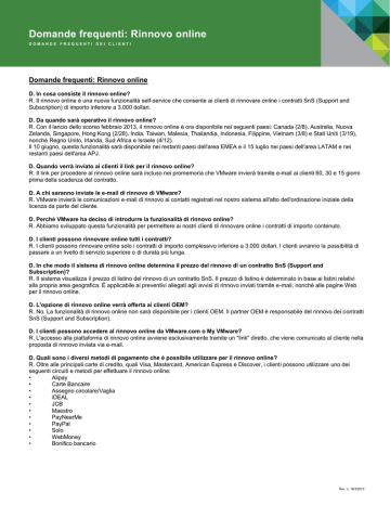 Domande frequenti: Rinnovo online DOMANDE FREQUENTI DEI CLIENTI Domande frequenti: Rinnovo online D. In cosa consiste il rinnovo online? R. Il rinnovo online è una nuova funzionalità self-service che consente ai clienti di rinnovare online i contratti SnS (Support and Subscription) di importo inferiore a 3.000 dollari. D. Da quando sarà operativo il rinnovo online? R. Con il lancio dello scorso febbraio 2013, il rinnovo online è ora disponibile nei seguenti paesi: Canada (2/8), Australia, Nuova Zelanda, Singapore, Hong Kong (2/28), India, Taiwan, Malesia, Thailandia, Indonesia, Filippine, Vietnam (3/8) e Stati Uniti (3/19), nonché Regno Unito, Irlanda, Sud Africa e Israele (4/12). Il 10 giugno, questa funzionalità sarà disponibile nei restanti paesi dell'area EMEA e il 15 luglio nei paesi dell'area LATAM e nei restanti paesi dell'area APJ. D. Quando verrà inviato ai clienti il link per il rinnovo online? R. Il link per procedere al rinnovo online sarà incluso nei promemoria che VMware invierà tramite e-mail ai clienti 60, 30 e 15 giorni prima della scadenza del contratto. D. A chi saranno inviate le e-mail di rinnovo di VMware? R. VMware invierà le comunicazioni e-mail di rinnovo ai contatti registrati nel nostro sistema all'atto dell'ordinazione iniziale della licenza da parte del cliente. D. Perché VMware ha deciso di introdurre la funzionalità di rinnovo online? R. Abbiamo sviluppato questa funzionalità per permettere ai nostri clienti di rinnovare online i contratti di importo contenuto. D. I clienti possono rinnovare online tutti i contratti? R. I clienti possono rinnovare online solo i contratti di importo complessivo inferiore a 3.000 dollari. I clienti avranno la possibilità di passare a un livello di servizio superiore o di durata più lunga. D. In che modo il sistema di rinnovo online determina il prezzo del rinnovo di un contratto SnS (Support and Subscription)? R. Il sistema visualizza il prezzo di listino del rinnovo di un contratto SnS. Il prezzo di listino è determinato in base ai listini relativi alla propria area geografica. È applicabile ai preventivi allegati agli avvisi di rinnovo inviati tramite e-mail, nonché alle pagine Web per il rinnovo online. D. L'opzione di rinnovo online verrà offerta ai clienti OEM? R. No. La funzionalità di rinnovo online non sarà disponibile per i clienti OEM. Il partner OEM è responsabile del rinnovo dei contratti SnS (Support and Subscription). D. I clienti possono accedere al rinnovo online da VMware.com o My VMware? R. L'accesso alla piattaforma di rinnovo online avviene esclusivamente tramite un "link" diretto, che viene comunicato al cliente nella proposta di rinnovo inviata via e-mail. D. Quali sono i diversi metodi di pagamento che è possibile utilizzare per il rinnovo online? R. Oltre alle principali carte di credito, quali Visa, Mastercard, American Express e Discover, i clienti possono utilizzare uno dei seguenti circuiti e metodi per effettuare il rinnovo online: • Alipay • Carte Bancaire • Assegno circolare/Vaglia • iDEAL • JCB • Maestro • PayNearMe • PayPal • Solo • WebMoney • Bonifico bancario Rev. n. 16/3/2013 (Nota: alcuni dei metodi di pagamento citati sono disponibili solo in alcuni paesi e l'elenco è soggetto a modifica. Il sistema visualizzerà le opzioni di pagamento a disposizione dei clienti in base al paese in cui il cliente esegue la transazione) D. Il rinnovo online supporta eventuali altre lingue oltre l'inglese? R. Sì, il rinnovo online supporta diverse lingue. Le e-mail che vengono inviate ai clienti saranno in una delle seguenti lingue, in base al paese del cliente: • Inglese • Tedesco • Francese • Italiano • Olandese • Spagnolo (Spagna e America Latina) • Portoghese brasiliano • Giapponese • Cinese semplificato • Coreano Le pagine Web del rinnovo online supportano 30 lingue. Il cliente avrà la possibilità di selezionare la lingua preferita per le pagine Web. L'elenco completo delle lingue attualmente supportate include: • Arabo • Ceco • Danese • Tedesco • Greco • Inglese • Spagnolo • Finlandese • Francese • Ebraico • Hindi • Croato • Ungherese • Italiano • Giapponese • Coreano • Olandese • Norvegese • Portoghese (Brasile) • Polacco • Portoghese • Rumeno • Russo • Slovacco • Sloveno • Svedese • Thailandese • Turco • Cinese tradizionale • Cinese semplificato D. Quali sono le valute che i clienti possono utilizzare sulla piattaforma di rinnovo online per eseguire la transazione? R. Sulla piattaforma online, un cliente può eseguire la transazione in 29 valute. L'elenco dettagliato di queste valute include le seguenti: 1) Dollaro australiano 2) Real brasiliano 3) Sterlina britannica 4) Dollaro canadese 5) Yuan cinese 6) Corona ceca 7) Corona danese 8) Euro 16) Peso messicano 17) Zloty polacco 18) Rublo russo 19) Dollaro di Singapore 20) Rand sudafricano 21) Corona svedese 22) Franco svizzero 23) Dollaro taiwanese 9) Dollaro di Hong Kong 10) Fiorino ungherese 11) Rupia indiana 12) Yen giapponese 13) Ringgit malese 14) Dollaro neozelandese 15) Corona norvegese 24) Baht thailandese 25) Won coreano 26) Lats lettone 27) Litas lituano 28) Lira turca 29) Dollaro statunitense D. In che modo i clienti possono utilizzare uno dei nuovi metodi di pagamento introdotti che non prevedono l'utilizzo di carte di credito? R. Il rinnovo online supporta carte di credito, nonché altri metodi di pagamento definiti di "pagamento offline". Un metodo di pagamento offline è un metodo che viene eseguito al di fuori del processo di checkout guidato, ad esempio tramite bonifico bancario o PayPal. Se il cliente utilizza un metodo di pagamento offline, sulla pagina di conferma dell'ordine verranno fornite una serie di istruzioni per effettuare il pagamento. Una volta terminato il processo di pagamento, il sistema eseguirà il rinnovo del contratto VMware SnS (Support and Subscription) del cliente. D. VMware gestis
