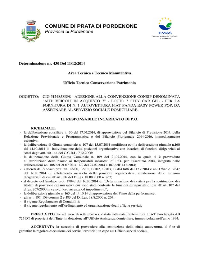 COMUNE DI PRATA DI PORDENONE Provincia di Pordenone Gestione Ambientale Verificata n° IT000639 Determinazione nr. 430 Del 11/12/2014 Area Tecnica e Tecnico Manutentiva Ufficio Tecnico Conservazione Patrimonio OGGETTO: CIG 5124858E98 ADESIONE ALLA CONVENZIONE CONSIP DENOMINATA "AUTOVEICOLI IN ACQUISTO 7" LOTTO 5 CITY CAR GPL PER LA FORNITURA DI N. 1 AUTOVETTURA FIAT PANDA EASY POWER POP, DA ASSEGNARE AL SERVIZIO SOCIALE DOMICILIARE IL RESPONSABILE INCARICATO DI P.O. RICHIAMATI: la deliberazione consiliare n. 30 del 17.07.2014, di approvazione del Bilancio di Previsione 2014, della Relazione Previsionale e Programmatica e del Bilancio Pluriennale 20142016, immediatamente esecutiva; la deliberazione di Giunta comunale n. 107 del 15.07.2014 modificata con la deliberazione giuntale n.160 del 14.10.2014 di individuazione delle posizioni organizzative con incarichi di funzioni dirigenziali ai sensi degli artt. 40 44 del C.C.R.L. 7.12.2006; la deliberazione della Giunta Comunale n. 109 del 21.07.2014, con la quale si è provveduto all’attribuzione delle risorse ai Responsabili incaricati di P.O. per l’esercizio 2014, integrata dalle deliberazioni nn. 108 del 21.07.2014, 172 del 27.10.2014 e 187 dell’1.12.2014; i decreti del Sindaco prot. nn. 12700, 12701, 12702, 12703, 12704 tutti del 17.7.2014 e nn. 17846 e 17847 del 16.10.2014 di affidamento incarichi delle posizioni organizzative, attribuzione delle funzioni dirigenziali di cui all’art. 107 del D.Lgs. 18.08.2000 n. 267; il decreto del Sindaco prot. 17848 del 16.10.2014 di “Determinazione dei criteri per la sostituzione dei titolari di posizione organizzativa cui sono state conferite le funzioni dirigenziali di cui all’art. 107 del d.lgs. 267/2000 in caso di loro assenza od impedimento”; la deliberazione giuntale n. 163 del 14.10.14 di approvazione del Piano della performance; gli artt. 107, 109 comma 2 e 183 del D. Lgs. 18.8.2000 n. 267; il vigente Regolamento di Contabilità; il vigente regolamento sull’ordinamento ed organizzazione degli uffici e servizi; PRESO ATTO che nel mese di settembre u.s. è stata rottamata l’autovettura FIAT Uno targata AB 725 DT di proprietà dell’Ente, in dotazione all’Ufficio Assistenza domiciliare, immatricolata nell’anno 1994; ACCERTATA la necessità di provvedere alla sostituzione della citata autovettura, al fine di garantire la regolare esecuzione dei servizi territoriali in capo all’Ufficio servizi sociali. CONSIDERATO che ai sensi dell’art 1 del Decreto legge n. 95/2012, convertito in legge n. 135/2012 viene sancita l’obbligatorietà per le pubbliche amministrazioni di stipulare contratti di approvvigionamento attraverso gli strumenti messi a disposizione da Consip Spa; ACCERTATO che, alla data odierna, risulta attiva la convenzione CONSIP denominata “AUTOVEICOLI IN ACQUISTO 7 – CITY CAR GPL LOTTO 5”, color bianco pastello, con la quale è possibile procedere all’acquisto di un’autovettura avente le caratteristiche minime generali, al fine dello svolgimento del servizio gestito dall’Ente; VALUTATA pertanto la possibilità di aderire alla citata convenzione, procedendo all’acquisto di un’autovettura nuova mod. Fiat Panda 1.2 69 CV Easy Power Pop, alimentata a benzina/GPL e classificata Euro 6; TENUTO CONTO delle disposizioni contenute nel Manuale d’uso per gli acquisti verdi (G.P.P.) nell’ambito del sistema di gestione ambientale in vigore (EMAS II registrazione n. IT00639) presso l’Ente; RAVVISATA quindi la necessità di procedere all’acquisto della suddetta autovettura, il cui costo è pari Euro 11.767,95 Iva 22% inclusa, comprensiva inoltre degli oneri relativi alle pratiche di immatricolazione, delle imposte di trascrizione e degli allestimenti indispensabili all’esecuzione del servizio; RITENUTO quindi di aderire alla Convenzione “AUTOVEICOLI IN ACQUISTO 7 – CITY CAR GPL LOTTO 5”, color bianco pastello, stipulata tra Consip Spa, per conto del Ministero dell’Economia e delle Finanze e Fiat Auto Var S.r.l. A S.U. (in RTI); PRESO ATTO degli adempimenti posti sulla tracciabilità dei flussi finanziari dall’art. 3 c. 5 della legge 136 del 13 agosto 2010 così come modificato dal D.L. 187/2010 e che il Codice Identificativo di Gara è il seguente: 5124858E98; DETERMINA 1. Di aderire alla Convenzione “AUTOVEICOLI IN ACQUISTO 7 – CITY CAR GPL LOTTO 5” color bianco pastello, stipulata tra Consip Spa, per conto del Ministero dell’Economia e delle Finanze e Fiat Auto Var S.r.l. A S.U. (in RTI), procedendo all’acquisto di un’autovettura nuova mod. Fiat Panda 1.2 69 CV Easy Power Pop, alimentata a benzina/GPL e classificata Euro 6, da assegnare al Servizio Sociale Domiciliare dell’Ente, per una spesa complessiva pari Euro 11.767,95 Iva 22% inclusa, comprensiva inoltre degli oneri relativi alle pratiche di immatricolazione, delle imposte di trascrizione e degli allestimenti indispensabili all’esecuzione del servizio; 2. Di impegnare la spesa complessiva di euro 11.767,95 sui capitoli di seguito elencati: Eser. 2014 EPF 2014 Cap. 30240 CIG 5124858E98 Cod Bilancio 2100405 Importo 11.767,95 Soggetto FIAT AUTO VAR SRL A S.U. (IN RTI) cod.fisc. / p.i. IT 06908900019 IL RESPONSABILE INCARICATO DI P.O. ARCH. LUCIANO LIUT COMUNE DI PRATA DI PORDENONE Provincia di Pordenone Gestione Ambientale Verificata n° IT000639 N.RO DETERMINA 430 DATA 11/12/2014 PROPOSTA DA Area Tecnica e Tecnico Manutentiva Ufficio Tecnico Conservazione Patrimonio DATA ESECUTIVITA’ 11/12/2014 OGGETTO: CIG 5124858E98 ADESIONE ALLA CONVENZIONE CONSIP DENOMINATA "AUTOVEICOLI IN ACQUISTO 7" LOTTO 5 CITY CAR GPL PER LA FORNITURA DI N. 1 AUTOVETTURA FIAT PANDA EASY POWER POP, DA ASSEGNARE AL SERVIZIO SOCIALE DOMICILIARE Ai sensi dell’art. 151, comma 4° del D.Lgs.267 18.08.2000, si appone il visto di regolarità contabile e l’attestazione della copertura finanziaria. IL RESPONSABILE DEL SERVIZIO FINANZIARIO (DOTT. SALVATORE SORBELLO) Riferimento pratica finanziaria : 2