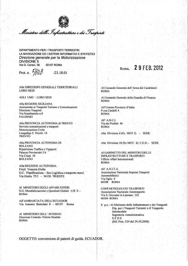 ELENCO DEGLI STATI LE CUI AUTORITA’ RILASCIANO PATENTI DI GUIDA CHE POSSONO ESSSERE CONVERTITE IN ITALIA Circolare prot. n. 5808/23.18.01 del 29.02.2012 Entrata in vigore Accordo Italia – Ecuador : 12.03.2012 In vigore fino al 12.03.2017 SRI LANKA ALBANIA (valido fino al 15/08/2014) FRANCIA MAROCCO (valido fino al 14/11/2016) ALGERIA GERMANIA MOLDOVA SVEZIA ARGENTINA GIAPPONE NORVEGIA SVIZZERA AUSTRIA GRAN BRETAGNA PAESI BASSI TAIWAN BELGIO GRECIA POLONIA TUNISIA BULGARIA IRLANDA PORTOGALLO TURCHIA CIPRO ISLANDA PRINCIPATO DI MONACO UNGHERIA CROAZIA LETTONIA REPUBBLICA CECA (valido fino al 12/12/2014) DANIMARCA LIBANO REPUBBLICA DI COREA LIECHTENSTEIN REPUBBLICA SLOVACCA (valido fino al 19/09/2014) LITUANIA ROMANIA ESTONIA LUSSEMBURGO SAN MARINO FILIPPINE MACEDONIA SLOVENIA FINLANDIA MALTA SPAGNA URUGUAY ECUADOR (valido fino al 12/03/2017) EL SALVADOR ELENCO DEGLI STATI LE CUI AUTORITA’ RILASCIANO PATENTI DI GUIDA CHE POSSONO ESSERE CONVERTITE SOLO PER ALCUNE CATEGORIE DI CITTADINI CANADA: personale diplomatico e consolare CILE: diplomatici e loro familiari STATI UNITI: personale diplomatico e consolare e loro familiari ZAMBIA: cittadini in missione governativa e loro familiari ______________________________________________________________________________ MODELLI DI PATENTI DI GUIDA Modelli di patente di guida rilasciati in Ecuador 1. modello: Direzione Nazionale di Transito - Organismo emittente Polizia Nazionale di Transito - Emissione fino a 2008 - Annessi 1, 2 e 3 2. modello: Direzione Nazionale di Transito e Trasporto Terrestre - Organismo emittente Polizia Nazionale di Transito - Emissione solo anno 2006 - Annesso 4 3. modello: Commissione Nazionale del Trasporto Terrestre, Transito e Sicurezza Stradale - Organismo emittente Commissione Nazionale del Trasporto Terrestre, Transito e Sicurezza Stradale - Emissione da 2008 - Annessi 5, 6 e 7 4. modello: Commissione di Transito della Provincia del Guayas - Organismo emittente Commissione di Transito della Provincia del Guayas - Emissione fino a 2007 - Annessi 8e9 5. modello: Commissione di Transito della Provincia del Guayas - Organismo emittente Commissione di Transito della Provincia del Guayas - Emissione da 2007 - Annesso 10 6. modello: Repubblica dell'Ecuador - Organismo emittente Commissione Nazionale del Trasporto Terrestre, Transito e Sicurezza Stradale - Emissione da Ottobre del 2010 Annesso 11 Modelli di patente di guida rilasciati in Italia elencati dal più vecchio al più recente. 1) modello di patente MC 701/MEC . Autorità preposta al rilascio: il Prefetto. 2) modello di patente MC 701/N. Autorità preposta al rilascio il Prefetto. 3) modello di patente MC 701/C. Autorità preposta al rilascio: il Prefetto 4) modello di patente MC 701 /D. Autorità preposta al rilascio: il Prefetto. 5) modello di patente MC 701/E. Autorità preposta al rilascio: M.C.T.C. (Motorizzazione Civile e Trasporti in Concessione); 6) modello di patente MC 701/F rilasciata dal 1°Luglio 1996 ai sensi della Direttiva 91/439 CEE. Autorità preposta al rilascio: M.C.T.C. 7) modello di patente MC 701/ F. La numerazione dei dati contenuti nella pagina 2 rispetto al modello di cui al punto 6, è stata modificata. Autorità preposta al rilascio: M.C.T.C. 8) modello di patente MC 720 F ai sensi della Direttiva 96/47. Autorità preposta al rilascio: M.C.T.C. 9) modello di patente MC 720 F ai sensi della Direttiva 96/47. Autorità preposta al rilascio: M.C.T.C. Differisce dal precedente perché la dicitura "patente di guida" è riportata anche nelle lingue dei dieci Stati entrati nell'Unione Europea il 1° maggio 2004. 10) modello di patente MC 720 F ai sensi della Direttiva 96/47. Autorità preposta al rilascio: M.C.T.C. Differisce dal precedente descritto al punto 9) solo perché il numero dello stampato riportato in basso a destra sul retro del documento non è riprodotto in stampa ma realizzato in laser engraving e quindi rilevabile al tatto. I TABELLA DI EQUIPOLLENZA per la conversione delle patenti rilasciate in Ecuador in documenti italiani ECUADOR ITALIA A1 A1 A2 A A A B B C B C1 B D B+D D1 B E B+CE E1 B F BS* * per il rilascio della categoria B speciale è necessario sostenere una prova pratica di guida. II TABELLA DI EQUIPOLLENZA per la conversione delle patenti rilasciate in Italia in documenti ecuadoriani ITALIA ECUADOR A1 -A A2 B (conseguita prima del A2+B 01/01/1986) * B (conseguita dal B 01/01/1986 in poi) * C B D B+D B+E B C+E B+E D+E B+D BS F * la patente di categoria B italiana abilita anche alla conduzione di motocicli, senza limitazioni, se conseguita (per esame o conversione) entro il 01/01/1986. EVENTUALI SOTTOCATEGORIE RILASCIATE IN ITALIA DAL 01/07/1996 FINO ALL'ENTRATA IN VIGORE DEL D.M. 29/03/1999 ITALIA ECUADOR B1 -C1 B D1 B MODELO 1 (MODELLO 1) De (Da): A (Alla) D.G. Motorizzazione - div. 5 Fax 06 4158 6275 ECUADOR - fax n SOLICITUD DE CERTIFICACION (RICHIESTA DI ATTESTAZIONE) de los datos relativos al carnet de conducir ITALIANO n. ....................................... (dei dati relativi alla patente di guida ITALIANA n.) DATOS ANAGRÁFICOS DEL TITULAR DEL PERMISO: (DATI ANAGRAFICI DEL TITOLARE DELLA PATENTE) NOMBRE (NOME) ................... APELLIDO (COGNOME) ................... FECHA DE NACIMIENTO (DATA DI NASCITA) .................................... LUGAR DE NACIMIENTO (indicar ciudad y pais) .............................. (LUOGO DI NASCITA) (con indicazione del comune e della nazione) SE ANEXA COPIA DE LA LICENCIA (Si allega copia della patente.) Lugar y Fecha SELLO Y FIRMA DEL FUNCIONARIO Luogo e data (TIMBRO E FIRMA DEL FUNZIONARIO) MODELO 1 bis (Modello 1 bis) De (Da): D.G.Motorizzazione A (Alla) Divisione 5 ITALIA - fax n. 0641586275 ECUADOR - fax n CERTIFICACION de los datos relativos al carnet de conducir italiano n. ............... (ATTESTAZIONE dei dati relativi alla patente di guida italiana n) 1) DATOS ANAGRÁFICOS DEL TITULAR DEL PERMISO: (DATI ANAGRAFICI DEL TITOLARE DELLA PATENTE): NOMBRE (NOME) ......