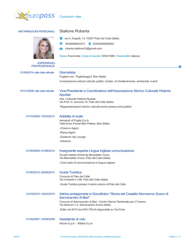 Curriculum vitae INFORMAZIONI PERSONALI Stallone Roberta via A. Angiulli, 14, 70027 Palo del Colle (Italia) 0039080624473 00393926085844 [email protected] Sesso Femminile | Data di nascita 10/03/1986 | Nazionalità Italiana ESPERIENZA PROFESSIONALE 01/06/2014–alla data attuale Giornalista Pugliain.net - Pugliadoggi.it, Bari (Italia) Composizione articoli culturali, politici, turistici, di intrattenimento, ambientali, eventi 01/01/2008–alla data attuale Vice-Presidente e Coordinatrice dell'Associazione Storico Culturale Historia Apuliae Ass. Culturale Historia Apuliae Via Prof. G. Iannone 10, Palo del Colle (Italia) -Rappresentazioni storico culturali anche presso enti pubblici 01/10/2008–15/03/2013 Addetta di scalo Aeroporti di Puglia S.p.A. Viale Enzo Ferrari Bari Palese, Bari (Italia) -Check-in Agent -Ramp Agent -Gestione Vip Lounge -Imbarchi 01/06/2009–01/08/2012 Insegnante esperta Lingua Inglese comunicazione Scuola statale d'infanzia Benedetto Croce Via Benedetto Croce, Palo del Colle (Italia) -Corsi estivi di comunicazione in lingua inglese 01/06/2012–25/09/2012 Guida Turistica Comune di Palo del Colle Via Umberto I n.56, Palo del Colle (Italia) -Guida Turistica presso il centro storico di Palo del Colle 01/03/2010–15/03/2010 Attrice protagonista in Docufiction "Storia del Castello Normanno Svevo di Sannicandro di Bari" Comune di Sannicandro di Bari - Centro Servizi Territoriale per il Turismo Via Marconi n.2, Sannicandro di bari (Italia) -Edito nel 2010 da HGV ITALIA disponibile su YouTube 01/05/2007–10/09/2008 Assistente di volo Airone S.p.A. - Alitalia S.p.A. 9/3/15 © Unione europea, 2002-2015 | http://europass.cedefop.europa.eu Pagina 1 / 3 Curriculum vitae Stallone Roberta Piazza Almerico da Schio - Pal RPU Fiumicino, Roma (Italia) 10/02/2006–15/04/2007 Assistente di volo Eurofly S.p.A. Via Ettore Bugatti, Milano (Italia) ISTRUZIONE E FORMAZIONE 10/10/2012–15/07/2015 Laurea in "Scienze della Comunicazione" e Marketing Università degli Studi di Bari Aldo Moro, Bari (Italia) Tesi in "Etica nelle nuove energie rinnovabili tra politica e sostenibilità" 10/09/2000–10/07/2005 Maturità Scientifica Liceo Scientifico "E. Amaldi" Via Abbruzzese n.38, Bitetto (Italia) COMPETENZE PERSONALI Lingua madre italiano Altre lingue COMPRENSIONE PARLATO PRODUZIONE SCRITTA Ascolto Lettura Interazione Produzione orale inglese C2 C2 C2 C2 francese B2 B2 B2 B2 B1 spagnolo A2 A2 A2 A2 A1 C2 Certificazione di Lingua Inglese conseguito presso l'EF College di Brighton, Londra Livelli: A1/A2: Livello base - B1/B2: Livello intermedio - C1/C2: Livello avanzato Quadro Comune Europeo di Riferimento delle Lingue Competenze comunicative Competenze organizzative e gestionali Competenze professionali -Ottime capacità di rapportarsi nel gruppo, diventando leader e nello stesso tempo riuscendo ad incontrare le esigenze dell'altro, non urtandone la sensibilità. -Ottima capacità di retorica, sia all'interno del gruppo, sia lavorando individualmente. -Ottime capacità ad ambientarsi in contesti sociali e culturali differenti. -Spiccata dote nella comunicazione, sapendo ascoltare e comprendere esigenze altrui facendo nascere il bisogno e/o necessità di una determinata cosa.-Ottima predisposizione al problem-solving. -Attitudine all'organizzazione e alla gestione del lavoro, di un progetto e di una responsabilità. -Particolare predisposizione per la cura dell'aspetto commerciale e pubblicitario, -Spiccato senso del gusto estetico, derivante da esperienza pregressa con contatto diretto di front line. ULTERIORI INFORMAZIONI -Patente B -Patente aeroportuale -Certificato F.I.N. di Assistente Bagnanti Competenze informatiche 9/3/15 Office (Word, Excel, Power Point), Internet explorer, Photoshop, Arco, Arco Easy, © Unione europea, 2002-2015 | http://europass.cedefop.europa.eu Pagina 2 / 3 Curriculum vitae Stallone Roberta Sabre, Local DCS, Sistema Lufthansa, Sistma British Airways, Windows 98/2000/XP/7 9/3/15 © Unione europea, 2002-2015 | http://europass.cedefop.europa.eu Pagina 3 / 3