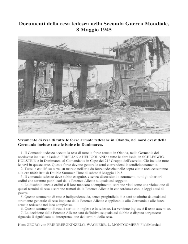 Documenti della resa tedesca nella Seconda Guerra Mondiale, 8 Maggio 1945 Strumento di resa di tutte le forze armate tedesche in Olanda, nel nord ovest della Germania incluse tutte le isole e in Danimarca. 1. Il Comando tedesco accetta la resa di tutte le forze armate in Olanda, nella Germania del nordovest incluse le Isole di FRISLIAN e HELIGOLAND e tutte le altre isole, in SCHLESWIGHOLSTEIN e in Danimarca, al Comandante in Capo del 21° Gruppo dell'esercito. Ciò include tutte le navi in queste aree. Queste forze devono gettare le armi e arrendersi incondizionatamente. 2. Tutte le ostilità su terra, su mare o nell'aria da forze tedesche nelle sopra citate aree cesseranno alle ore 0800 British Double Summer Time di sabato 5 Maggio 1945. 3. Il comando tedesco deve subito eseguire, e senza discussioni o commenti, tutti gli ulteriori ordini che saranno pubblicati dalle Potenze Alleate su qualsiasi soggetto. 4. La disubbidienza a ordini o il loro mancato adempimento, saranno visti come una violazione di questi termini di resa e saranno trattati dalle Potenze Alleate in concordanza con le leggi e usi di guerra. 5. Questo strumento di resa è indipendente da, senza pregiudizio di e sarà sostituito da qualsiasi strumento generale di resa imposto dalle Potenze Alleate e applicabile alla Germania e alle forze armate tedesche nel loro complesso. 6. Questo strumento di resa è scritto in inglese e in tedesco. La versione inglese è il testo autentico. 7. La decisione delle Potenze Alleate sarà definitiva se qualsiasi dubbio o disputa sorgessero riguardo il significato o l'interpretazione dei termini della resa. Hans GEORG von FRIEDBERGKINZELG. WAGNERB. L. MONTGOMERY FieldMarshal POLECK FRIEDEL 4 Maggio 1945 ore 1830 La concessione del Presidente del Reich Donitz al Colonnello Generale Jodl di concludere una resa generale: Quartiere Generale il 6 Maggio 1945. Io autorizzo il Generale J o d l , Capo di Stato Maggiore della Wehrmacht, alla conclusione di un cessate il fuoco presso il quartiere generale del comandante Eisenhower . [Sigilli] DONITZ Grande Ammiraglio . Solo la versione inglese e russa di questo testo fa fede di documento autentico. Atto Di Resa Militare 1. Noi sottoscritti, agendo da autorità dell'Alto Comando tedesco ci arrendiamo col presente atto incondizionatamente al Comandante Supremo, delle Forze di Spedizione Alleate e simultaneamente all'Alto Comando sovietico con tutte le forze di terra, mare e aria che a questa data sono sotto controllo tedesco. 2. L'alto comando tedesco subito pubblicherà ordini per tutte le autorità militari, navali e aeree e per tutte le forze sotto controllo tedesco di cessare operazioni attive alle ore 23.01 tempo europeo e Centrale dell'8 Maggio e di rimanere nelle posizioni occupate a quel tempo. Nessuna nave, vascello o aereo deve essere occultato o qualsiasi danno fatto al loro scafo, macchinari o equipaggiamento. 3. L'Alto Comando tedesco subito li invierà al comandante competente e assicurerà l'esecuzione di qualsiasi ordine ulteriore pubblicato dal Comandante Supremo delle Forze di Spedizione Alleate e dall'Alto comando sovietico. 4. Questo atto di resa militare è senza pregiudizio a e sarà sostituito da qualsiasi strumento generale di resa imposto da, o per conto delle Nazioni Unito e applicabile alla Germania e alle forze armate tedesche nel loro complesso. 5. Nell'eventualità che l'Alto Comando tedesco o alcune delle forze sotto il suo controllo non riescano ad agire in concordanza con questo Atto di Resa, il Comandante Supremo delle Forze di Spedizione Alleate e il l'Alto Comando sovietico decideranno azione punitiva o altra misura da loro ritenuta opportuna. Firmato a RHEIMS alle 02.41 del 7 Maggio, 1945. Francia Per conto dell'Alto tedesco. JODL In Presenza Di Per conto del Comandante Supremo delle Forze di Spedizione Alleate, W. B. SMITH. Per conto dell'Alto Comando sovietico SOUSLOPAROV F SEVEZ, Maggiore Generale dell'Esercito Francese (Testimone) Comando Supremo, Forze di Spedizione Alleate SERIE 1 Ordini del Comandante Supremo delle Forze di Spedizione Alleate relativi all'esercito e alle forze aeree sotto controllo tedesco 1. I Comandanti locali dell'Esercito e aeronautica militare sotto controllo tedesco sul Fronte Occidentale, in Norvegia e nelle Isole del Canale si terranno pronti a ricevere ordini particolareggiati per la resa delle loro forze dai comandanti subalterni del Comandante Supremo opposti sul loro fronte. 2. Nel caso della Norvegia i rappresentanti del Comandante Supremo saranno l'Ufficiale Generale Comandante in Capo, Comando scozzese e Ufficiale dell'aria che comanda il 13° Gruppo RAF. 3. Nel caso delle Isole del Canale i rappresentanti del Comandante Supremo saranno l'Ufficiale Generale Comandante in Capo, Comando Meridionale e Ufficiale dell'Aria che comanda il 10° Gruppo RAF. WALTER B SMITH Firmò.................... Per il Comandante Supremo, RAF. Datato 02.41 7 Maggio, 1945 Rheims Francia Ordini speciali dal Comandante Supremo delle Forze di Spedizione Alleate al Supremo Comando Tedesco con riferimento alle Forze Navali. Al fine di questi ordini il termine Rappresentanti Alleati deve includere il Comandante Supremo delle Forze di Spedizione Alleate e qualsiasi comandante subalterno, ufficiale del personale o agente che agiscano in base ai suoi ordini. Ordini speciali dal Comandante Supremo delle Forze di Spedizione Alleate al Supremo Comando Tedesco con riferimento alle Forze Navali Parte 1, Generale. Definizione di Forze Navali 1. Al fine di questi ordini tutte le formazioni, unità e personale della Marina militare tedesca insieme con la Polizia Costiera della Marina saranno da intendersi come Forze Navali tedesche. 2. I membri della Polizia Costiera della Marina saranno messi immediatamente sotto il comando dei Comandanti della Marina tedesca che saranno responsabili per il loro mantenimento e approvvigionamento dove applicabile, a pari grado delle unità della Marina militare tedesca. I Rappresenta