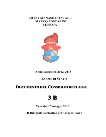 LICEO GINNASIO STATALE MARCO FOSCARINI VENEZIA Anno scolastico 2012-2013 ESAME DI STATO DOCUMENTO DEL CONSIGLIO DI CLASSE 3B Venezia, 15 maggio 2013 Il Dirigente Scolastico prof. Rocco Fiano 1 INDICE Parte prima – La classe III B Presentazione dell’Istituto Presentazione della classe Il percorso formativo Obiettivi Griglie di valutazione: Generale Voto condotta Prima prova Seconda prova Terza prova Prova orale Attività di informazione e preparazione all’esame Attività extracurricolari 3 4 7-9 10 11 12 13 13 14 15 16-17 Parte seconda – Relazioni e programmi disciplinari Italiano Latino Greco Storia Filosofia Inglese Fisica Matematica Scienze Storia dell’Arte Educazione Fisica Religione 19-24 25-30 31-32 33-36 37-39 40-43 44 45 46-48 49-51 52-53 54-55 SIMULAZIONI Simulazioni di Terza Prova 26 novembre 2012 03 maggio 2013 57-62 63-68 Simulazione di Prima Prova 09 maggio 2013 69-78 Firme docenti 80 2 PARTE PRIMA LA CLASSE III B 3 PRESENTAZIONE DELL’ISTITUTO Il Liceo Ginnasio statale “Marco Foscarini” è una delle più antiche istituzioni scolastiche pubbliche di tutta Italia. La sua origine risale infatti al 1807, per iniziativa napoleonica, e il 15 dicembre del 2007 ha festeggiato il suo bicentenario. Inizialmente funzionante nelle tre classi liceali, ma dotato di convitto per alloggiare gli studenti, fu arricchito nel 1851 dei corsi ginnasiali. Subito dopo l’annessione del Veneto al Regno d’Italia, nel 1867, assunse l’attuale denominazione (precedentemente si chiamava semplicemente Liceo Santa Caterina, dal nome dell’exconvento in cui è tuttora ospitato). Dalla fondazione a oggi ha sempre funzionato ininterrottamente, con una dimensione variabile fra le due e tre sezioni, che recentemente sono divenute quattro, ormai praticamente completate. Nel 1995 il Liceo è stato annesso all’omonimo Convitto Nazionale (le due realtà erano state separate dall’amministrazione austriaca nel 1850), recuperando così l’assetto originario. Al giorno d’oggi il “Foscarini” costituisce pertanto uno dei rari esempi italiani di struttura scolastica estesa su tutti i tre diversi livelli d’istruzione, riunendo scuola elementare, media e liceo. Il “Foscarini” ha conservato le caratteristiche tradizionali del piano di studi proprio del liceo classico, ritenuto un valido strumento sia per la preparazione degli studenti destinati alla prosecuzione degli studi universitari, sia per la possibilità offerta ai suoi allievi di elaborare una equilibrata cultura personale, tale da consentire non solo la conoscenza del passato, ma anche un accostamento critico alla complessità del presente. Naturalmente l’impianto del liceo classico, nella sua conformazione gentiliana, privilegia i saperi umanistici, a cui viene riservata la consueta cura nell’insegnamento. Una sottolineatura particolare, all’interno di questo impianto, è stata conferita allo strumento linguistico, privilegiato non solo come fondamento della comunicazione umana, ma ritenuto anche e soprattutto strumento di analisi, dominio e organizzazione del pensiero nei vari ambiti della comunicazione umana. La consapevolezza di ciò ha indotto il nostro liceo non solo a estendere, già da parecchi anni, lo studio della lingua straniera anche al triennio (seguendo un indirizzo che ormai caratterizza la grande maggioranza dei licei classici), ma anche a introdurre il supporto del lettore di lingua inglese al triennio e a svolgere attività di preparazione degli studenti agli esami di certificazione, sempre di lingua inglese. Oltre a ciò, sono presenti diversi corsi extracurricolari di lingua straniera. Quella linguistica, d’altra parte, non è l’unica sperimentazione che caratterizza la nostra scuola. Tutto l’insegnamento della matematica viene infatti impartito secondo i programmi e il monte-ore previsti dal Piano Nazionale Informatica per i licei classici, e si affianca una terza sperimentazione, consistente nell’estensione a tutto il corso di studi e nel potenziamento dell’insegnamento di storia dell’arte. Peculiarità del “Foscarini”, peraltro, è sempre stata, fin dalla sua fondazione, una particolare attenzione agli insegnamenti dell’area scientifica, proposti innanzitutto nella loro valenza culturale e formativa. Se la storia dell’istituto è stata contrassegnata dalla presenza di insegnanti di notevole spessore, anche negli anni più recenti motivo di notevole soddisfazione è stato dato dai buoni, spesso ottimi risultati che i nostri studenti hanno conseguito nei loro studi presso facoltà scientifiche. Se fino a qualche anno fa l’utenza del liceo proveniva quasi interamente dal centro storico veneziano e dal Lido, nel corso degli ultimi anni il bacino della scuola si è decisamente allargato, con un consistente e crescente numero di studenti di Mestre e della terraferma veneziana, alcuni dei quali risiedono anche in comuni non collocati nell’immediata cintura della conurbazione mestrina, ma a una certa distanza da essa e compiono quindi un percorso casa-scuola non breve. La crescita degli iscritti non residenti nell’ambito strettamente lagunare testimonia lo sforzo che la nostra scuola effettua per garantire una offerta formativa di qualità e attenta alle esigenze dell’utenza. Bisogna comunque sottolineare, in generale, che, trattandosi di un liceo classico di tradizione, la composizione degli iscritti inevitabilmente riflette in una certa misura un processo di selezione, o meglio autoselezione, verificatosi a monte, dato che quasi sempre gli studenti che scelgono la nostra scuola sono fortemente motivati da un percorso scolastico che ha già dato buoni risultati. Spesso, inoltre, nella scelta dell’istituto giocano tradizioni familiari. Anche questo dà ragione della buona stabilità del corpo studentesco, in cui il numero di insuccessi e abbandoni risulta decisamente limitato. L’offerta formativa del “Foscarini” si completa con la proposizione agli studenti di una serie d