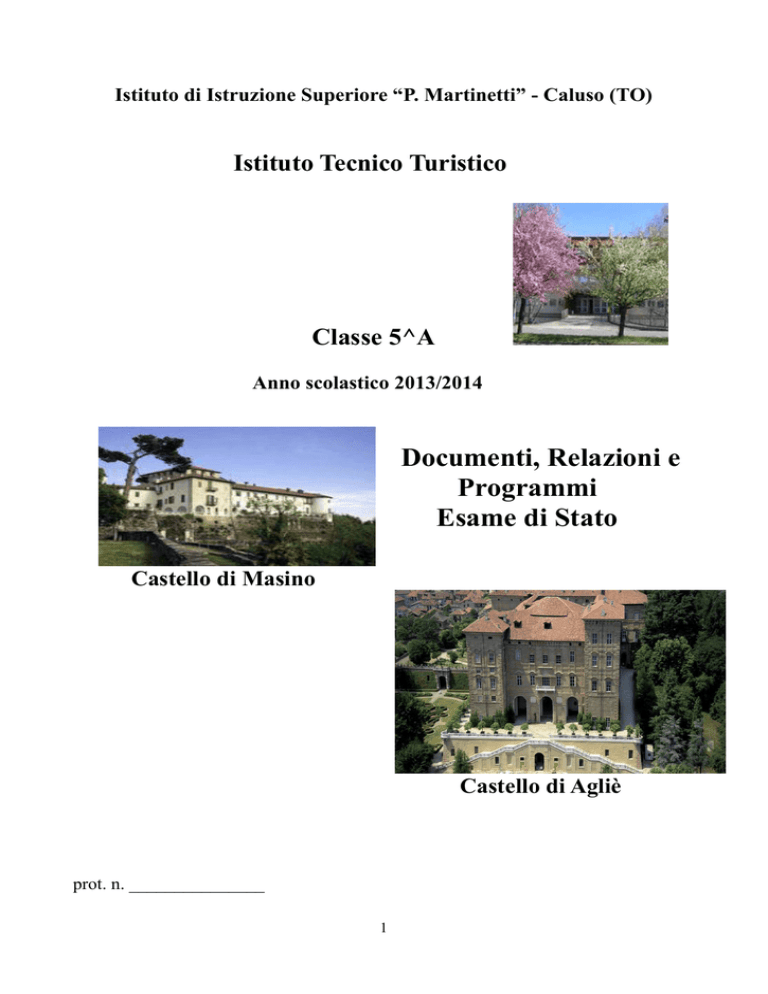 Istituto di Istruzione Superiore “P. Martinetti” - Caluso (TO) Istituto Tecnico Turistico Classe 5^A Anno scolastico 2013/2014 Documenti, Relazioni e Programmi Esame di Stato Castello di Masino Castello di Agliè prot. n. _______________ 1 INDICE Elenco docenti e firme Elenco studenti della classe Profilo dell'indirizzo turistico Dati storici della classe Profilo della classe Elenco tirocini svolti Attività e Progetti Elenco Tesine pag. 3 pag. 4 pag. 5 pag. 7 pag. 8 pag. 10 pag. 13 pag. 23 Relazioni e programmi disciplinari Diritto e Legislazione Turistica Discipline Turistiche e Aziendali Educazione Fisica Francese Geografia Turistica Inglese Italiano e Storia Matematica Storia dell’Arte pag. 24 pag. 31 pag. 36 pag. 40 pag. 46 pag. 47 pag. 49 pag. 57 pag. 59 ALLEGATI Esempi di terze prove Griglie di correzione delle prove pag.64 pag.71 2 Istituto di Istruzione Superiore “P.Martinetti” – Caluso (TO) Istituto Tecnico Turistico Anno Scolastico 2013/2014 Docente Disciplina Firma De Castro Diritto e Legislazione Tur. Marchetto Discipline Turistiche e Az. Gabriele Educazione Fisica Crovella Francese Manuzzi Conversatrice Francese Russotto Geografia Turistica Rossi Inglese Meehan Conversatrice Inglese Cinquanta Italiano e Storia Prevignano Matematica Alegre Palazon Spagnolo Vargas Conversatrice Spagnolo D’Amico Storia dell’Arte 3 Istituto di Istruzione Superiore “P. Martinetti” di Caluso (TO) Istituto Tecnico Turistico Classe 5^A Anno scolastico 2013/2014 ELENCO ALUNNI N. 1 2 3 4 5 6 7 8 9 10 11 12 13 14 15 16 17 18 19 20 21 22 23 24 Studente Actis Giorgetto Serena Actis Perino Alessia Audero Silvia Belcastro Alessia Bena Giorgio Bonetto Valeria Casi Asia Corrotto Alessandro Della Guardia Laura Enriello Davide Ettanji Hamza Farardo Ilaria Giuliano Deborah Ierardi Sarah Jeva Riccardo Lombardo Gianluca Magliocca Federico Natale Francesca Oi Elisabetta Pedrini Giulia Pippia Lisa Venuti Giulia Villari Federica Zanolo Silvia 4 1.Profilo dell’indirizzo INDIRIZZO TURISTICO - PROGETTO ASSISTITO I.T.E.R. Il settore turistico coinvolge un numero crescente di persone e, particolarmente in Italia, rappresenta un’attività economica e culturale di tutto rilievo. E’ quindi necessario, per il suo funzionamento ed il suo corretto sviluppo, che si possa contare su personale preparato non solo a livello esecutivo, ma anche in compiti di coordinamento e promozione intermedia: esattamente il tipo di professionalità che può essere fornita da un Istituto Tecnico. Il settore turistico possiede specificità operative e concettuali sue proprie; ha quindi una forte connotazione relazionale e culturale che non consente di demandare la preparazione relativa ad un generico Istituto Tecnico di indirizzo aziendale, con cui pure può avere in comune certi aspetti strumentali. Occorre invece pensare ad uno specifico canale formativo, quale l’Istituto tecnico per il Turismo, e individuare quindi le figure professionali turistiche ad esso riconducibili e le competenze necessarie a sostenerle. Una breve riflessione sulla natura e la struttura dell’attività turistica pone immediatamente in evidenza che si tratta di un settore complesso, cui afferiscono numerose e varie attività e competenze, alcune relative a prestazioni di tipo materiale (trasporto, alloggio, ristorazione…), altri a servizi rivolti alle persone (molto più articolati). Mentre è evidente che le prestazioni del primo tipo richiamano la competenza di altri settori formativi (in primo luogo quello degli istituti professionali alberghieri), l’ambito dei “servizi rivolti alle persone”, cioè tutto quel complesso insieme di attività strutturate per rispondere alle aspettative di coloro che si mettono in viaggio, interessa invece gli Istituti Tecnici per il Turismo. Le attività di questo tipo sono diverse fra loro come diverse sono le motivazioni che spingono milioni di individui ad allontanarsi dalla abituale dimora per trascorrere altrove parte del proprio tempo libero: esse vanno dagli interessi culturali (storici, artistici, archeologici) all’amore per la natura e per i paesaggi insoliti; dal desiderio di pura evasione a quello di avventura; dalla curiosità gastronomica all’impegno sportivo. Ciò che in tanta diversità costituisce un fattore unificante è la necessità, per il turista, di trovare sul posto chi possa farsi mediatore fra lui ed il luogo in cui è venuto e che in genere non conosce: mediatore di informazioni, ma anche di assistenza, di guida, di consigli, di motivazioni, di svaghi. In altre parole un “tecnico della vacanza”, qualcuno che per mestiere sappia comprendere, soddisfare, prevenire e – perché no? – far nascere i bisogni e le curiosità dei viaggiatori e che, al tempo stesso, sia in possesso delle capacità professionali ed organizzative per rispondere a tali domande. Si può dunque affermare che un istituto Tecnico per il Turismo ha un suo spazio formativo ed anzi una sua necessità nel panorama dell’Istruzione secondaria di un Paese come l’Italia, che fonda in misura non piccola la propria economia sull’attività turistica. 5 Ma l’assetto del canale formativo per la professionalità turistica pensato agli inizi degli anni sessanta non poteva più rispondere nel migliore dei modi alle nuove esigenze del mercato. Molte cose sono cambiate negli ultimi quarant’anni, sia nella struttura della società che nelle abitudini di viaggio e di turismo. Agli aspetti hardware dell’organizzazione (trasporto, ricettività ristorazione) si sono affiancati gli aspetti software (animazione, assistenza, servizi vari), che rappresentano poi i settori a più alto valore aggiunto del turismo. Un moderno Istituto Tecnico per il Turismo deve quindi orientarsi in questa direzione, mirando a una riqualificazione culturale realmente innovativa e liberandosi delle scorie di una formazione di tipo addestrativo, rivolta a compiti sempre meno significativi e sempre più delegati a figure professionali
