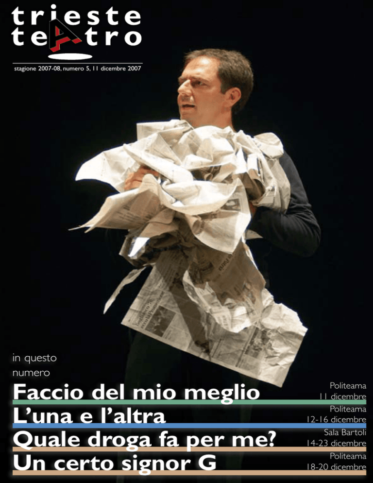 stagione 2007-08, numero 5, 11 dicembre 2007 in questo numero Faccio del mio meglio L’una e l’altra Quale droga fa per me? Un certo signor G Politeama 11 dicembre Politeama 12-16 dicembre Sala Bartoli 14-23 dicembre Politeama 18-20 dicembre www.regione.fvg.it Moni Ovadia, attore teatrale fare conoscenza Filo diretto con i cittadini Governo dell’ascolto I cittadini hanno a disposizione nuove opportunità di dialogo con la Regione: possono fare direttamente on line segnalazioni, proposte, reclami e parlare in diretta con il presidente e gli assessori regionali su temi di attualità attraverso un innovativo sistema di video–chat. Ascoltare per stabilire una relazione fra amministratori e cittadini e orientare l’azione della Regione: alla comunità regionale vengono proposte a cadenza regolare domande su temi diversi di interesse per la collettività attraverso questionari d’opinione on line. I risultati sono resi pubblici sul sito al termine di ciascuna rilevazione. Esprimere e ascoltare le opinioni dei cittadini aiuta a realizzare una pubblica amministrazione sempre più moderna, a misura di cittadino. Accesso E inoltre… personalizzato • Nuovi servizi alle informazioni • Informazioni chiare e Sul sito della Regione Friuli Venezia Giulia ci sono nuovi strumenti al servizio dei cittadini, che possono iscriversi a “Avvisami” (fornisce gratuitamente informazioni via sms e via e-mail); podcast (registrazioni audio/video); feed RSS (news e approfondimenti costantemente aggiornati). multilingue • Trasparenza sulle attività dell’Ente • Valorizzazione dei punti di forza del territorio regionale www.regione.fvg.it www.fvg.tv Periodico del Teatro Stabile del Friuli-Venezia Giulia redazione Viale XX Settembre, 45 34126 Trieste tel. 040-3593511 fax 040-3593555 www.ilrossetti.it [email protected] Martedì 11 dicembre Anno XVI - numero 155 11 dicembre 2007 Aut. Tribunale di Trieste n° 846 del 30.7.1992 stampa Stella Arti Grafiche,Trieste direttore responsabile Stefano Curti redazione Ilaria Lucari, Ivis Lasagna 21.00 Sala Bartoli, turno libero 8.30 Biglietterie Prenotazioni abbonamenti stelle per “I Cosacchi del Don”, “Lo Schiaccianoci”, “I Gormiti”, “Instinto - tango y musical” 20.30 Politeama Rossetti, fuori abb. Mercoledì 19 dicembre 20.30 Politeama Rossetti, turno libero Un certo Signor G con Neri Marcorè 21.00 Sala Bartoli, turno libero Quale droga fa per me? con Anna Galiena Quale droga fa per me? con Anna Galiena - TUTTO ESAURITO - Sabato 15 dicembre Faccio del mio meglio con Giorgio Panariello Mercoledì 12 dicembre 20.30 Politeama Rossetti, turno PRI 21.00 Politeama Rossetti, turno libero Quale droga fa per me? con Anna Galiena 20.30 Politeama Rossetti, turno C L’una e l’altra di Botho Strauss 21.00 Sala Bartoli, turno libero Quale droga fa per me? con Anna Galiena Domenica 16 dicembre 16.00 Politeama Rossetti, turno D L’una e l’altra di Botho Strauss 17.00 Sala Bartoli, turno libero Quale droga fa per me? con Anna Galiena Giovedì 20 dicembre 17.00 Café Rossetti, ingresso libero Presentazione del libro “La forma delle forme. Il teatro di Italo Svevo” di Cristina Benussi. Interverranno Antonio Calenda e Giuseppe O. Longo 19.00 Sala Bartoli, turno libero Quale droga fa per me? con Anna Galiena 20.30 Politeama Rossetti, turno libero Un certo Signor G con Neri Marcorè Venerdì 21 dicembre 20.30 Politeama Rossetti Lunedì 17 dicembre L’una e l’altra di Botho Strauss Giovedì 13 dicembre 8.30 Biglietterie Inizio prevendita biglietti per “I Cosacchi del Don”, “Lo Schiaccianoci”, “I Gormiti”, “Instinto - tango y musical” 16.00 Politeama Rossetti, turno E 20.30 Politeama Rossetti, turno A L’una e l’altra di Botho Strauss 20.30 Politeama Rossetti Che spettacolo la televisione Serata d’onore per il trentesimo anniversario di Telequattro Martedì 18 dicembre 20.30 Politeama Rossetti, turno AP Un cuore alpino per Natale 21.00 Sala Bartoli, turno libero Quale droga fa per me? con Anna Galiena Sabato 22 dicembre Venerdì 14 dicembre 20.30 Politeama Rossetti, turno B L’una e l’altra di Botho Strauss Un certo Signor G con Neri Marcorè 20.30 Politeama Rossetti, turno DANZA I Cosacchi del Don con il Balletto Statale Russo 21.00 Sala Bartoli, turno libero Quale droga fa per me? con Anna Galiena Faccio del mio meglio patico Giorgio Panariello, che questa volta, ritorna al Politeama Rossetti – dove ha già recitato nel classico repertorio di prosa, nel 2003, quale protagonista del molièreiano Il borghese gentiluomo – con un vero e proprio one man show, intitolato Faccio del mio meglio. L’appuntamento con il comico toscano è straordinario: unica occasione per applaudirlo in uno spettacolo che possiede la verve del varietà, l’ironia graffiante tipica di Panariello, e anche un po’ di poesia. Il titolo scelto per lo spettacolo non è affatto casuale: Giorgio Panariello vi propone proprio “il suo meglio”. I personaggi più amati, i monologhi più riusciti nella sua carriera televisiva e teatrale si succedono a ritmo incalzante in una serata che appare quasi un greatest hits dell’artista. In questa sfilata di personaggi, verranno toccati gli argomenti più diversi: dalla cronaca, all’attualità, alla satira del costume. È lo stesso Panariello a spiegarcelo «Di cosa parlerò? – svela infatti nelle sue note allo spettacolo – Di come è cambiato l’essere umano, della sua evoluzione sia al maschile che al femminile; dei paradossi della incomunicabilità nell’era della comunicazione; delle mode, che rincorriamo ad ogni costo, nell’era dell’apparire per la paura di non essere; dell’amore, dell’odio, dei bambini, Un pianoforte in scena, un allestimento minimale con un grande schermo al centro... Da lì irrompono in palcoscenico Renato Zero, Merigo, Naomo, Mario il bagnino della Versilia, l’anziano Raperino… È un vero fuoco d’artificio di volti conosciuti e divertimento. A rendere possibili qu