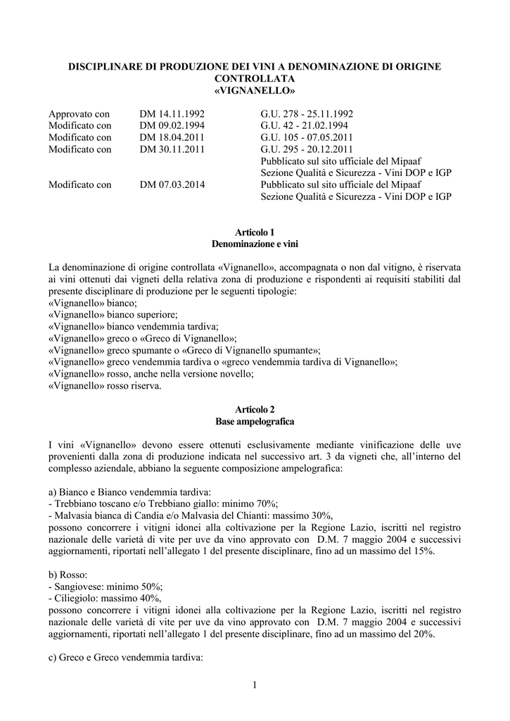 DISCIPLINARE DI PRODUZIONE DEI VINI A DENOMINAZIONE DI ORIGINE CONTROLLATA «VIGNANELLO» Approvato con Modificato con Modificato con Modificato con DM 14.11.1992 DM 09.02.1994 DM 18.04.2011 DM 30.11.2011 Modificato con DM 07.03.2014 G.U. 278 - 25.11.1992 G.U. 42 - 21.02.1994 G.U. 105 - 07.05.2011 G.U. 295 - 20.12.2011 Pubblicato sul sito ufficiale del Mipaaf Sezione Qualità e Sicurezza - Vini DOP e IGP Pubblicato sul sito ufficiale del Mipaaf Sezione Qualità e Sicurezza - Vini DOP e IGP Articolo 1 Denominazione e vini La denominazione di origine controllata «Vignanello», accompagnata o non dal vitigno, è riservata ai vini ottenuti dai vigneti della relativa zona di produzione e rispondenti ai requisiti stabiliti dal presente disciplinare di produzione per le seguenti tipologie: «Vignanello» bianco; «Vignanello» bianco superiore; «Vignanello» bianco vendemmia tardiva; «Vignanello» greco o «Greco di Vignanello»; «Vignanello» greco spumante o «Greco di Vignanello spumante»; «Vignanello» greco vendemmia tardiva o «greco vendemmia tardiva di Vignanello»; «Vignanello» rosso, anche nella versione novello; «Vignanello» rosso riserva. Articolo 2 Base ampelografica I vini «Vignanello» devono essere ottenuti esclusivamente mediante vinificazione delle uve provenienti dalla zona di produzione indicata nel successivo art. 3 da vigneti che, all’interno del complesso aziendale, abbiano la seguente composizione ampelografica: a) Bianco e Bianco vendemmia tardiva: - Trebbiano toscano e/o Trebbiano giallo: minimo 70%; - Malvasia bianca di Candia e/o Malvasia del Chianti: massimo 30%, possono concorrere i vitigni idonei alla coltivazione per la Regione Lazio, iscritti nel registro nazionale delle varietà di vite per uve da vino approvato con D.M. 7 maggio 2004 e successivi aggiornamenti, riportati nell’allegato 1 del presente disciplinare, fino ad un massimo del 15%. b) Rosso: - Sangiovese: minimo 50%; - Ciliegiolo: massimo 40%, possono concorrere i vitigni idonei alla coltivazione per la Regione Lazio, iscritti nel registro nazionale delle varietà di vite per uve da vino approvato con D.M. 7 maggio 2004 e successivi aggiornamenti, riportati nell’allegato 1 del presente disciplinare, fino ad un massimo del 20%. c) Greco e Greco vendemmia tardiva: 1 - Greco: minimo 85%, - possono concorrere altri vitigni a bacca bianca idonei alla coltivazione per la Regione Lazio, fino ad un massimo del 15%. La base ampelografica dei vigneti già iscritti nello schedario viticolo della D.O.C. dei vini «Vignanello» deve essere adeguata entro la decima vendemmia riferita alla data di approvazione del disciplinare di produzione. Sino alla scadenza, indicata nel precedente comma, i vigneti di cui sopra, iscritti a titolo transitorio allo schedario viticolo della denominazione di origine controllata dei vini «Vignanello», potranno usufruire della denominazione medesima. Articolo 3 Zona di produzione delle uve La zona di produzione dei vini D.O.C. «Vignanello» comprende per intero il territorio dei comuni di: Vignanello, Vasanello, Bassano in Teverina, Corchiano e parte dei territori di Soriano nel Cimino, Fabrica di Roma e Gallese, tutti in provincia di Viterbo. Tale zona è così delimitata: partendo dal confine comunale di Vignanello, in via San Rocco, la linea di delimitazione segue detto confine verso sud sino all’incrocio del confine comunale di Fabrica di Roma, percorre questo confine verso ovest, ed all’incrocio della strada provinciale Valleranese prosegue su questa fino all’interno del centro abitato di Fabrica di Roma, da qui segue per viale degli Eroi, via IV Novembre, fino ad incrociare la ferrovia dello Stato; seguendo detta ferrovia verso nord la linea di delimitazione si incrocia con la ferrovia Roma Nord, segue detta ferrovia verso sud sino alla stazione di Cerchiano, proseguendo su via della Stazione, via Roma, via Civitacastellana, fino ad incrociare il rio Fratta che lo percorre verso est sino ad incontrare il confine comunale sud di Gallese; prosegue per detto confine sempre verso est ed all’incrocio della strada statale di Magliano Sabina n. 315 la segue verso nord, ed incrociando il confine comunale di Gallese lo segue verso ovest, si congiunge con il confine comunale di Vasanello seguendolo verso nord e continuando sempre verso nord sul confine di Bassano in Teverina fino ad incrociare la strada statale Ortana n. 204, prosegue su questa verso ovest fino all’incrocio della strada Madonna di Loreto seguendola verso sud fino all’incrocio della ferrovia Roma Nord, prosegue su questa ferrovia verso Vignanello fino al fosso della Guizza percorrendolo verso est fino ad incontrare il confine comunale di Vignanello, il quale verso sud si congiunge al punto di partenza. Articolo 4 Norme per la viticoltura Le condizioni ambientali e colturali dei vigneti destinati alla produzione dei vini «Vignanello» dovranno essere quelle tradizionali della zona e comunque atte a conferire alle uve, al mosto ed al vino derivato le specifiche caratteristiche di qualità. Saranno pertanto da considerarsi idonei ai fini dell’iscrizione nello schedario viticolo unicamente quelli ubicati in terreni collinari calcarei o di origine vulcanica. Sono da escludere i terreni ubicati al di sotto dei 140 metri di altitudine s.l.m. I sesti di impianto, le forme di allevamento, i sistemi di potatura e le tecniche colturali devono essere quelli tradizionalmente usati o comunque atti a non modificare le caratteristiche delle uve e dei vini nonché a garantire la qualità dei prodotti conseguibili. È vietata ogni pratica di forzatura. E’ consentita l’irrigazione di soccorso. La resa massima di uva per ettaro di coltura specializzata non deve essere superiore alle: - 14 tonnellate per la tipologia «bianco», - 7 tonnellate per la tipologia «bianco» vendemmia tardiva, parzialmente appassita, 2 - 13 tonnellate per la tipologia «rosso», - 11 tonnellate per il «Greco»; - 7 tonnellate